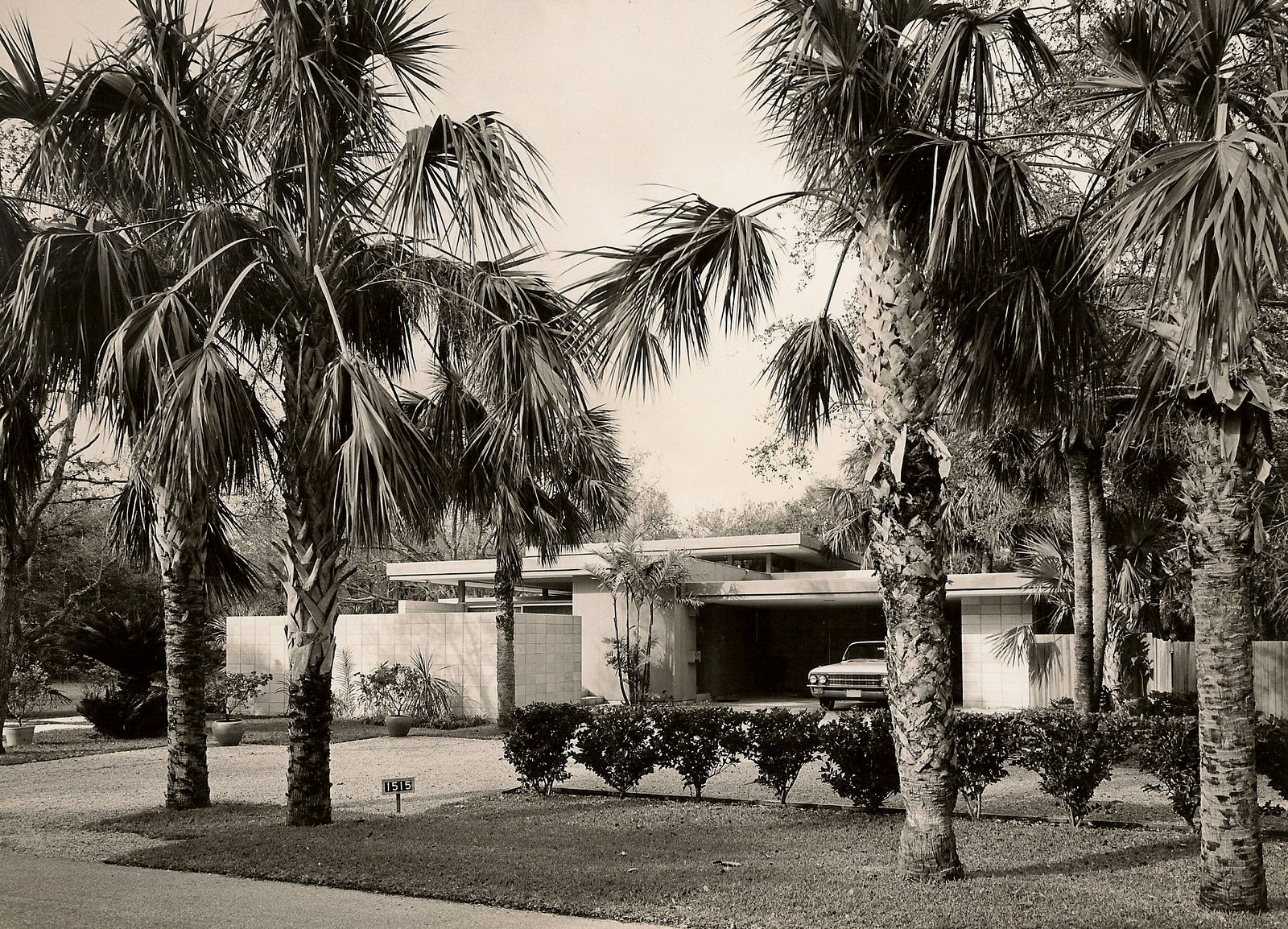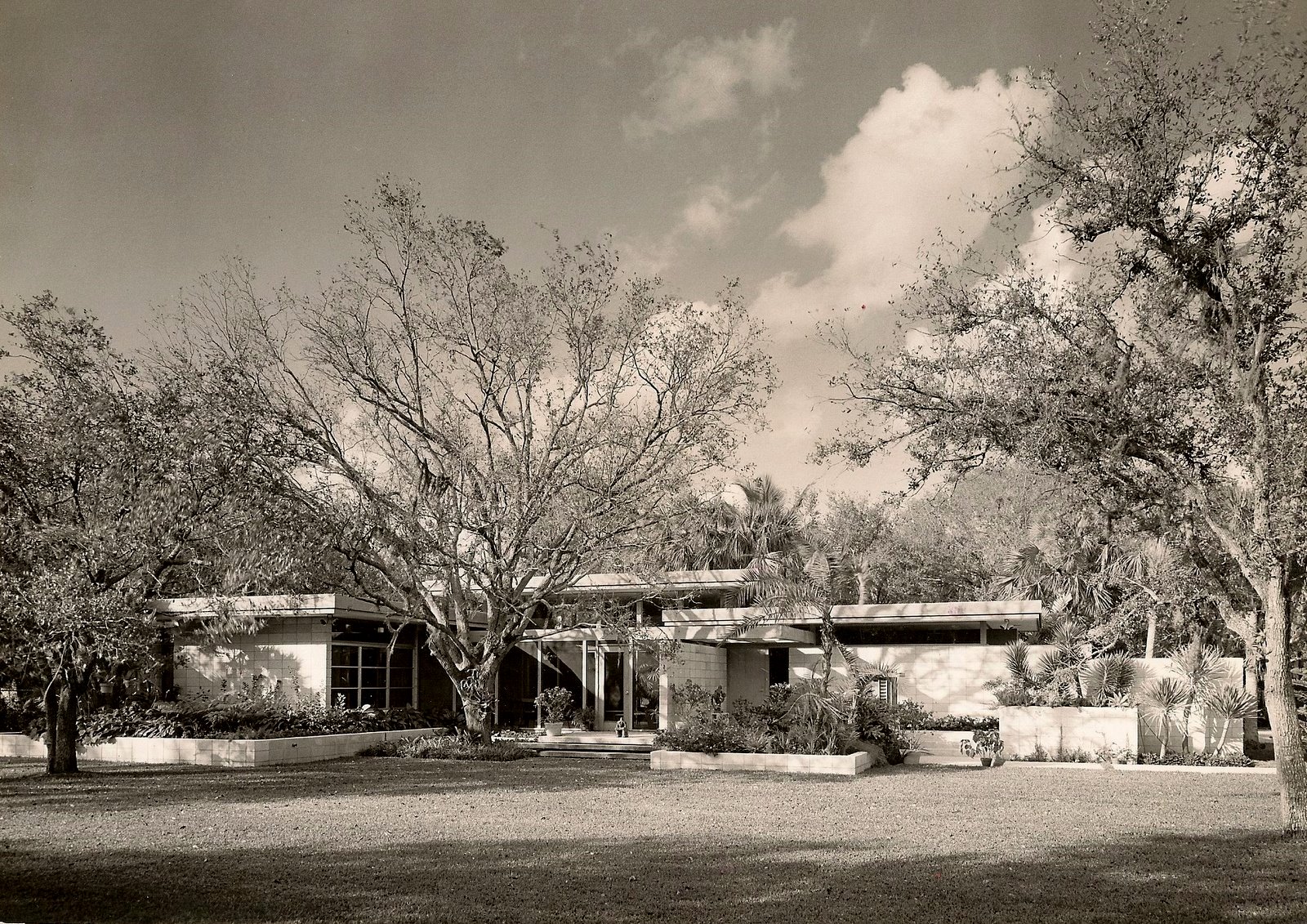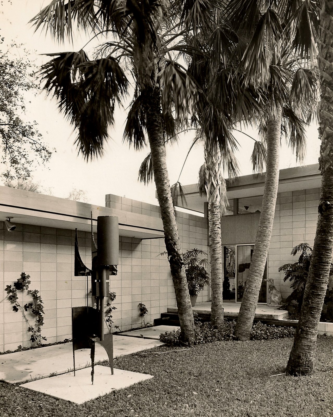 A small house on a large lot with numerous Oaks and Sable Palms. An older couple with an important art collection which included French Impressionists and works by Mondrian and Calder, who were also personal friends.(valuable pieces were replaced for photographs) A raised concrete slab over ventilated crawl space provides humidity control and is expressed by low planters extending outward.