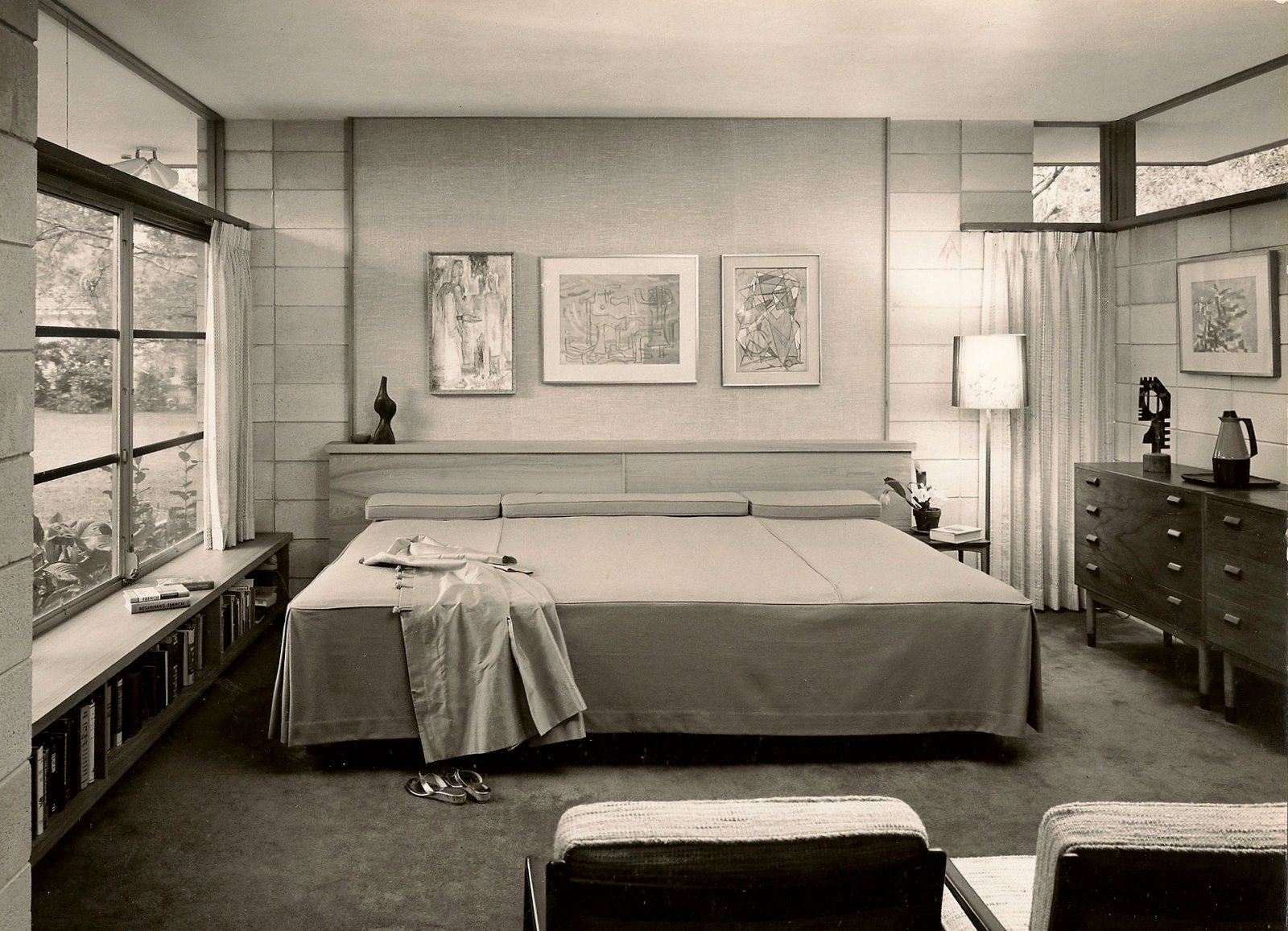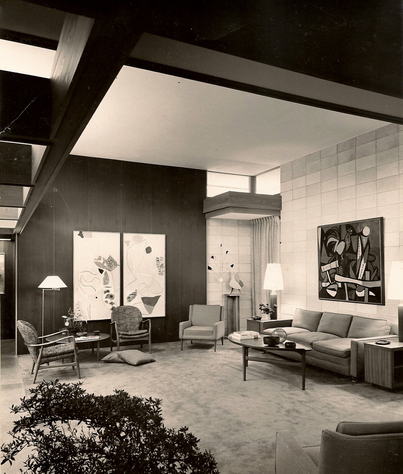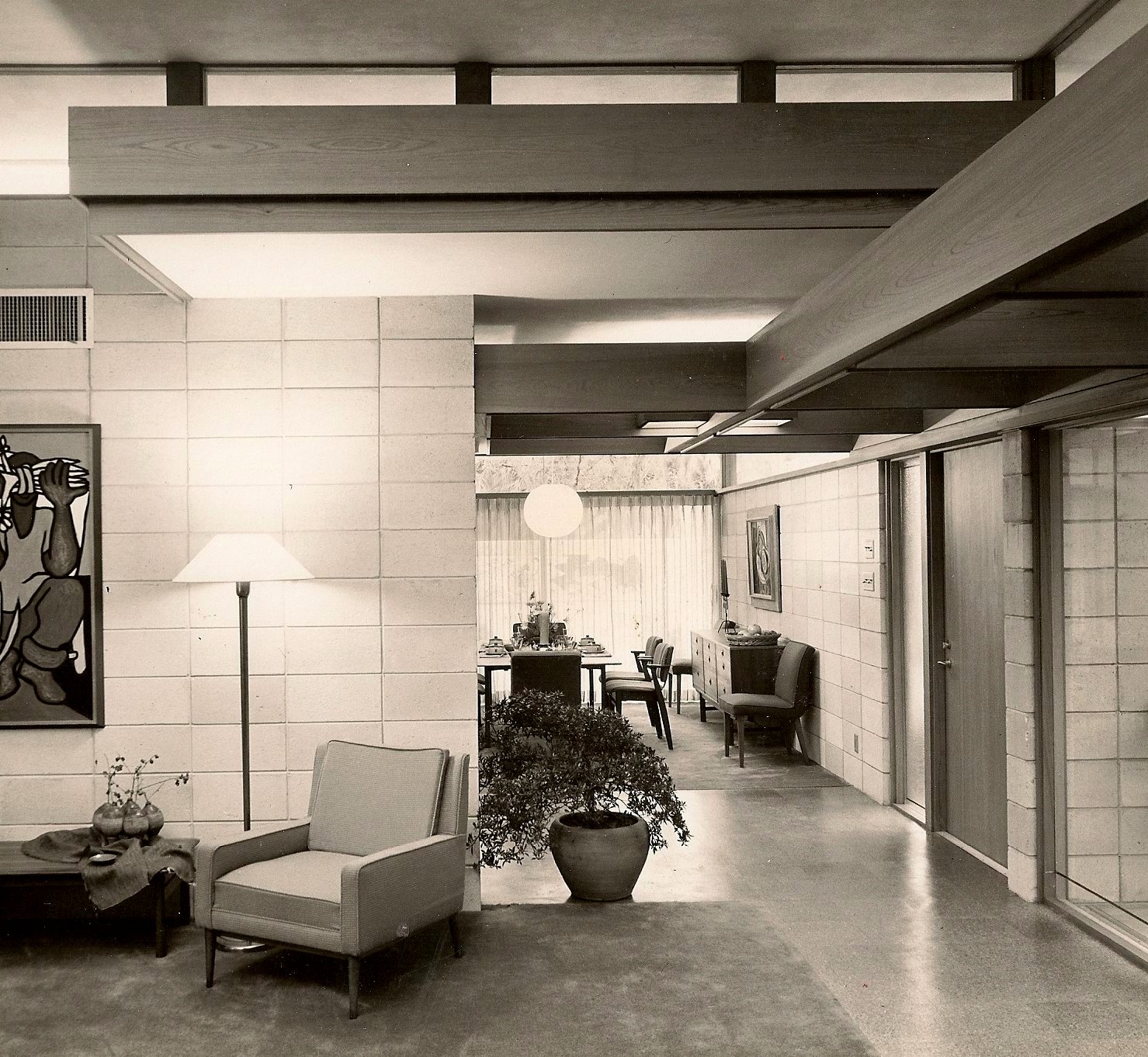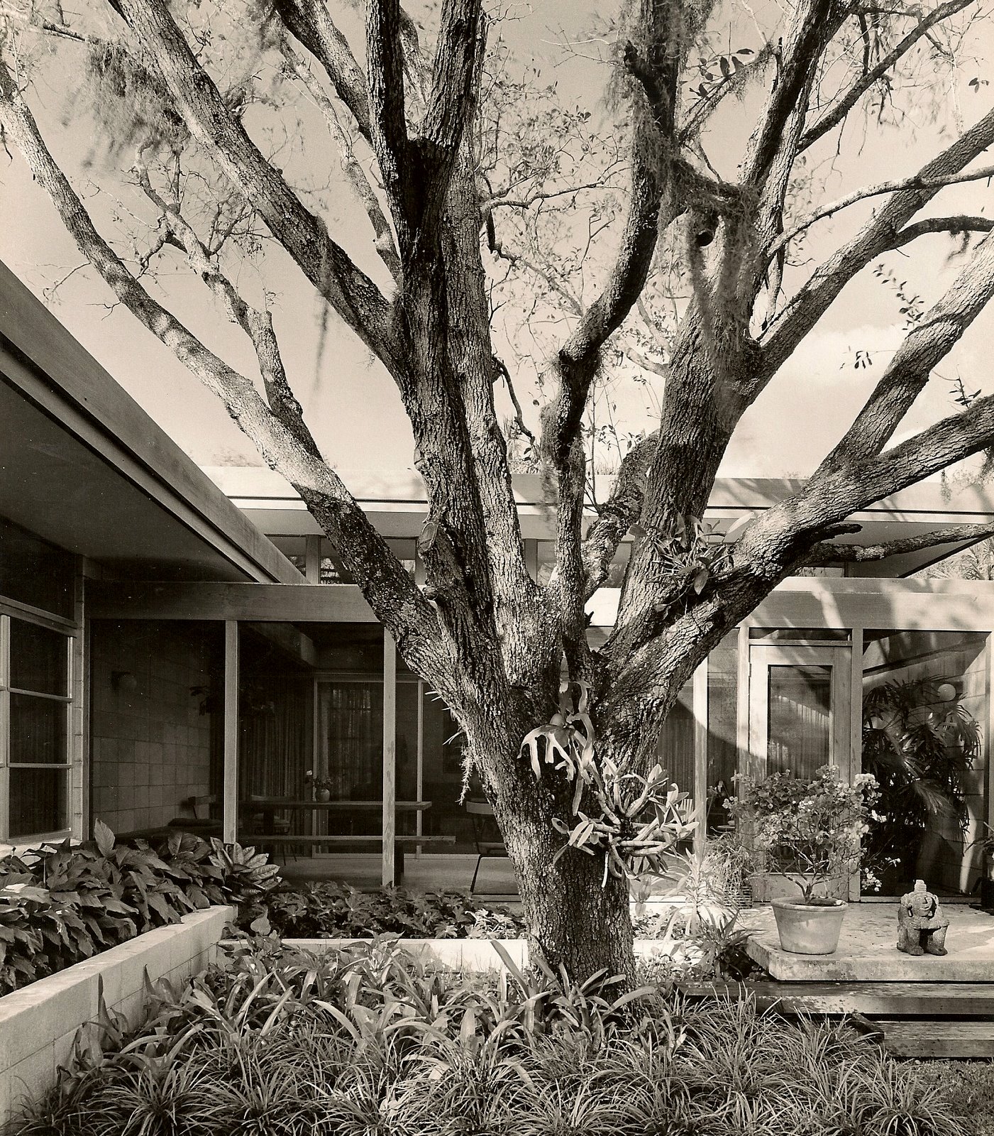 A small house on a large lot with numerous Oaks and Sable Palms. An older couple with an important art collection which included French Impressionists and works by Mondrian and Calder, who were also personal friends.(valuable pieces were replaced for photographs) A raised concrete slab over ventilated crawl space provides humidity control and is expressed by low planters extending outward.
