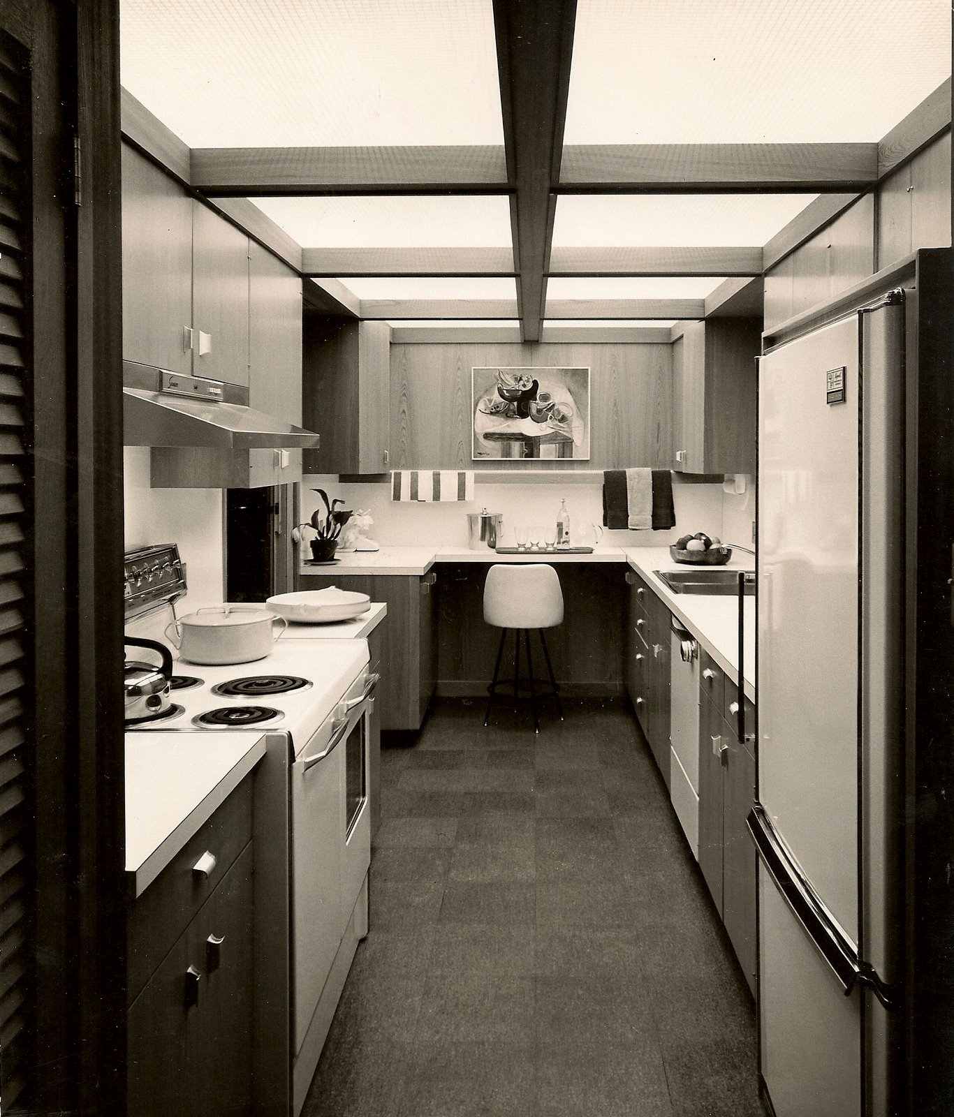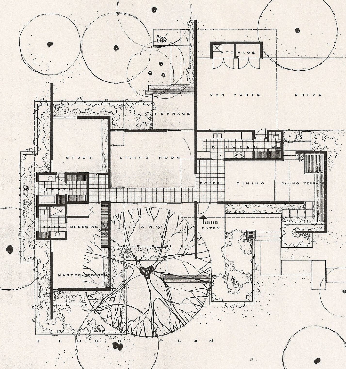 Space is defined by planes, both horizontal and vertical. A lower trellis defines the cork circulation path below and extends into the Kitchen and Baths as luminous ceilings and hovers over Entrance and Screened Terrace. Materials are limited to exposed concrete block, Cypress, Mahogany panels and plaster/stucco.