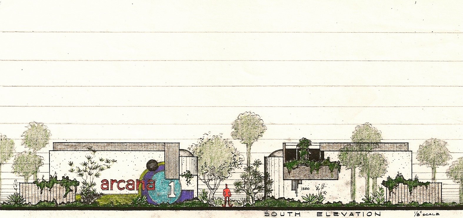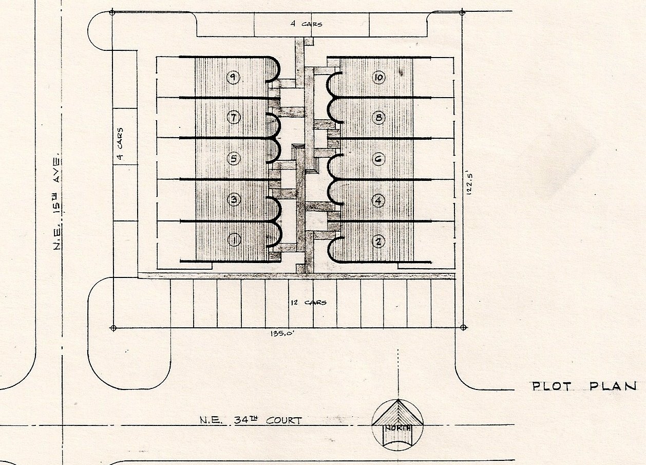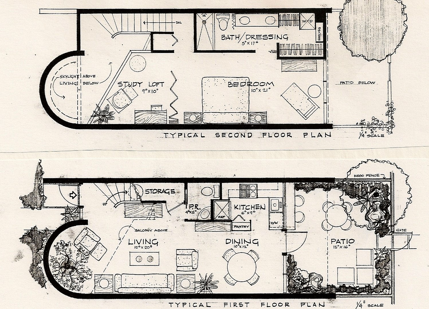The units were two stories with the upper level set back from the front, creating a two story section of the living room. A half circle domed skylight would bring sunlight into both the living and bedroom spaces. An entry garden walkway accessed all units, which had excellent privacy from the garden, and each had a fenced private patio. The roof and the second floor were heavy timber beams and decking.