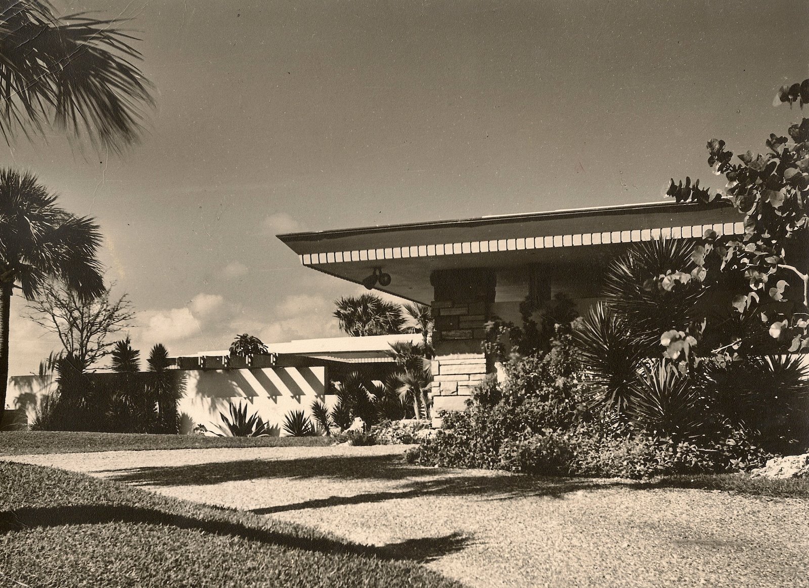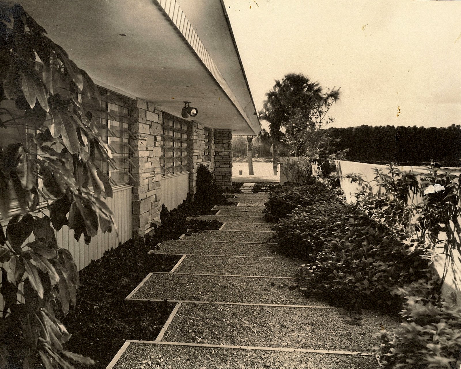 This was my first significant house project…….the clients were friends with two children. The site was on the Intracoastal Waterway. Low sloping roofs were reflected on the interiors as sloping gable ceilings, terminating in lighting coves. Stucco walls on the street front enclosed an extended Entry Garden. Walls were Cypress or stone inside and out.