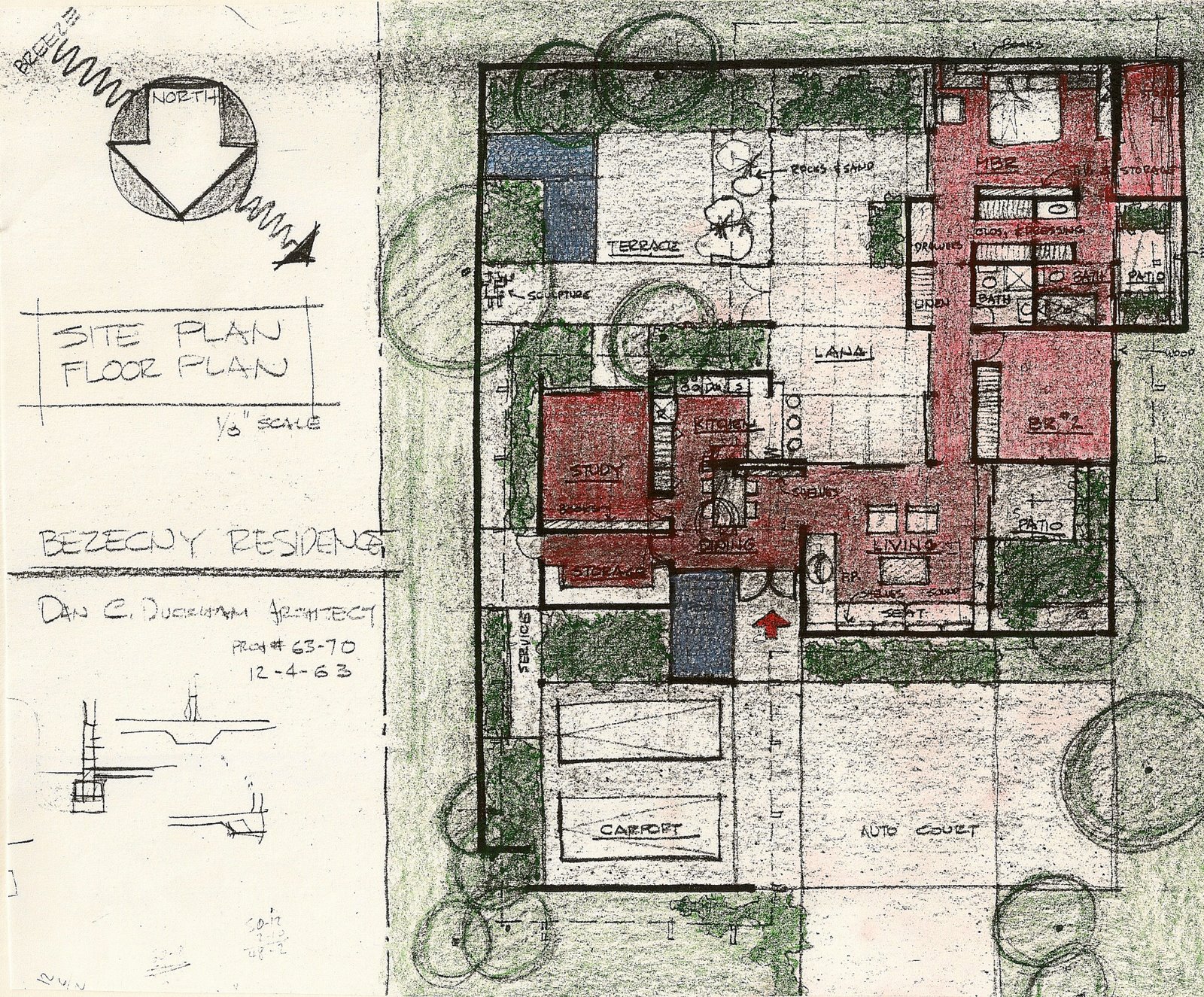 The structure was my old familiar 6' module post and beam wood roof all at one level. I don't remember ever drawing a formal preliminary floor plan, and working drawings proceeded directly from the rough sketch.