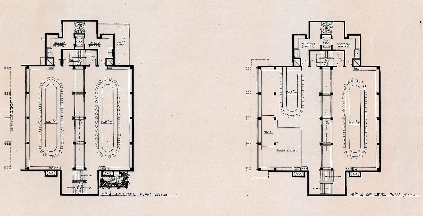 The design was the same basic idea as the prototype but larger, with two additional levels of bar area, and a two level concrete parking structure.