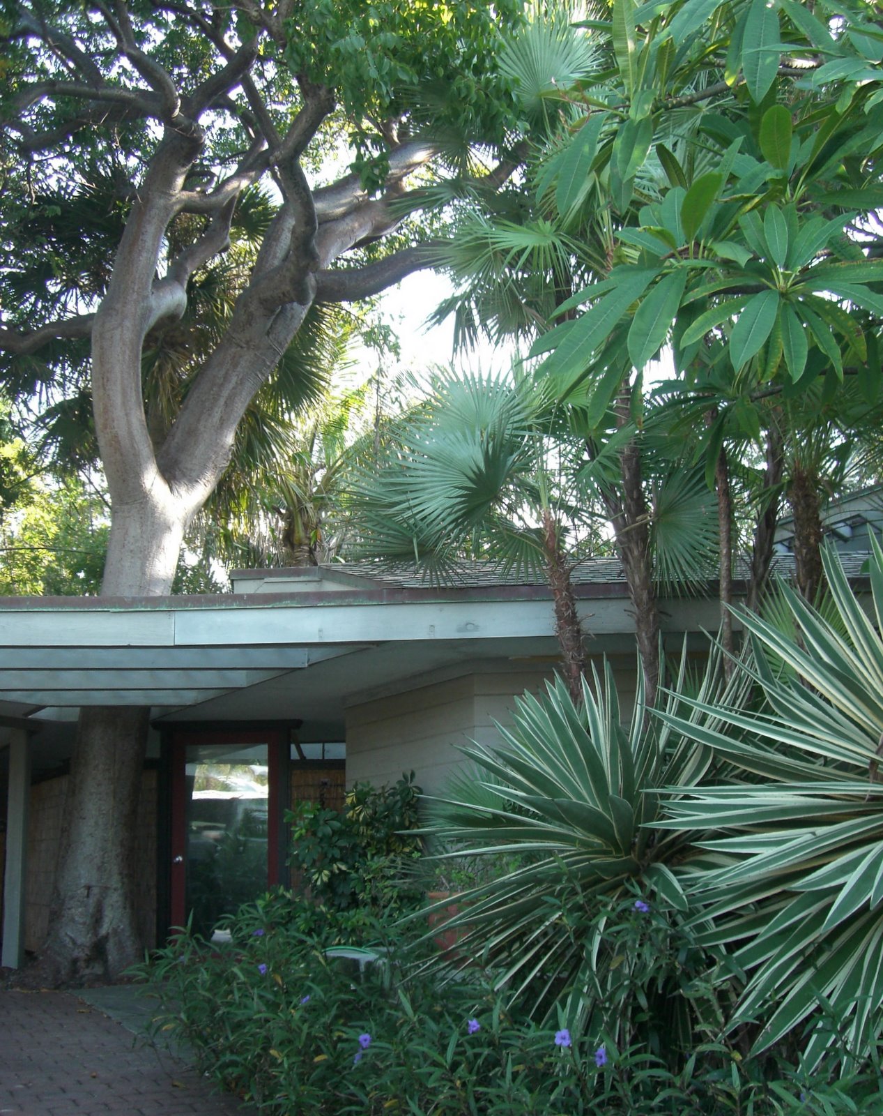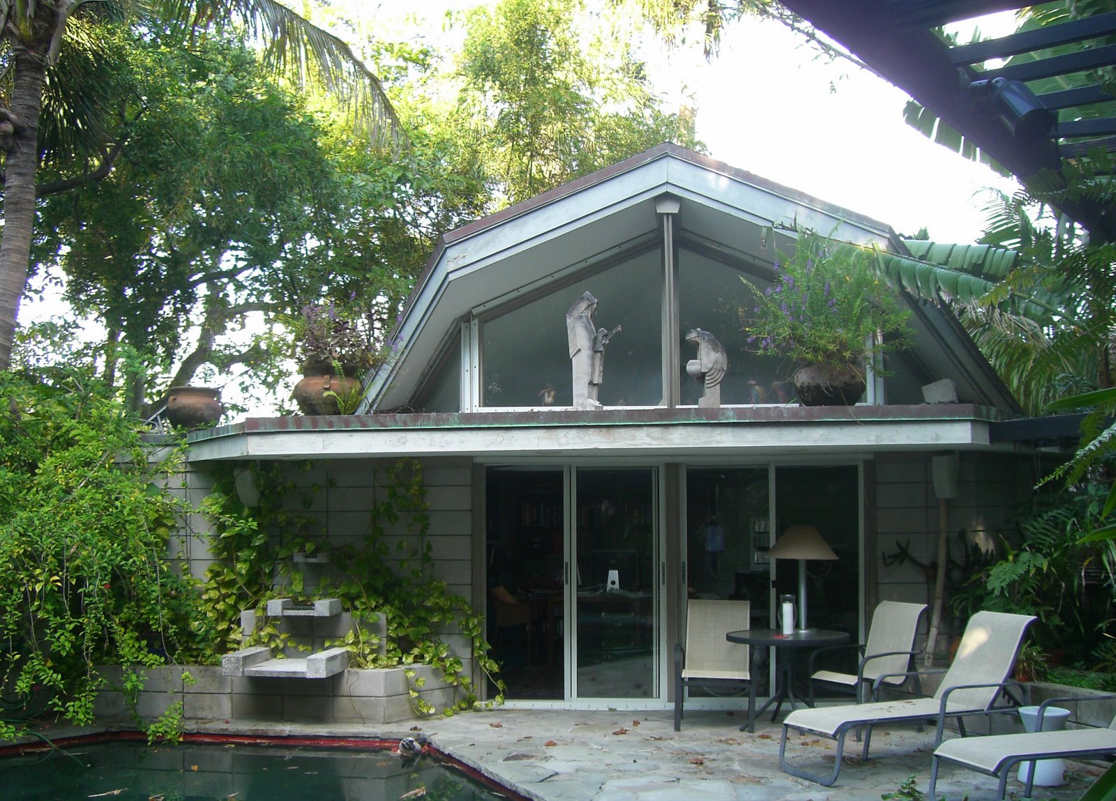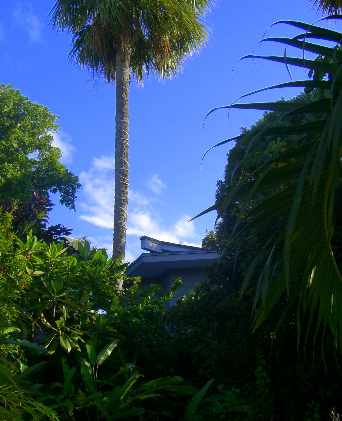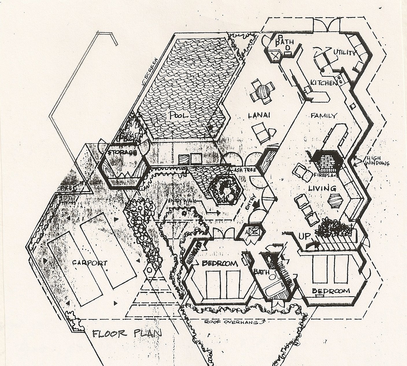 The site was close to the ocean and was heavy with existing trees, including a major Tropical Ash tree located close to the center of the property. The hexagonal floor plan evolved from the desire for graceful movement around the Ash tree and though out the house, as well as fulfilling the wish for a radical change. The plan angles and meanders around the trees and opens out to a covered Lanai and screened swimming pool. The Master Bedroom is on the upper level and opens to a roof deck.