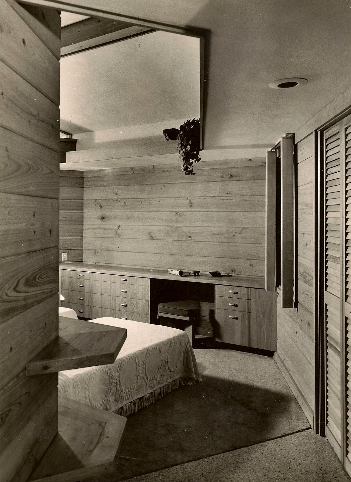 Roofs are flat with low sloping gables over all bedrooms. Materials are Cypress horizontal siding, plaster ceilings and board formed natural concrete. Furniture is almost all built in.