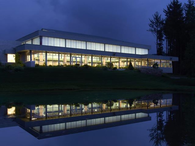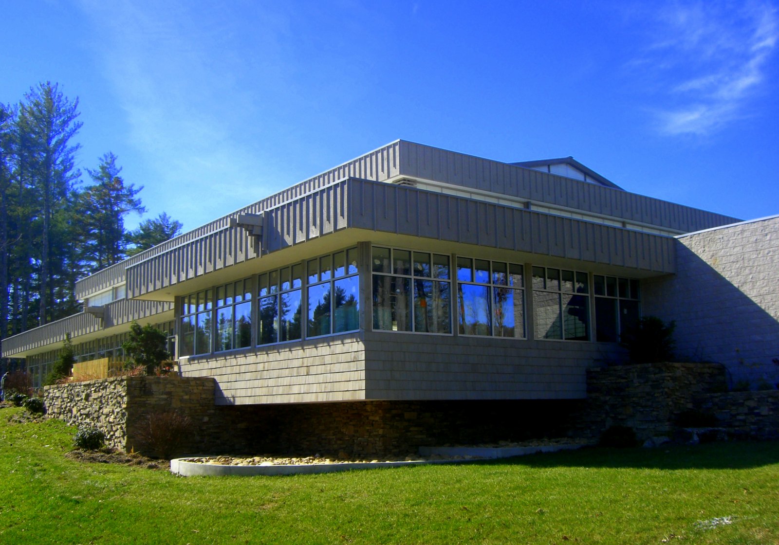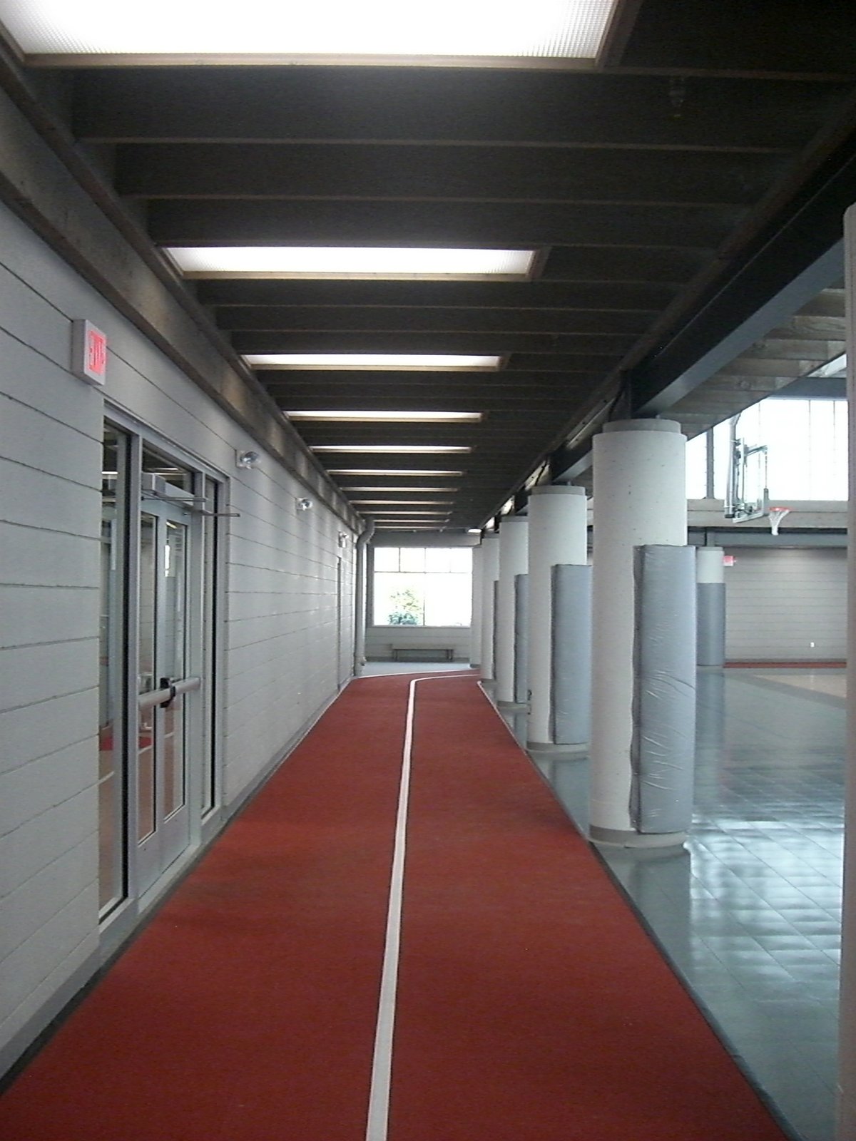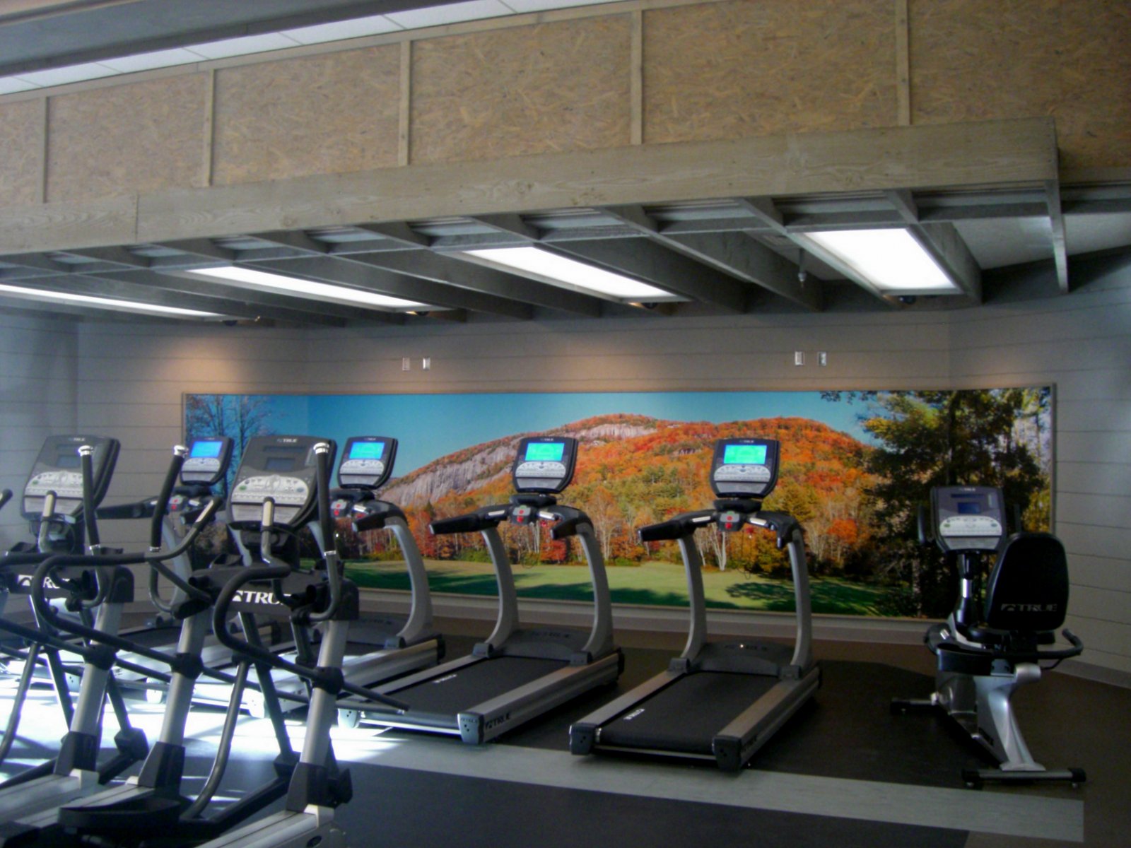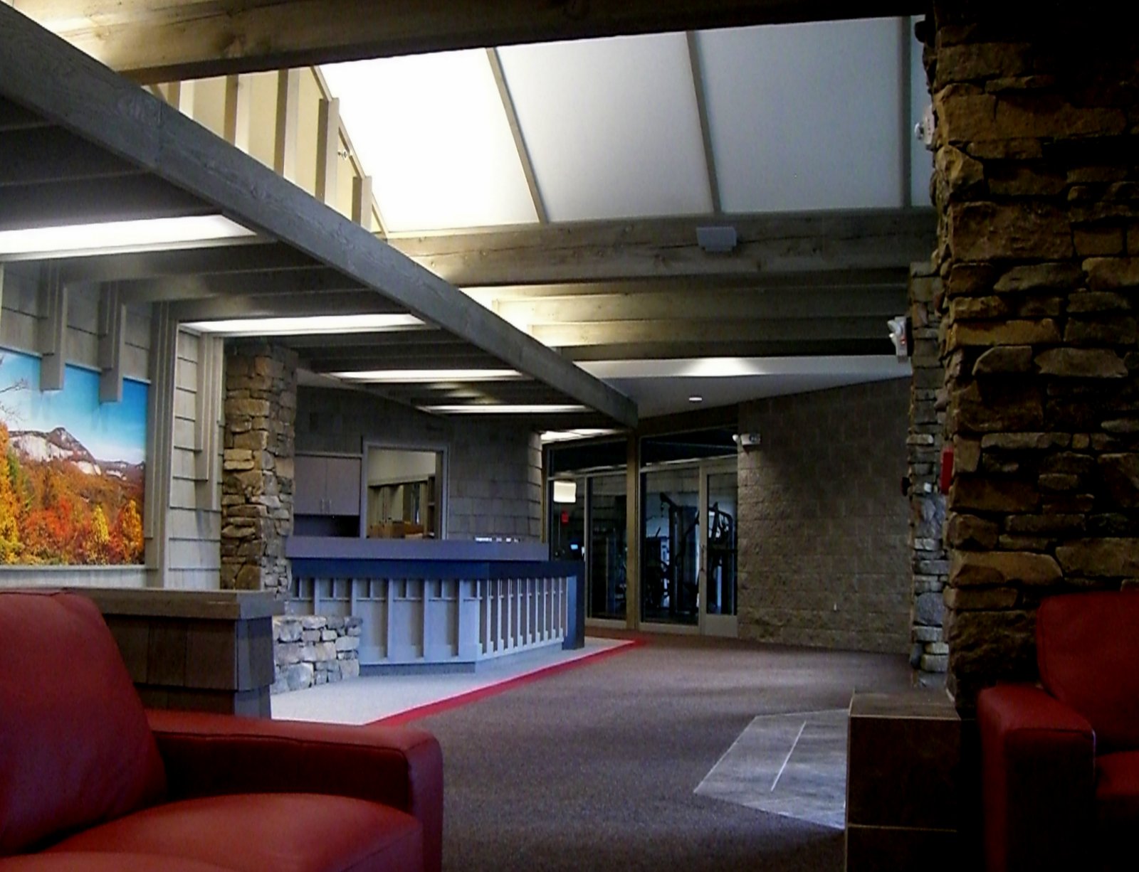 An important requirement of the village planning council was that the building expresses the scale, the character and the natural materials of our quaint mountain village. The size and the height of the gymnasium presented a challenge. The inclusion of a running track surrounding the gymnasium, with a lower roof structure, significantly lowers the exterior scale by emphasizing horizontality. Translucent panels between the two roof levels and glass boarding much of the running track bring balanced day light into the interior and views to the outside.