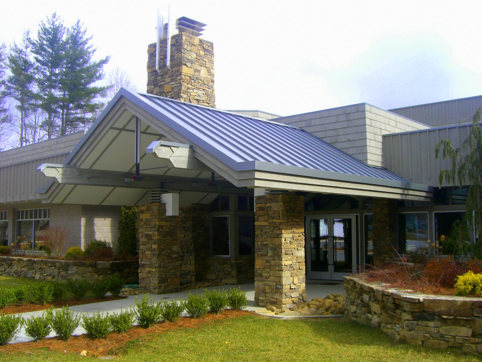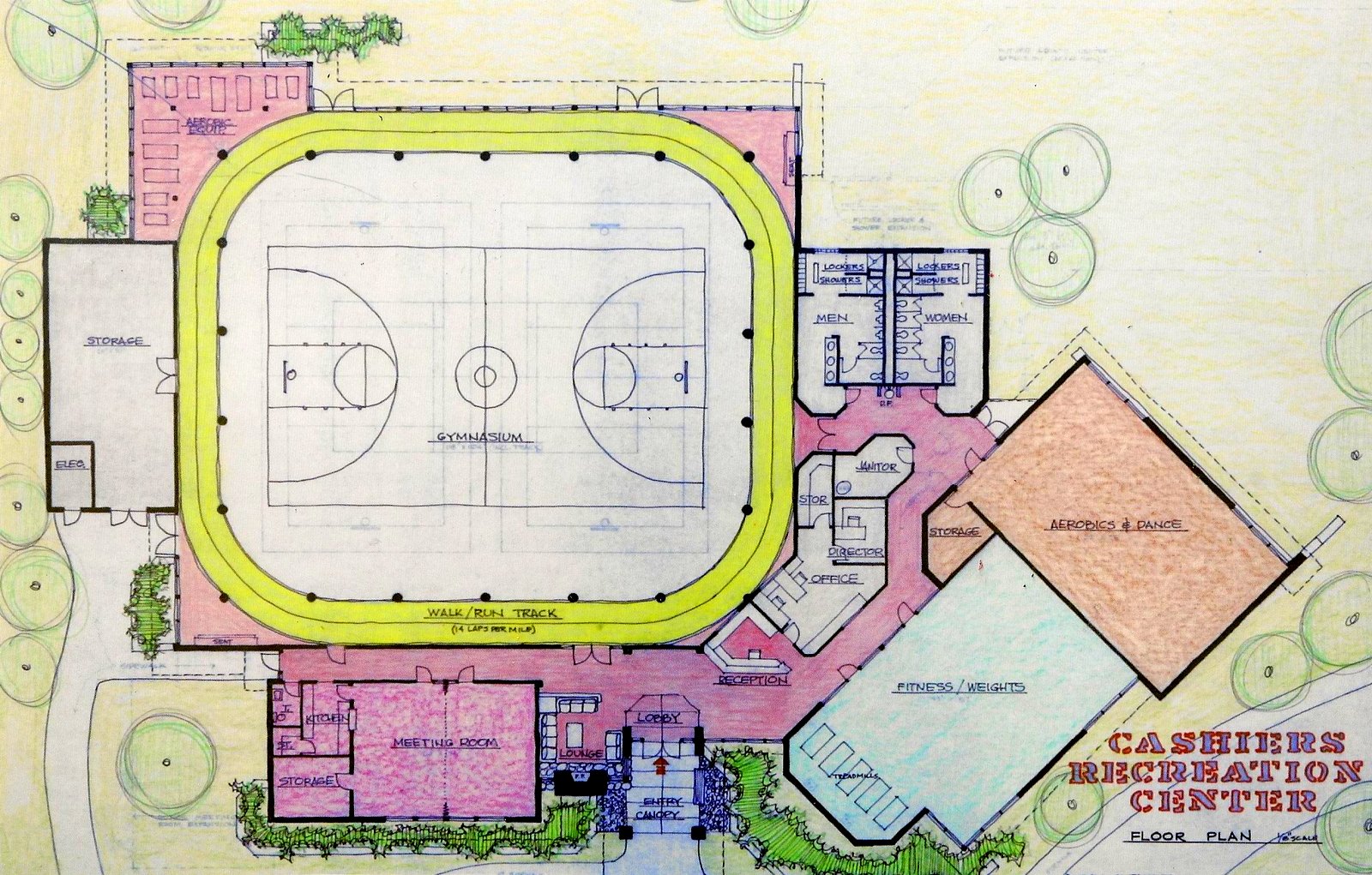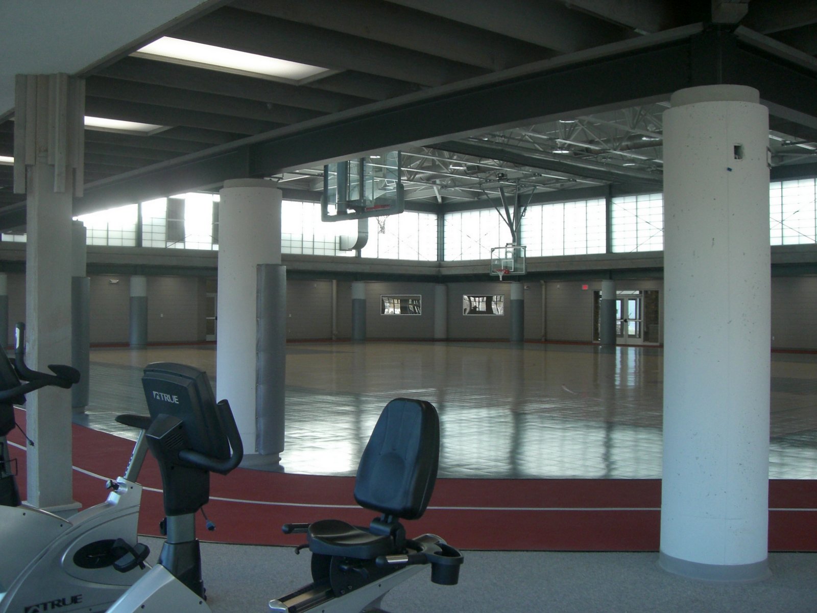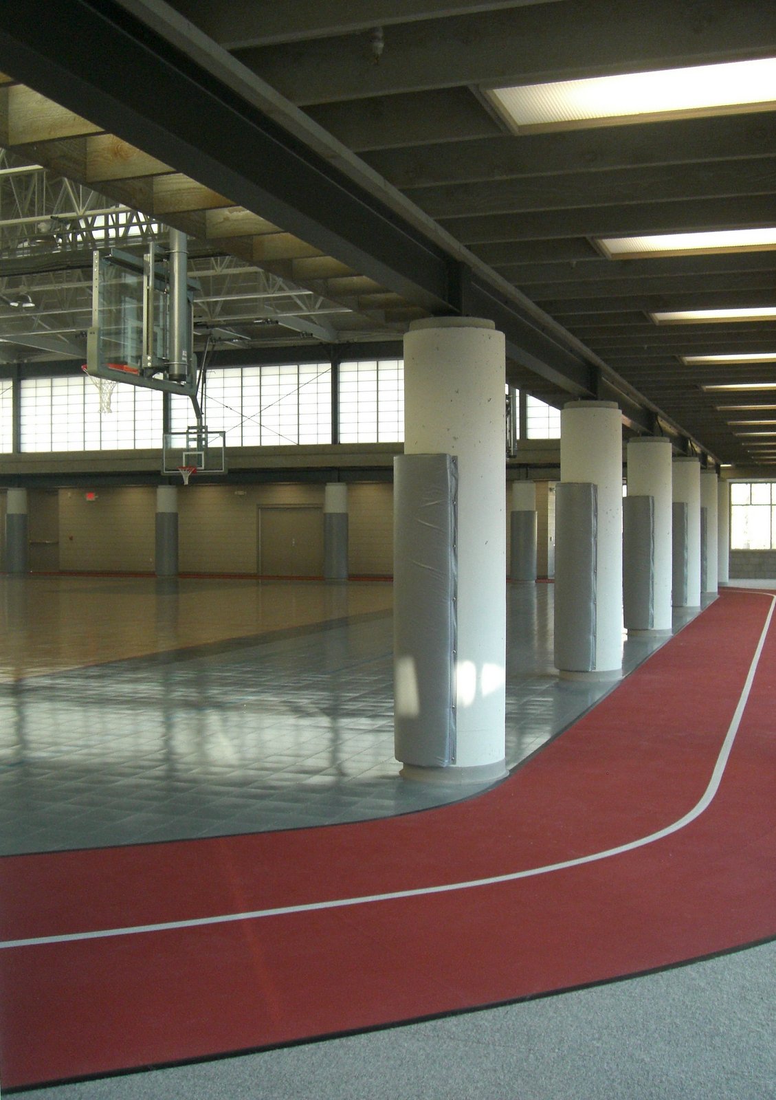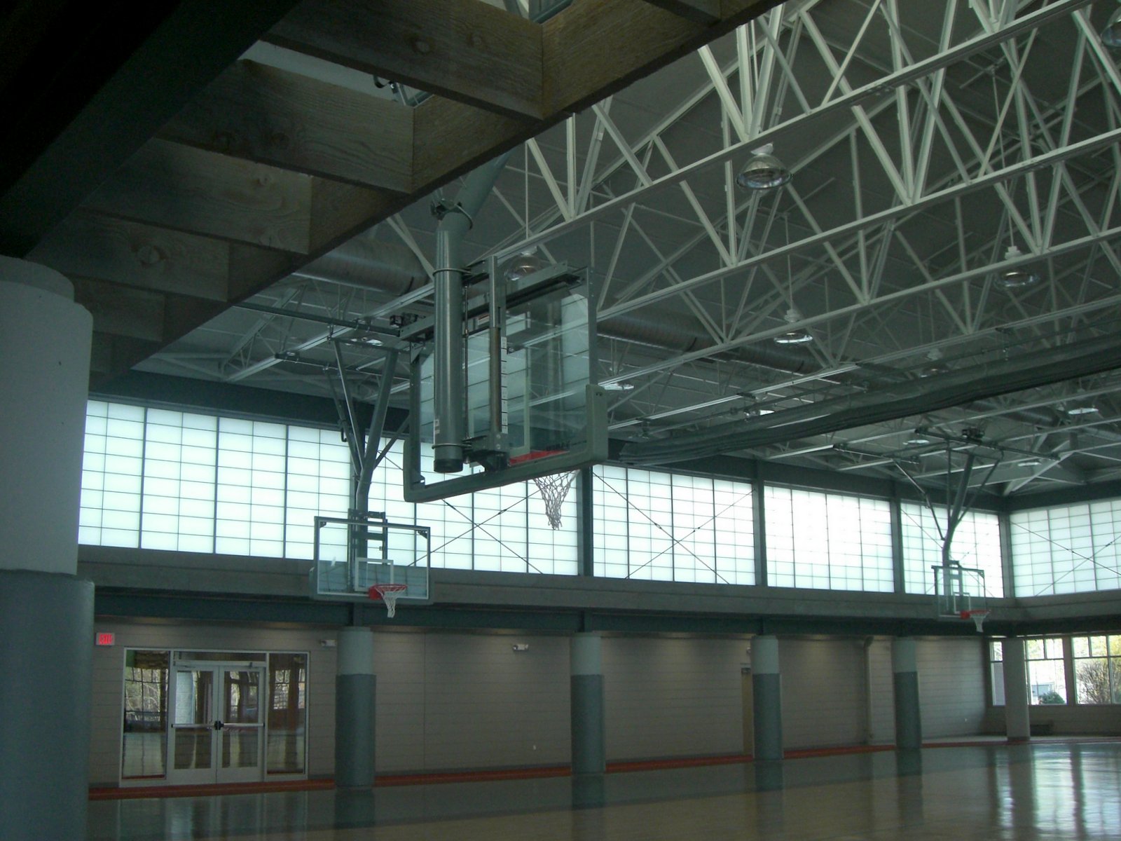 In addition to the gymnasium and running track, the facility includes a weight/fitness room, an aerobics/dance exercise room and a meeting room/kitchen. The materials are split face block, Tennessee field stone and wood.