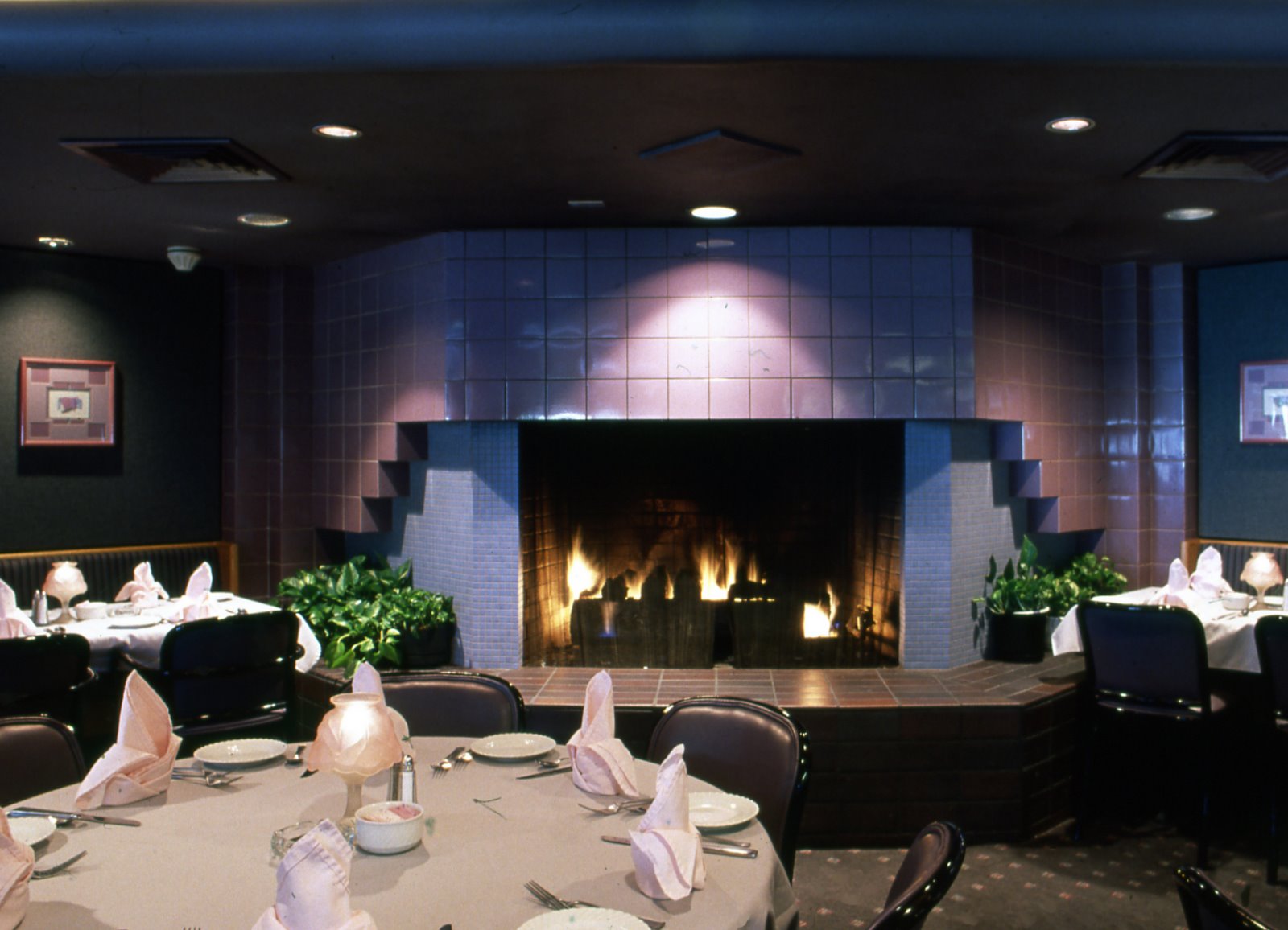 The floor plan was completely reconfigured. The damaged section of the steel joist roof was replaced with a "bird" like shaped wood roof structure, much like the Phoenix rising from the ashes. The original thought was to change the name, but the client worried that the good will of Christopher's would be lost. Three bars were positioned on the existing floor level and beneath the new higher roof shapes, and the remainder was raised two steps to distinguish the dining areas and to provide plumbing space under the kitchen and service areas. Two fireplaces graced the dining areas.