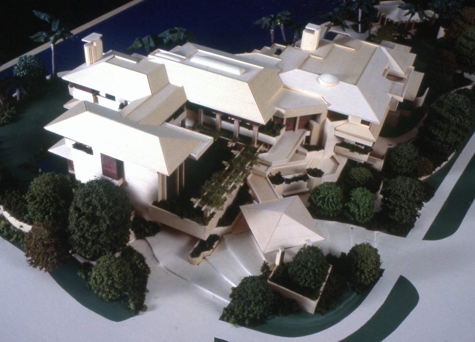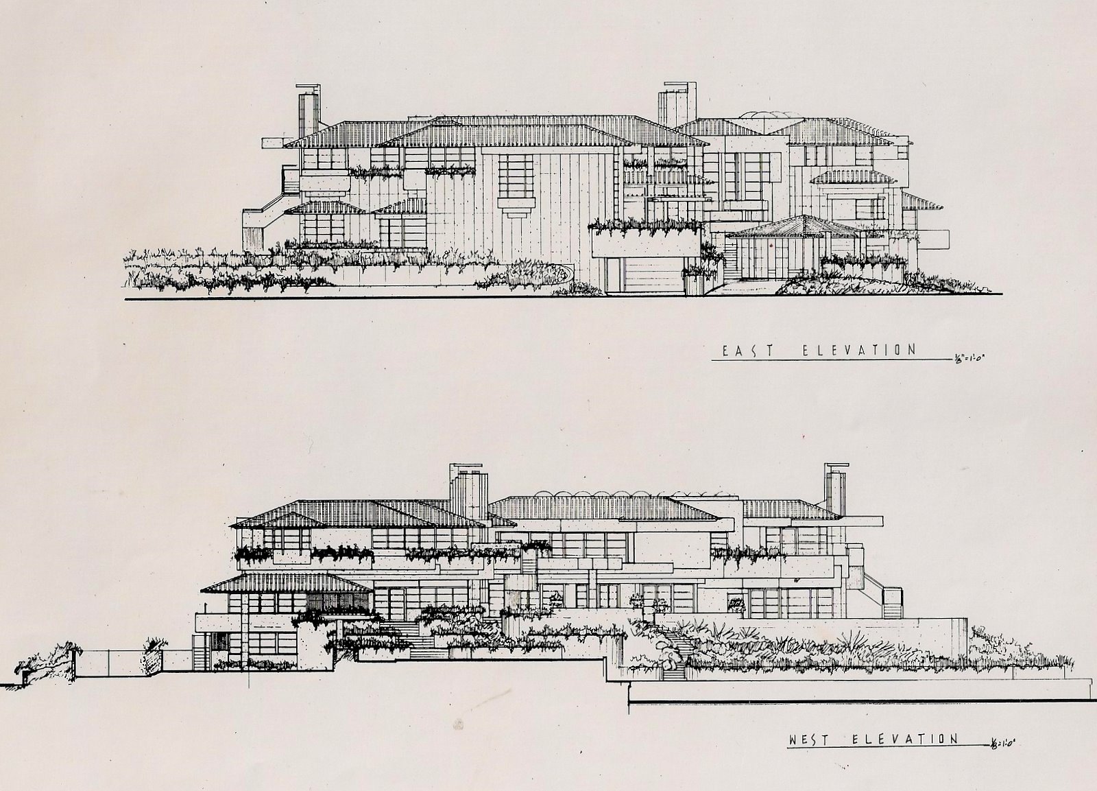 Materials were as follows………Moss green ceramic tile on serpentine planter walls concealing the first floor…….Beige Acadia stone on all exterior floors, Living room floor and all walls originating from the ground…….Beige/white stucco on all horizontal elements……..Moss green steel window and door frames with 9/16" laminated tempered glass for security and storm protection…….Pearl beige Japanese roof tile.