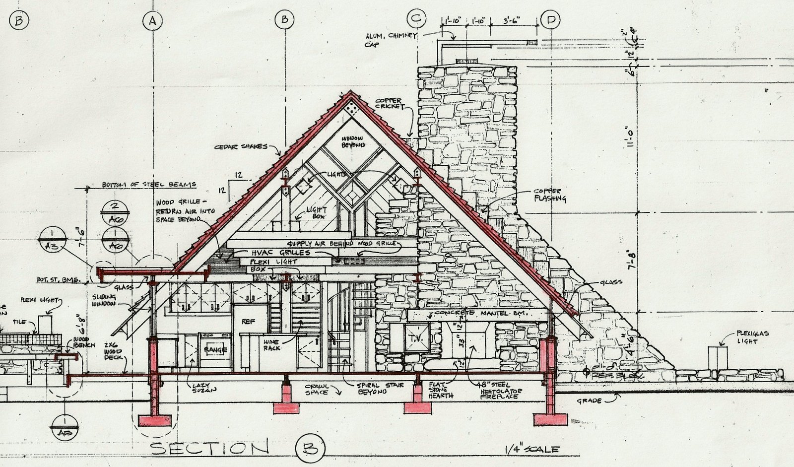 The structure was basically a gable roof with very low eves on the lower level. The master bedroom was an open loft over the two guest bedrooms below and the living area was a two story space.