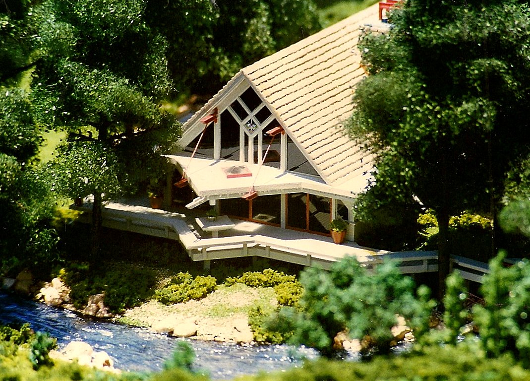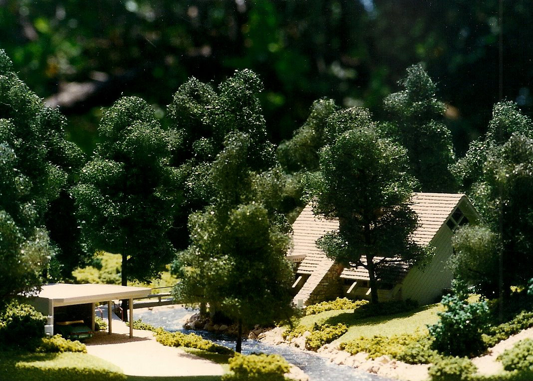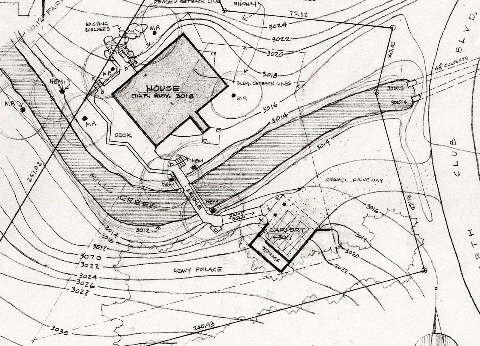 The lot was small and had a wide creek right down the middle of it. First an adjustment to the building setback line was necessary in order to build at all. The carport had to be on the other side of the creek in order to have access from the street. A bridge solved that problem and made for a very unique entrance to the small cabin.