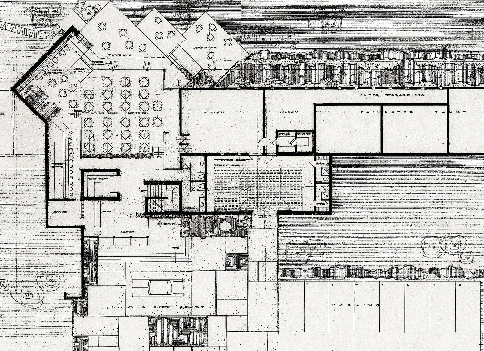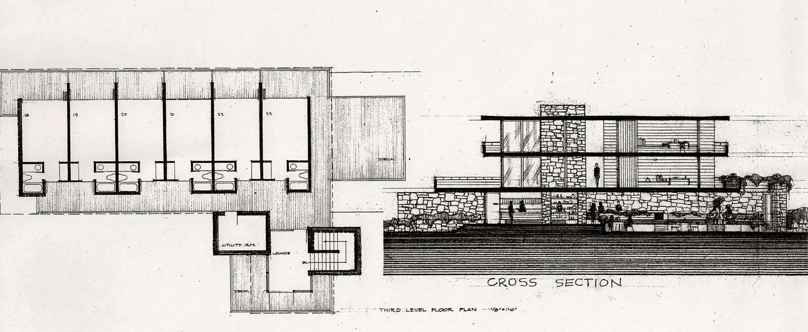 A small hotel (23 rooms) with a restaurant/bar, on the beach……Coral stone and horizontal wood siding……The stone always emerging from the ground (mass) and the horizontals floating (planes)…….As was the case with many start up projects in the Bahamas in those days, it never got off the ground.