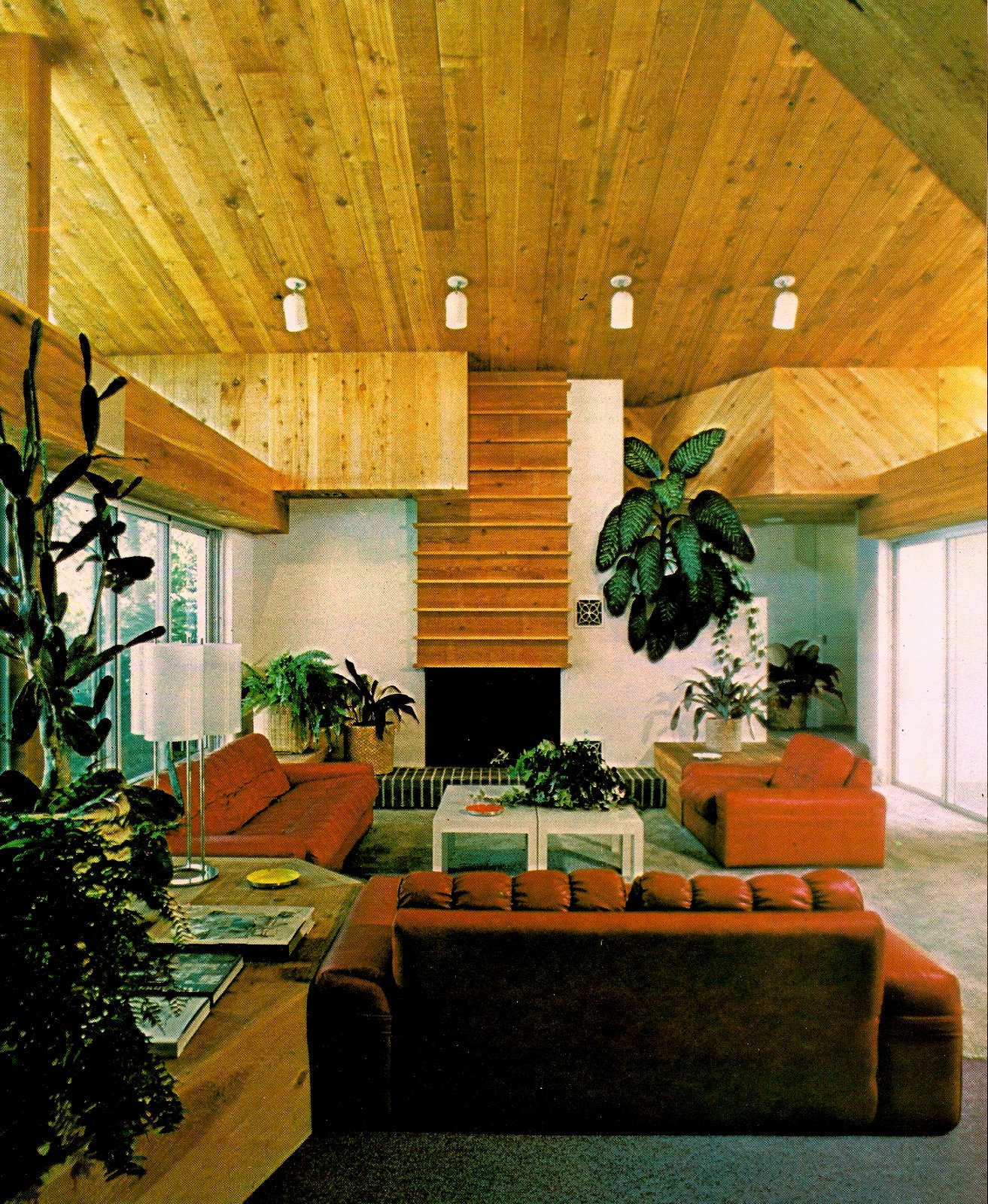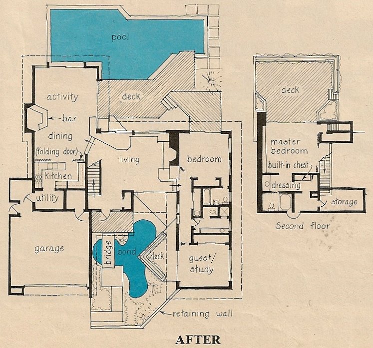 Exterior form was created by boxing down from existing roof overhangs, which also carried into the interiors. Diagonal cedar shiplap boards clad vertical surfaces inside and out. The sloping ceiling is also cedar. The former Florida room became an activity area with a billiard table, bar, dining and an open kitchen. A swimming pool and multilevel decks were added as an extension of the activity area. The new entrance became a landscaped garden accessed by a bridge over a pond.