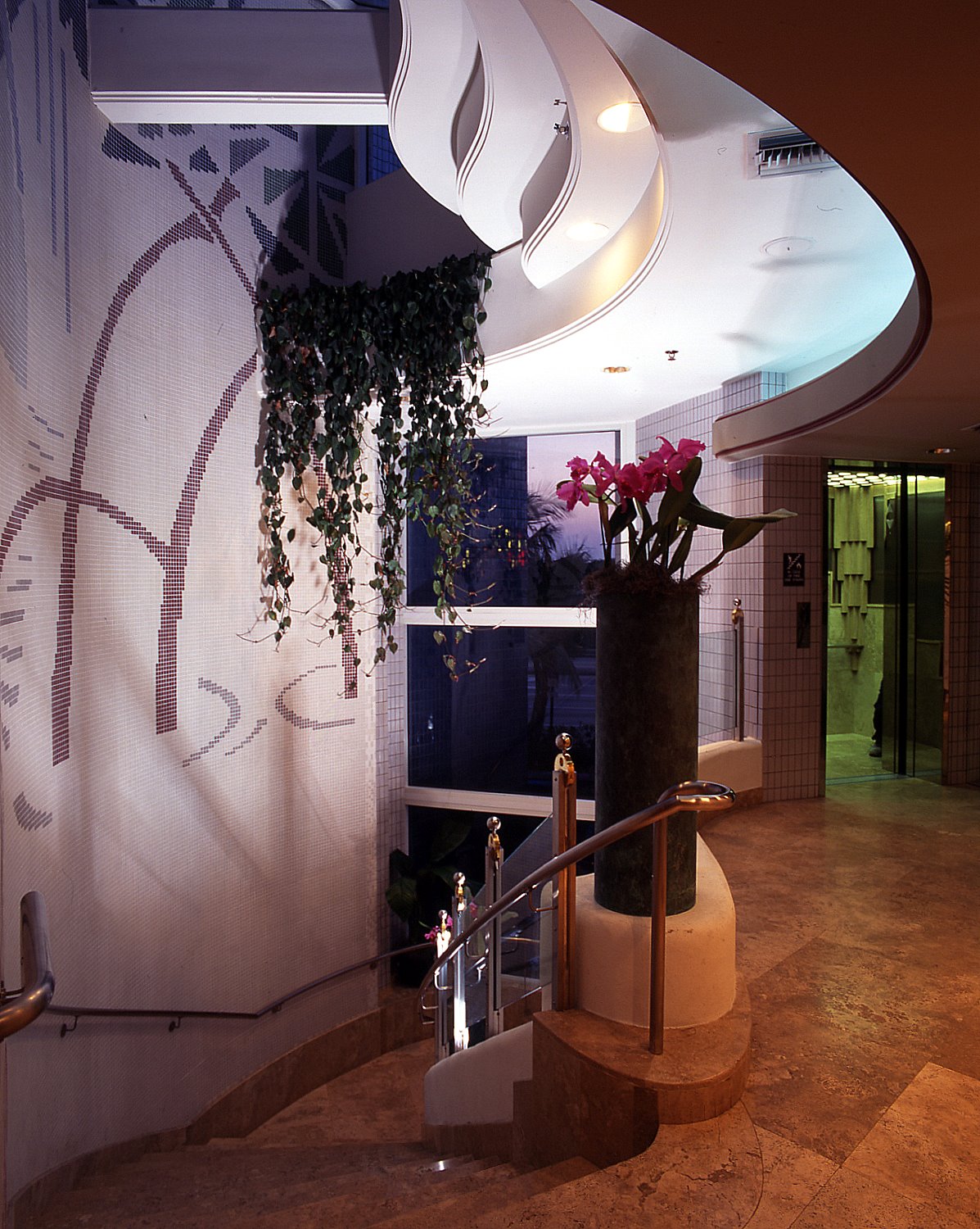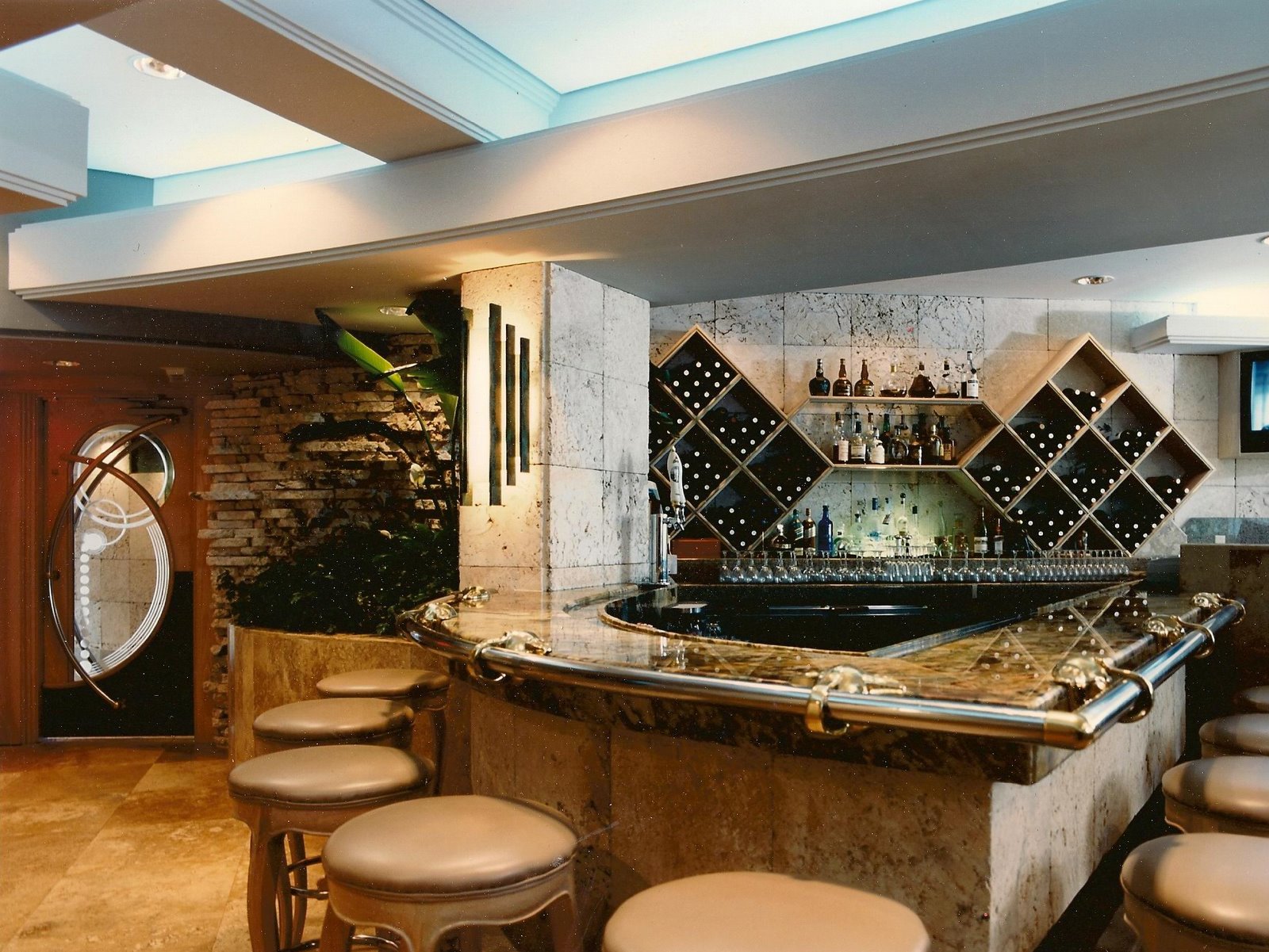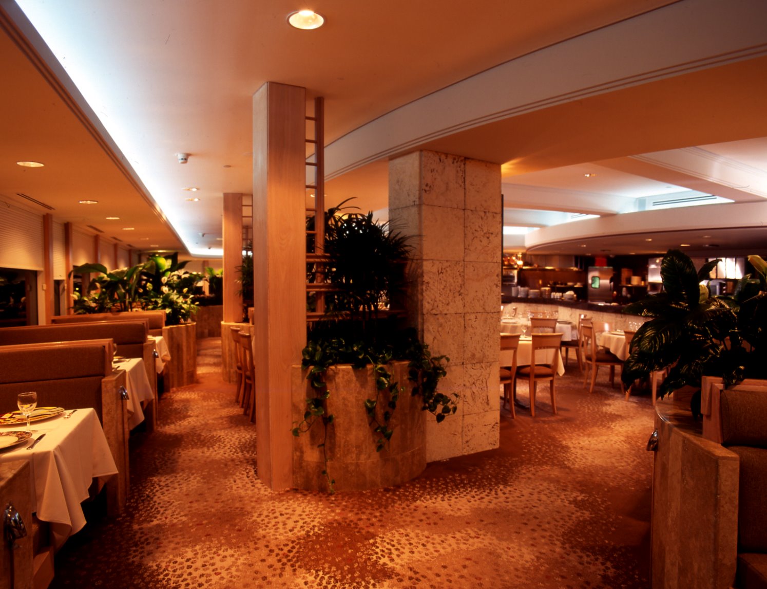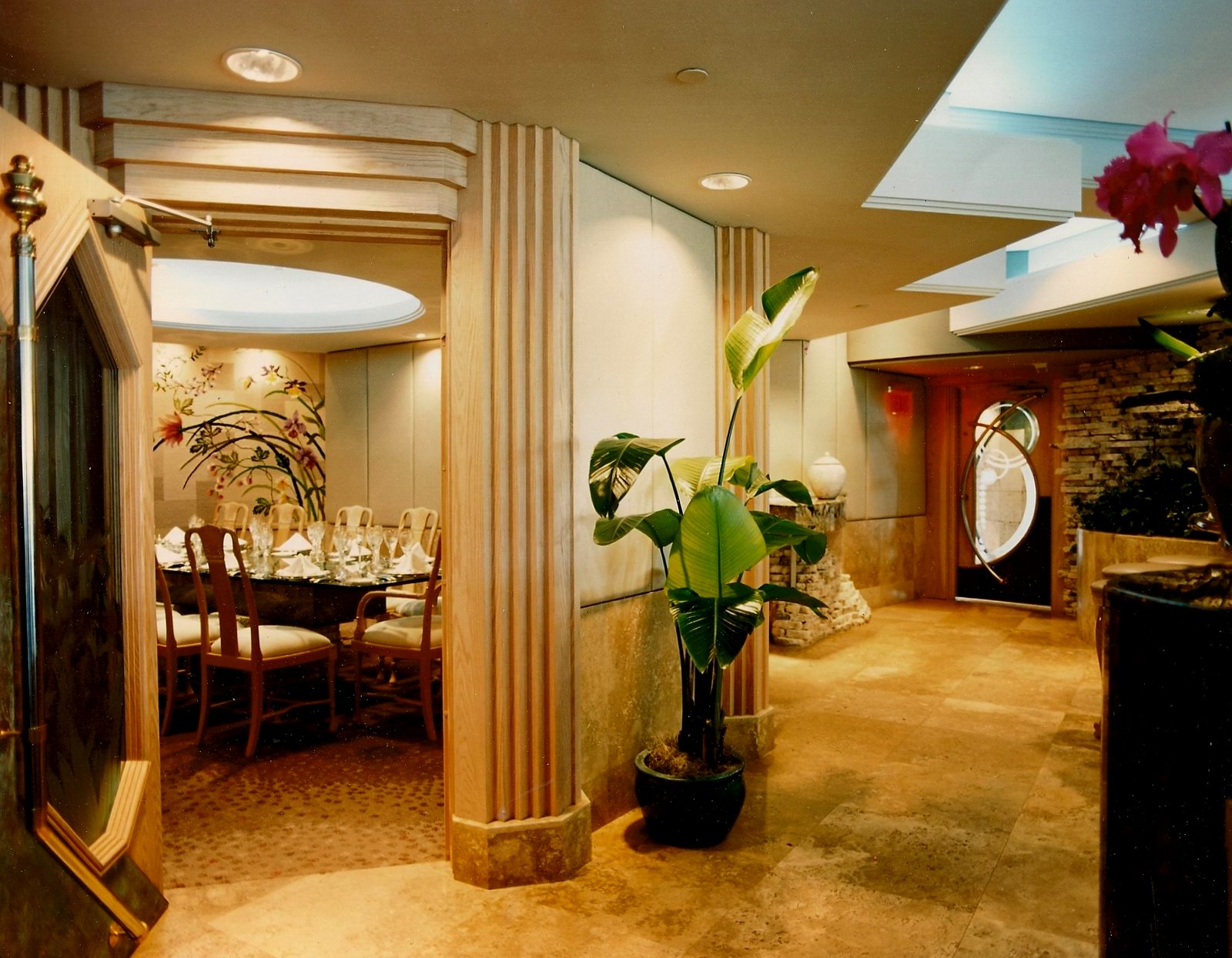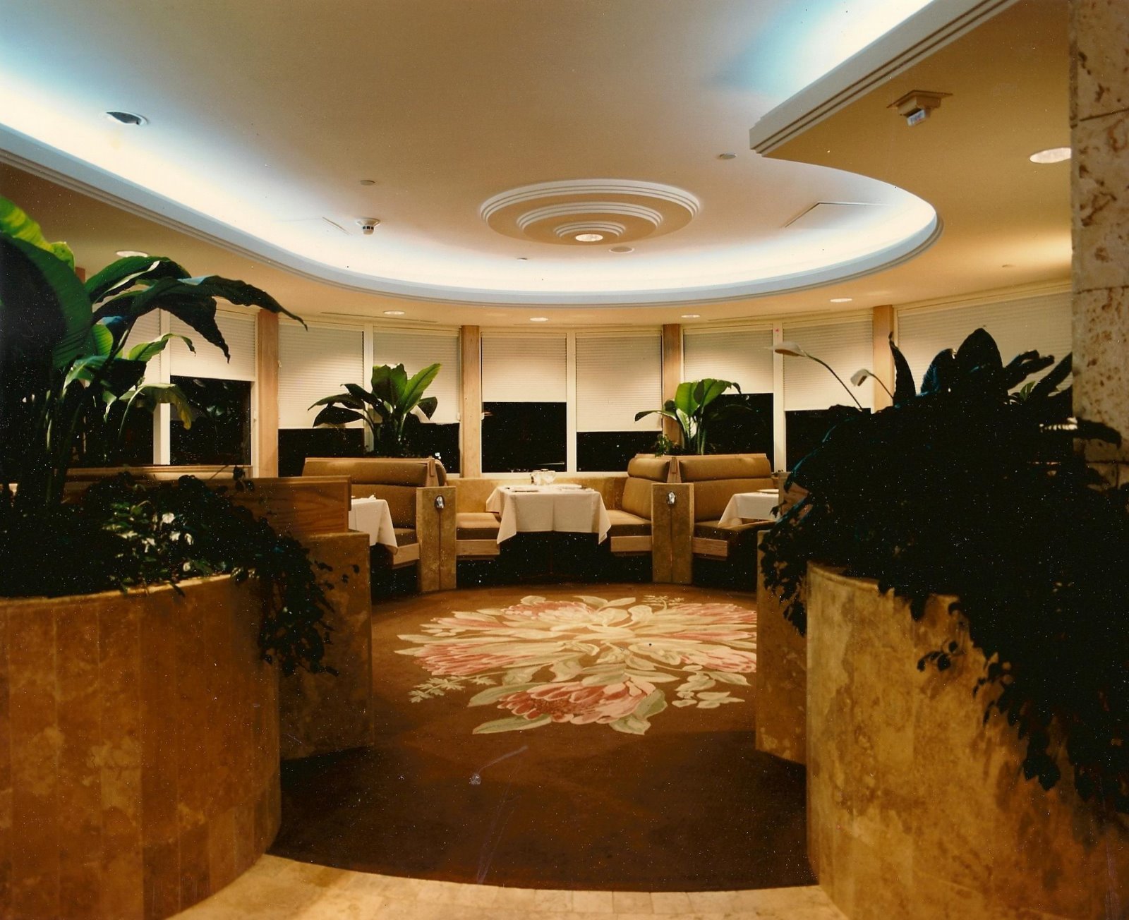 Saw cut Coral rock and crosscut Travertine marble are the primary hard surfaces while brown granite slabs backup the display kitchen and service areas. Carpeted dining areas are custom Edward Fields, including two beautiful floral carpet wall murals, one in the private dining room and the other on a major curving wall in the Club.