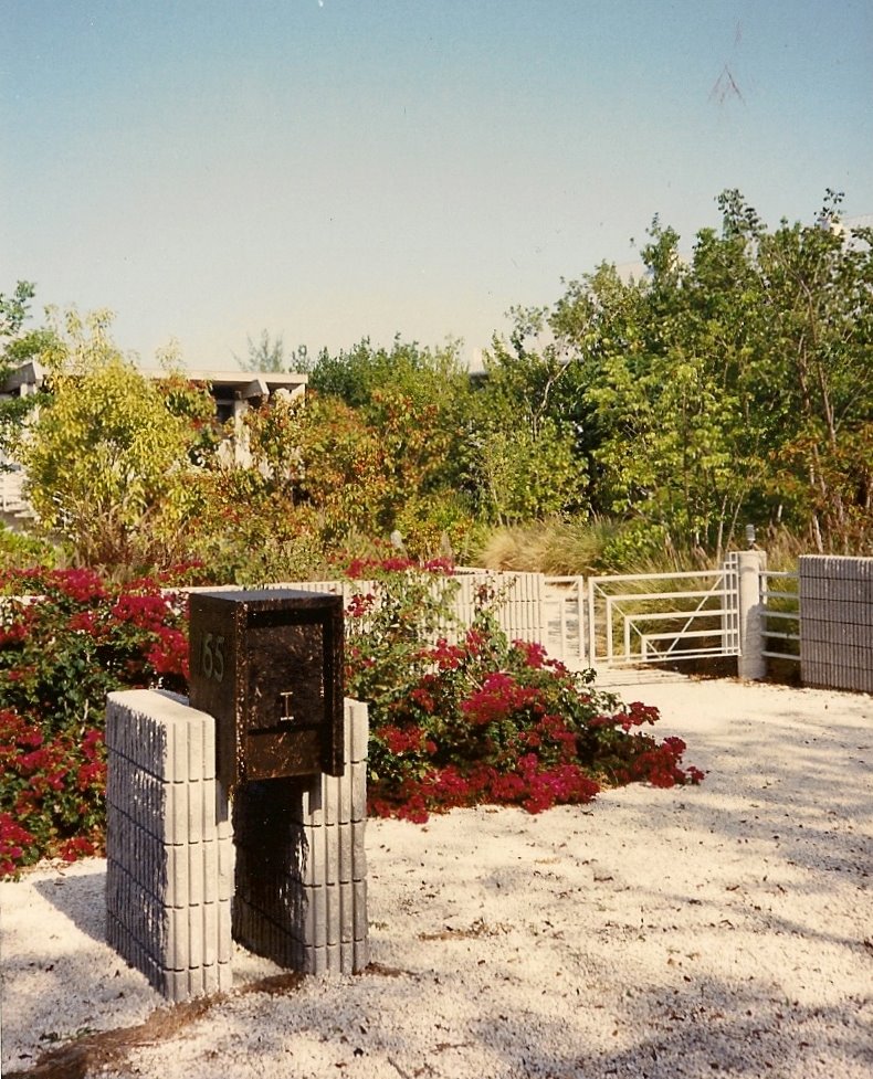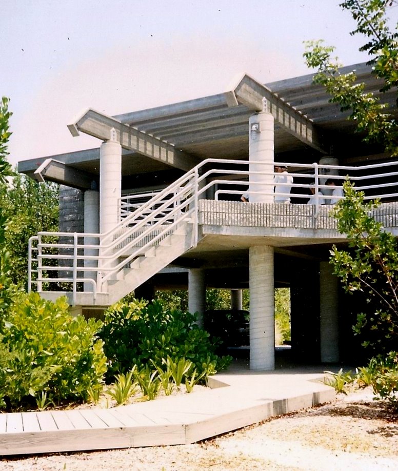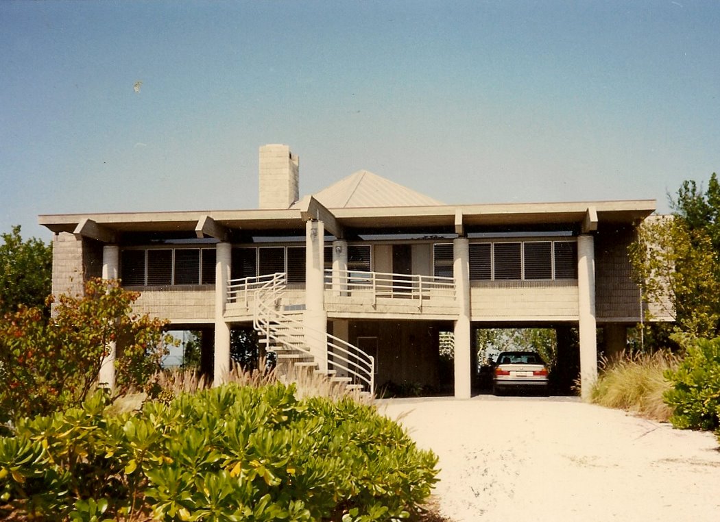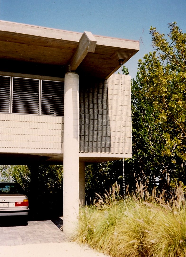 Coastal codes there required elevating the living areas above hurricane tidal surge, so the idea was to locate the concrete columns on the outside and extending up to visually support only the roof, thereby lending a lighter, more graceful feeling to the heavy concrete part of the structure. Windows are dual jalousies with external wood slats for sun shading, privacy and security. The site was landscaped with local salt friendly plant material.
