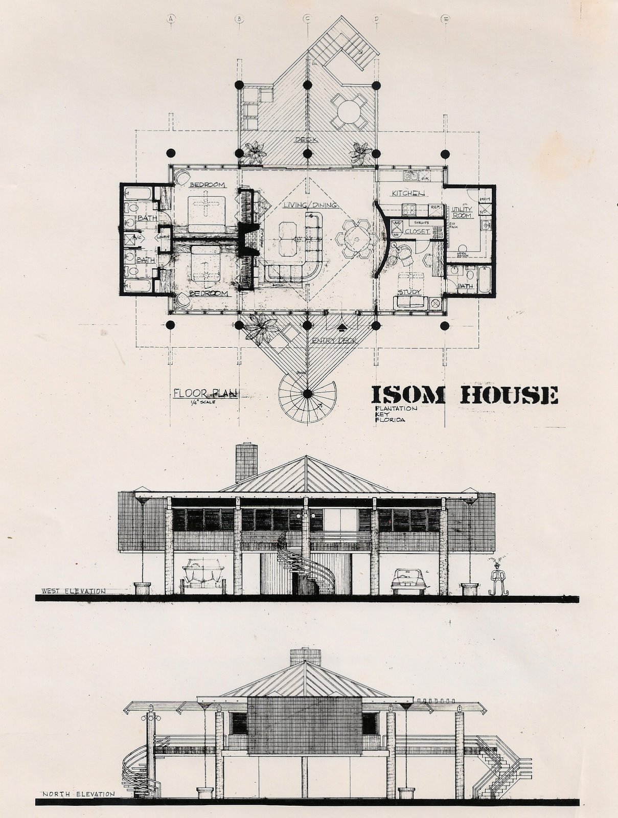 We had designed the Plantation Animal Hospital for Dr. Isom 20 years earlier. He loved the Florida Keys and he loved fishing, and was gradually turning responsibility for his practice over to his younger associates. His first impulse was for what he referred to as a "fishing shack" built mostly of wood. However, Hurricane Andrew struck South Florida during the design process, which was very sobering, and concrete became the wiser choice. Only the roof remained a wood heavy timber structure.