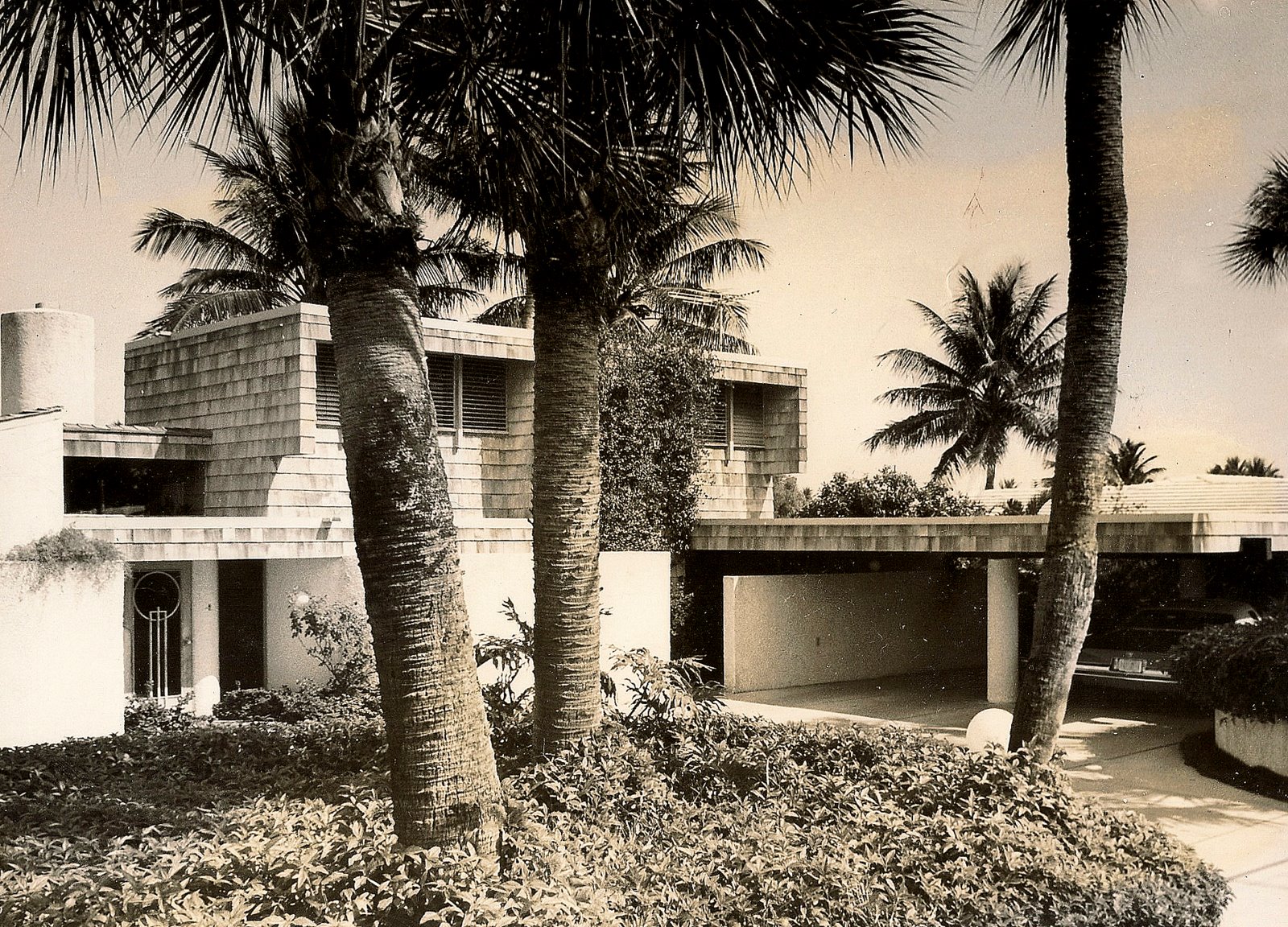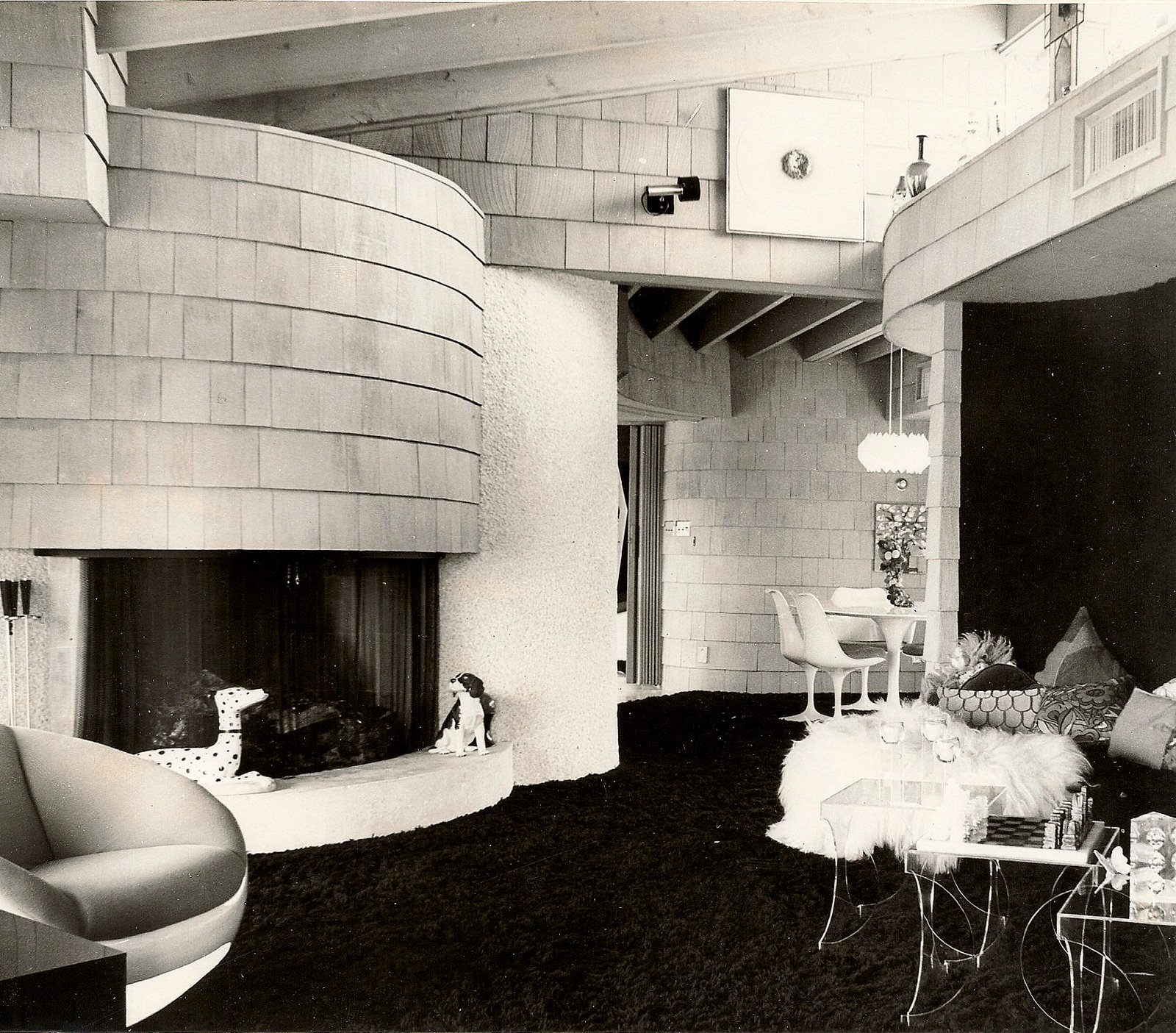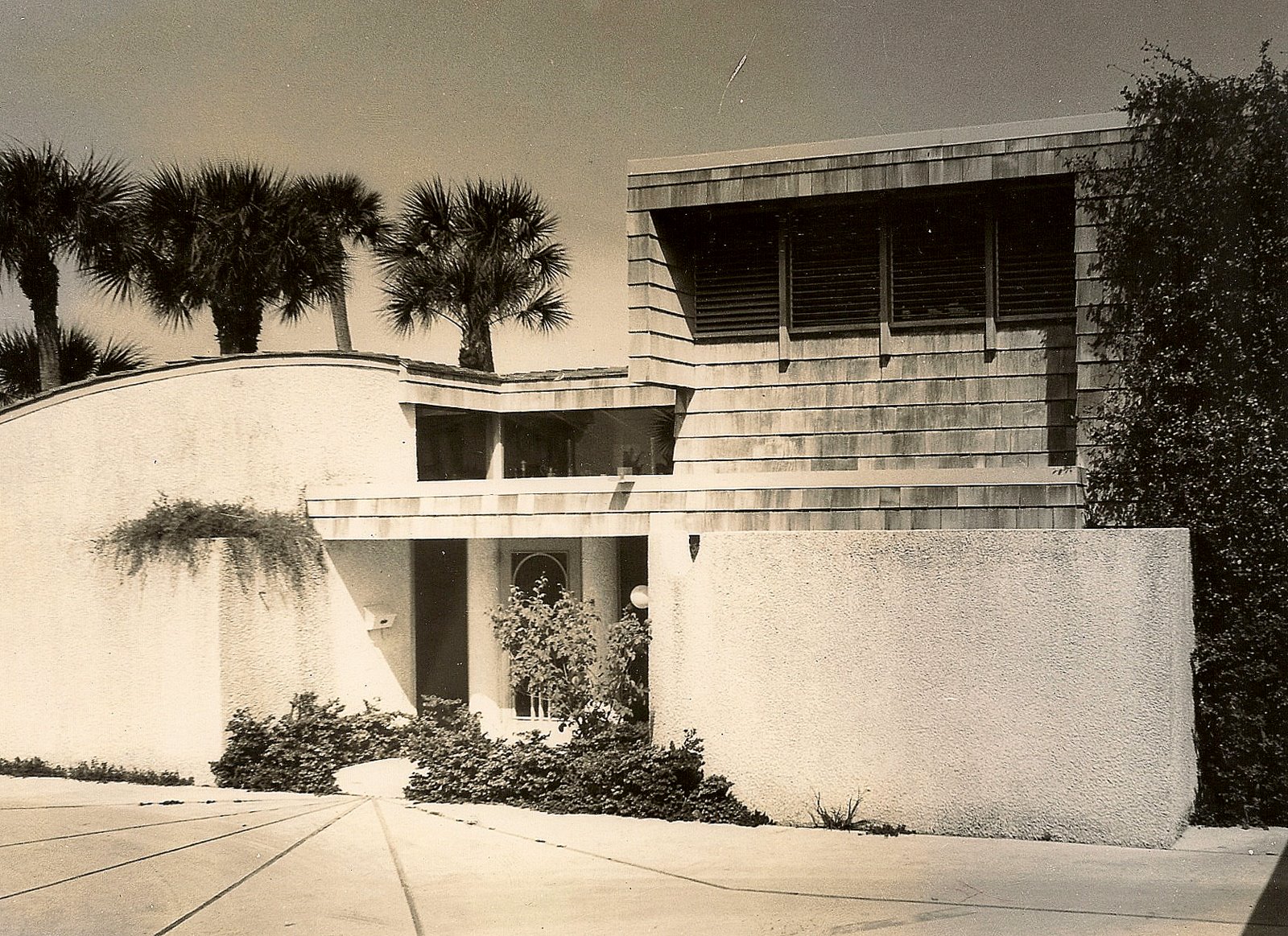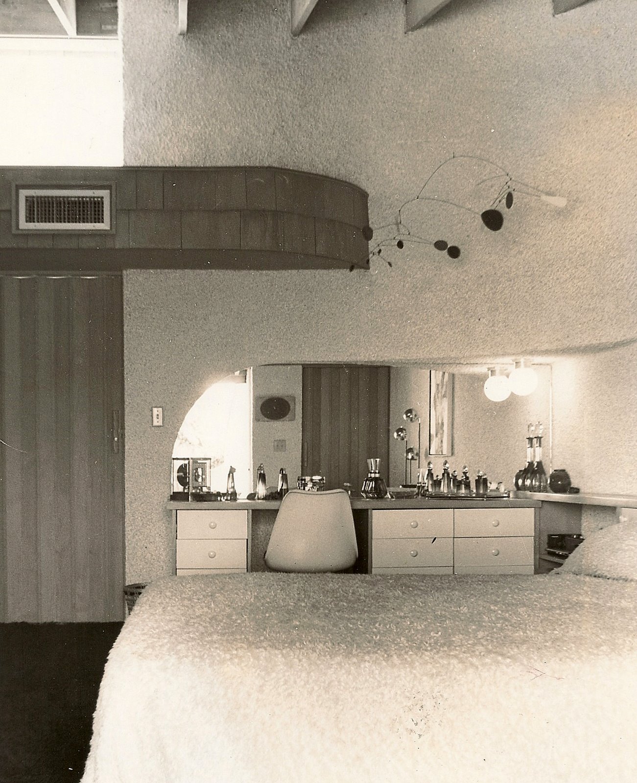 This was the first of several houses using sprayed stucco on curving concrete block walls and Cedar shingles on frame walls, both exterior and interior. Interior ceilings were the exposed 2"x10" framing lumber spaced 16" on center that was the structure of the floor or roof above (including anchor straps and cross bracing).