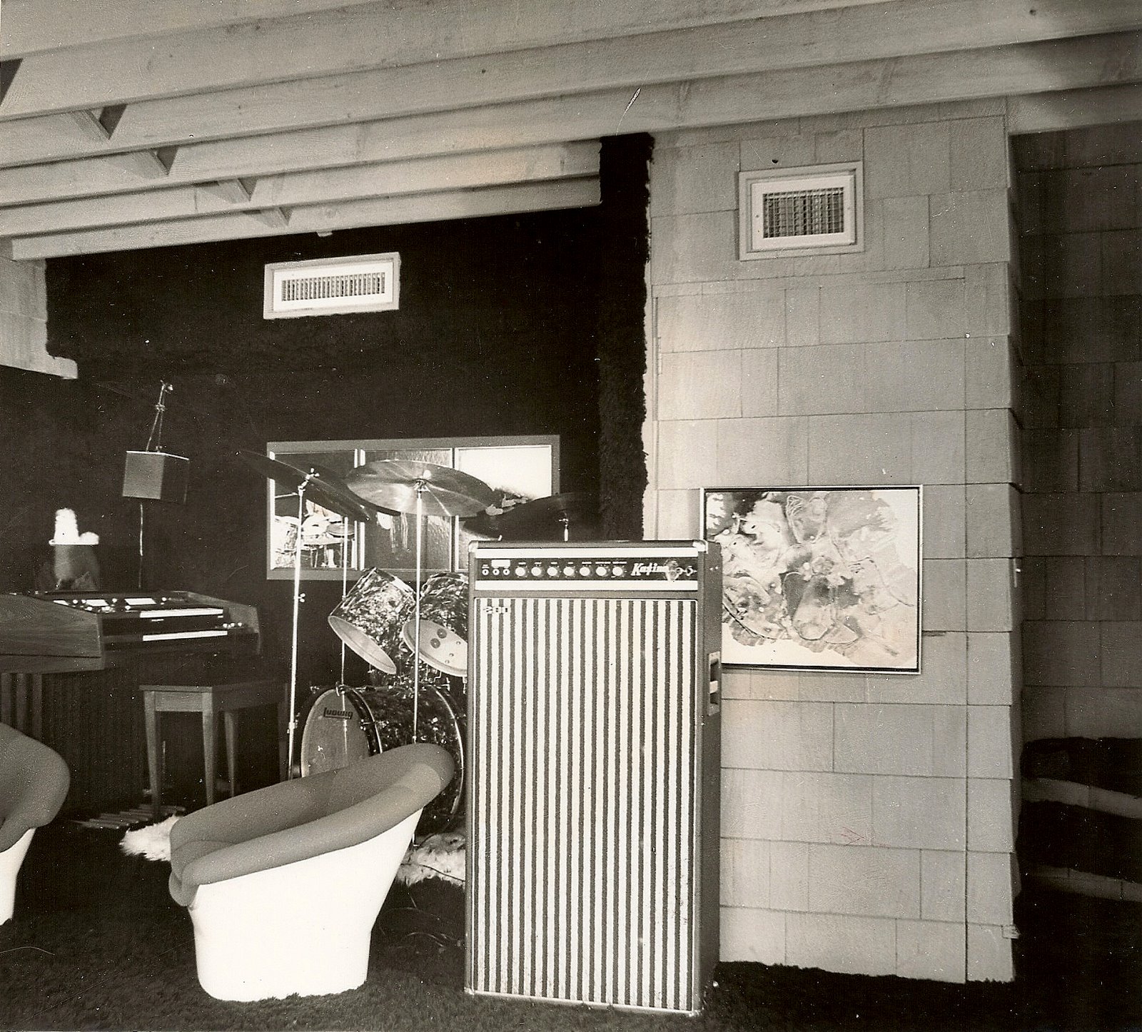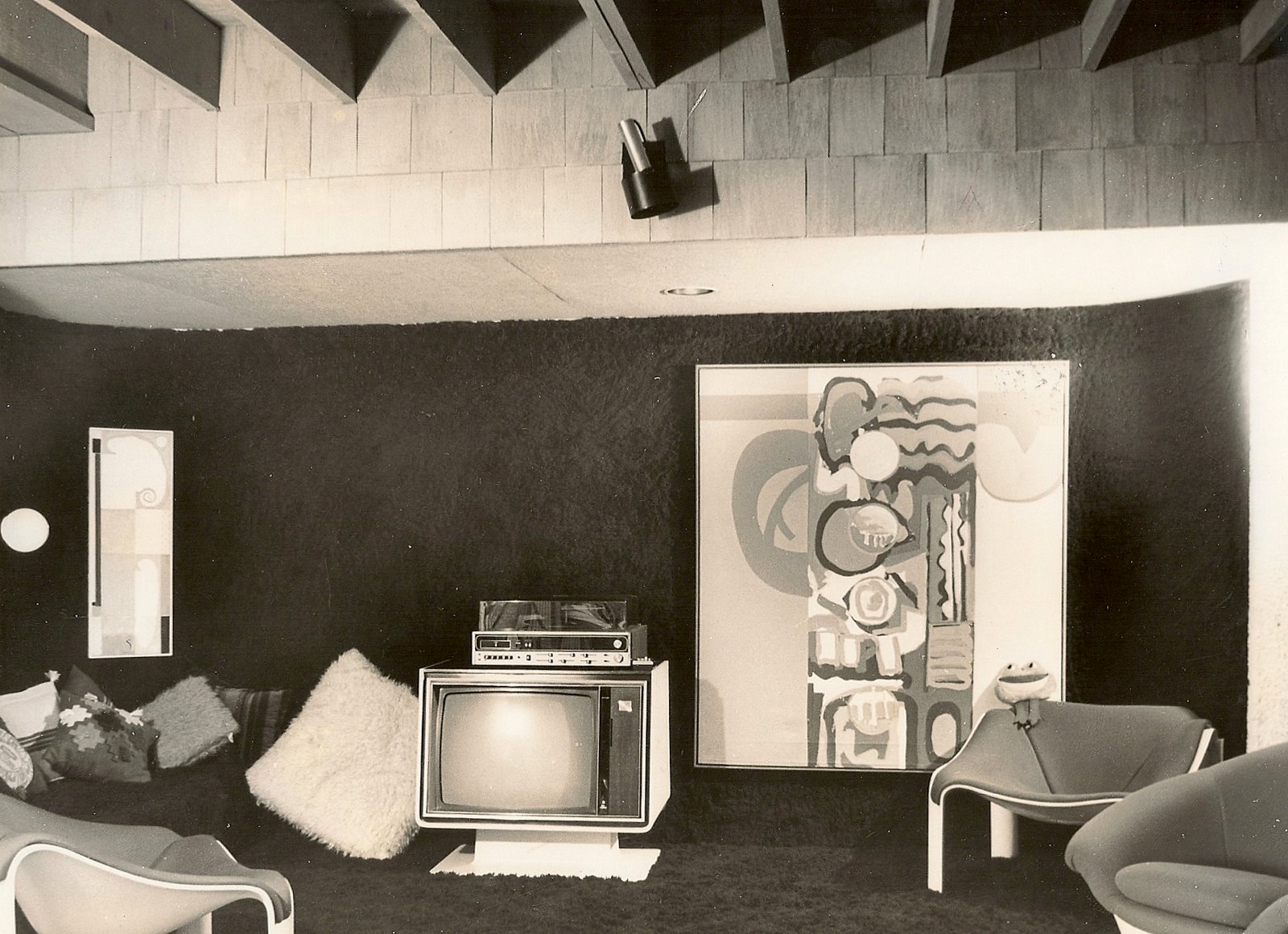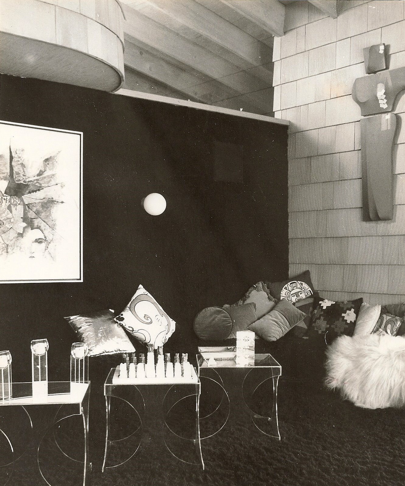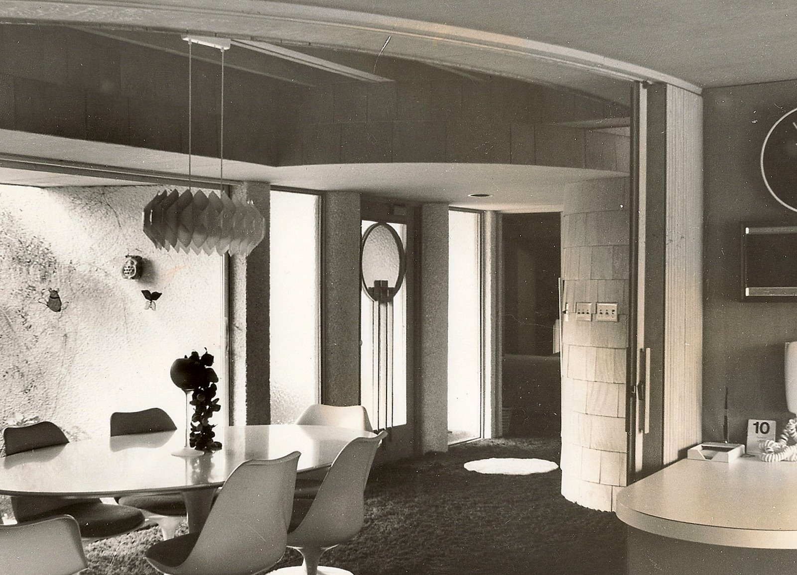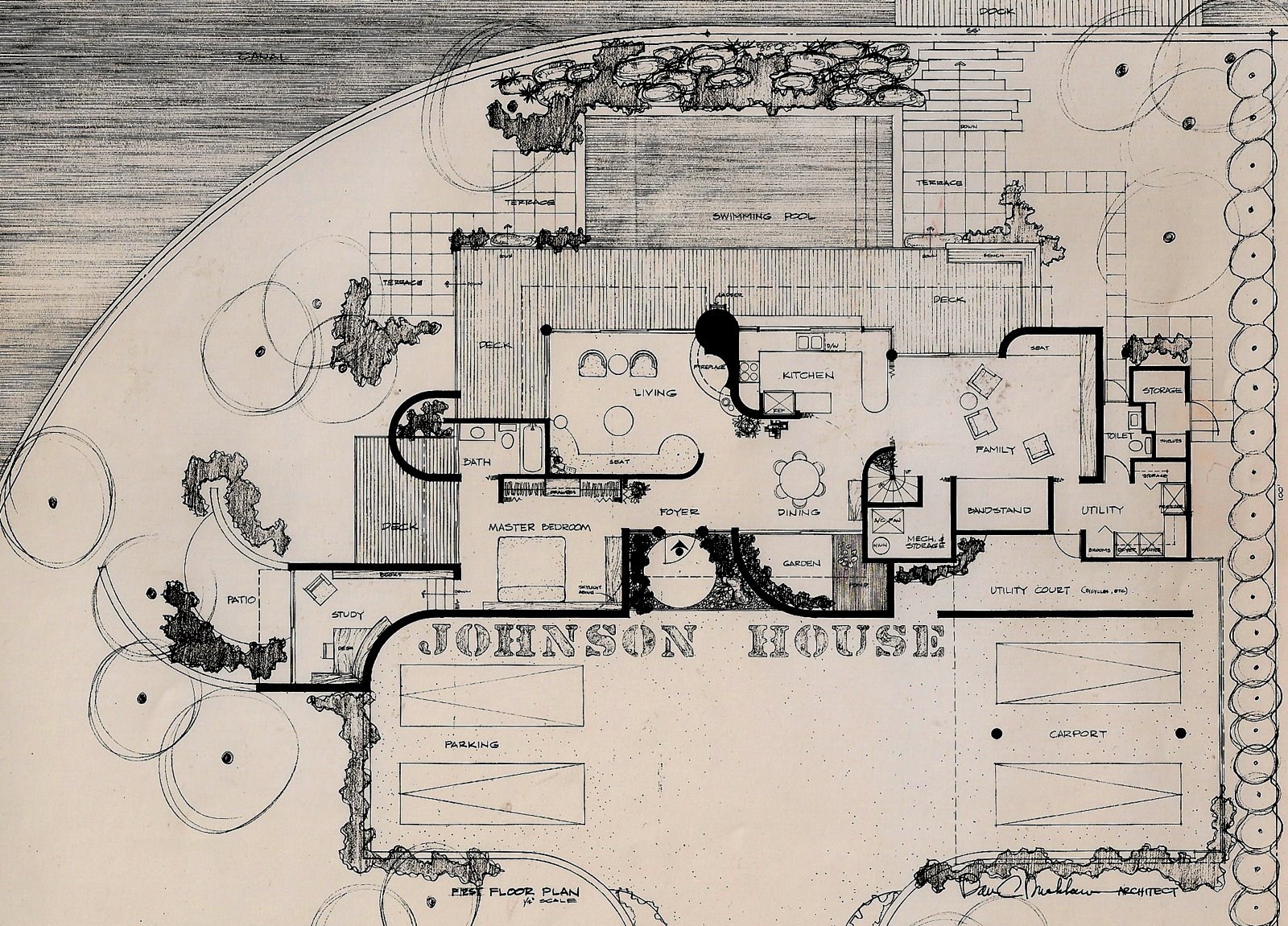 This was the first of several houses using sprayed stucco on curving concrete block walls and Cedar shingles on frame walls, both exterior and interior. Interior ceilings were the exposed 2"x10" framing lumber spaced 16" on center that was the structure of the floor or roof above (including anchor straps and cross bracing).