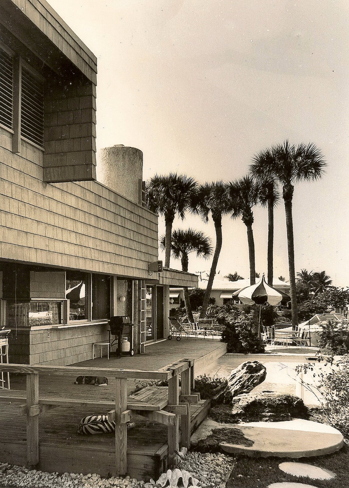 The site was a corner waterfront lot adjacent to a bridge over the side canal. The client was a family with three children who requested a "FUN" house. The floor plan shows the bedrooms for the two sons and daughter on the second floor with a spiral stair accessed from the Family Room below which incorporated a stage for the family band to perform.