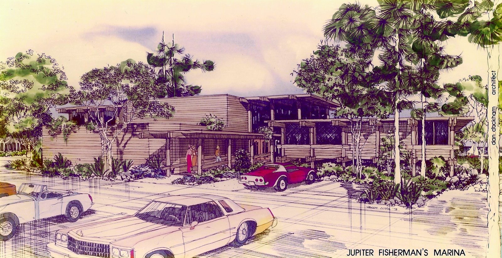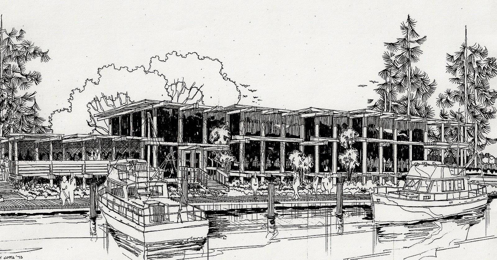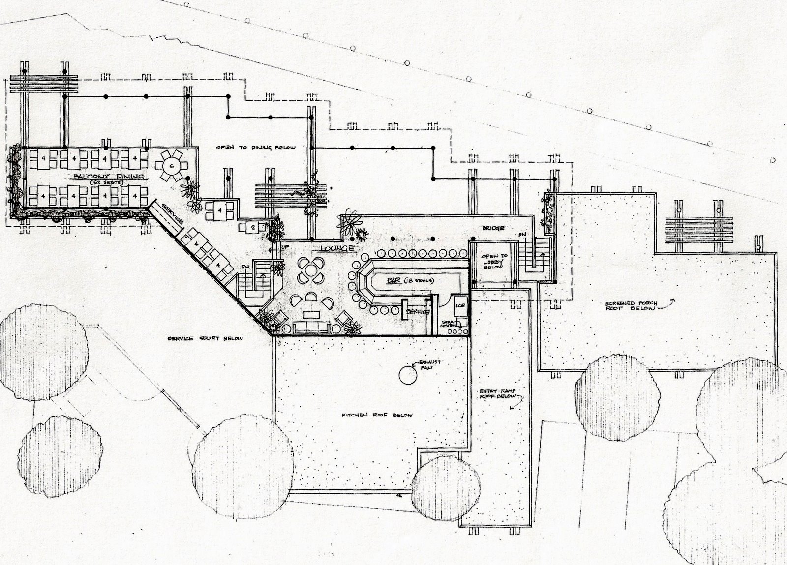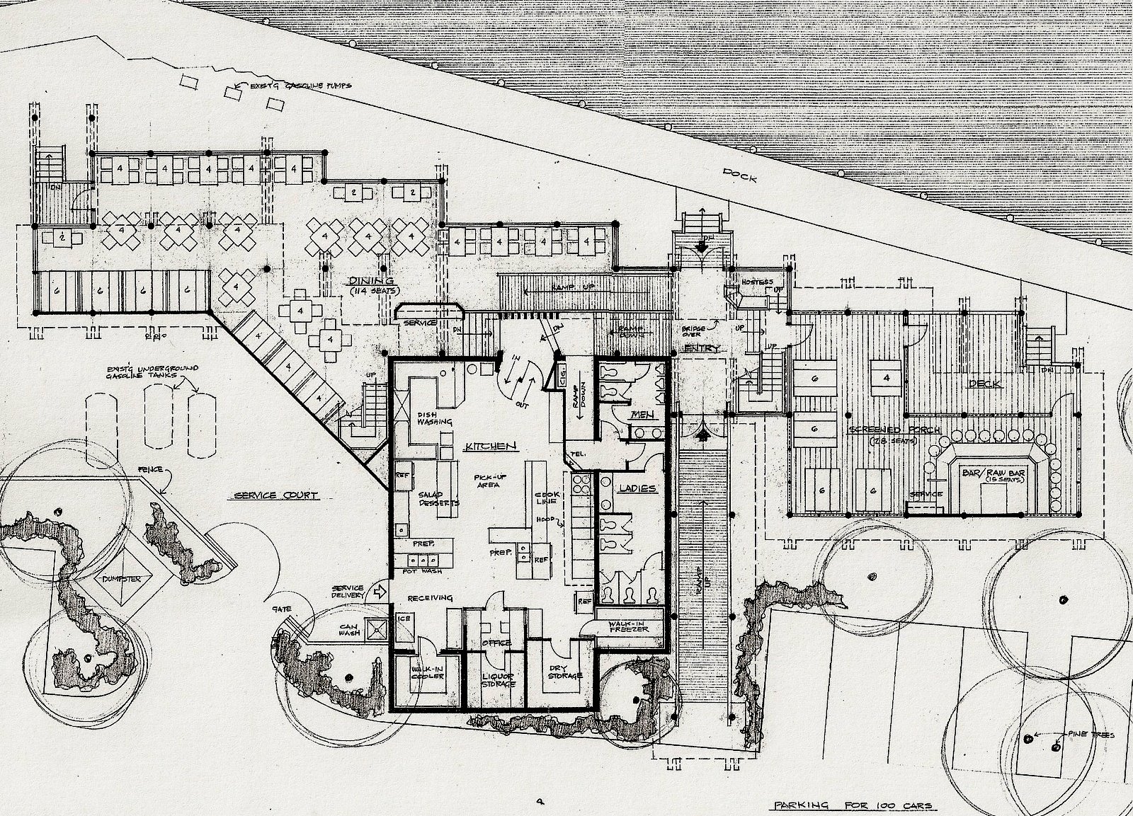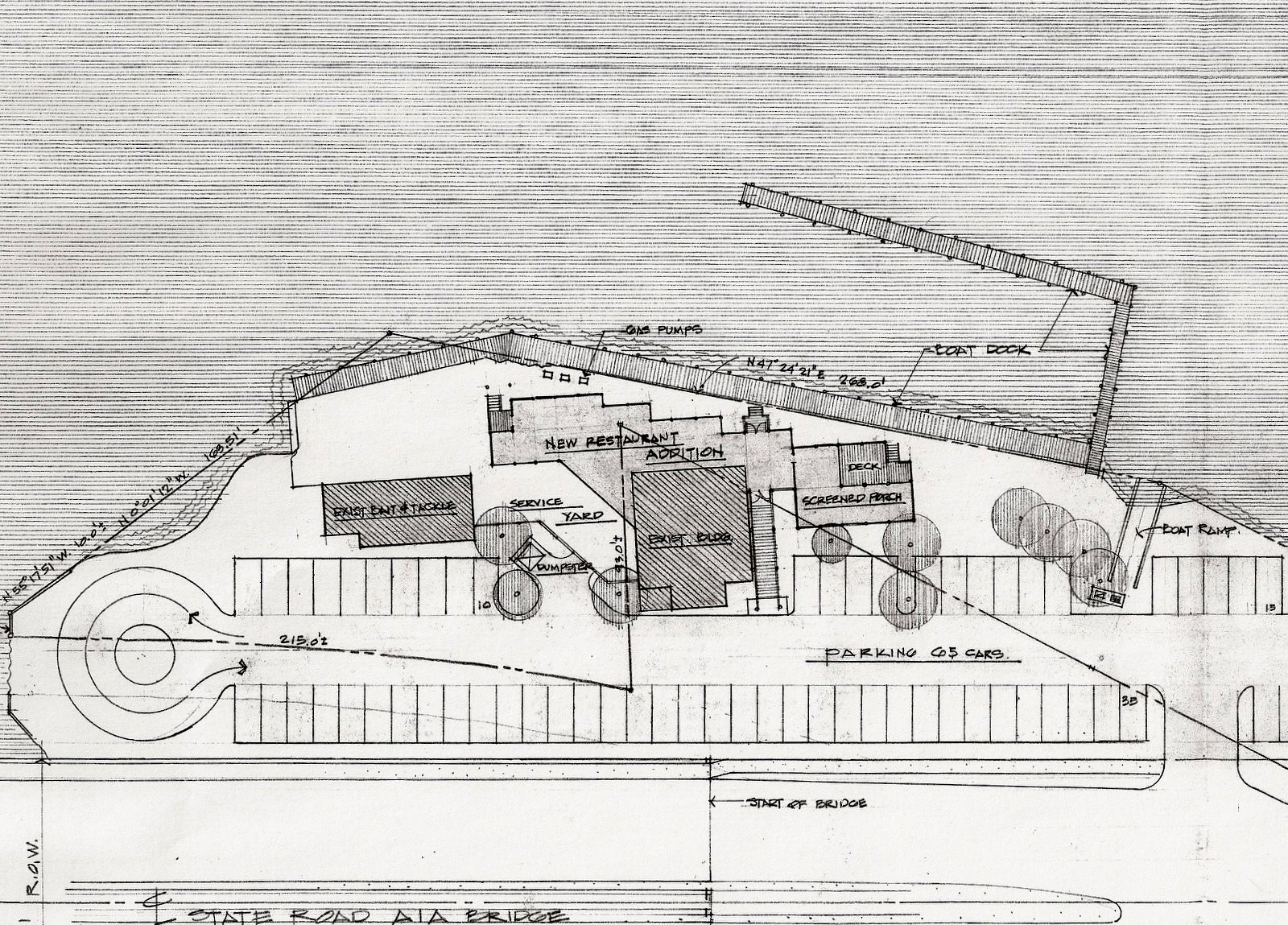 The site was a narrow strip of land between a bridge ramp of US#A1A and a defunct marina. One of the existing buildings on the property was incorporated in the design as the kitchen and restrooms. The added two story part of the structure was dinning on the first level and the bar/lounge on an upper level balcony. Screened porch dinning was also available.