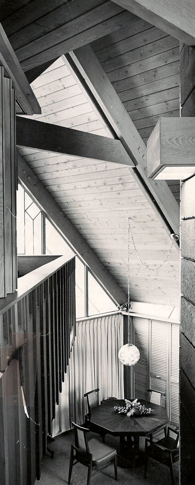 The living/dining/entry area is defined by a 45 degree sloping gable roof with a flat roof screened porch at the low end. The Kitchen, Utility and two bedrooms are angled 45 degrees from the Living Room, as well as the Master Bedroom above, which is opened to the living space below and to a large roof deck overlooking the inlet and ocean.