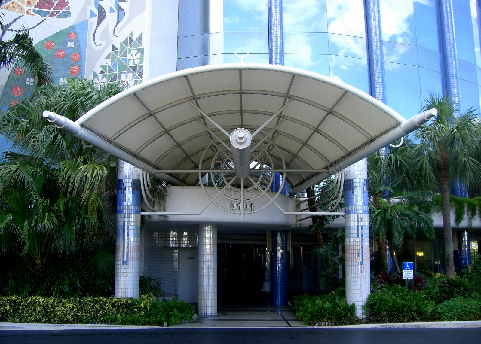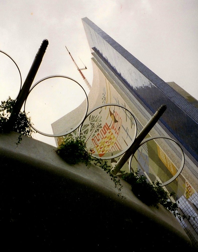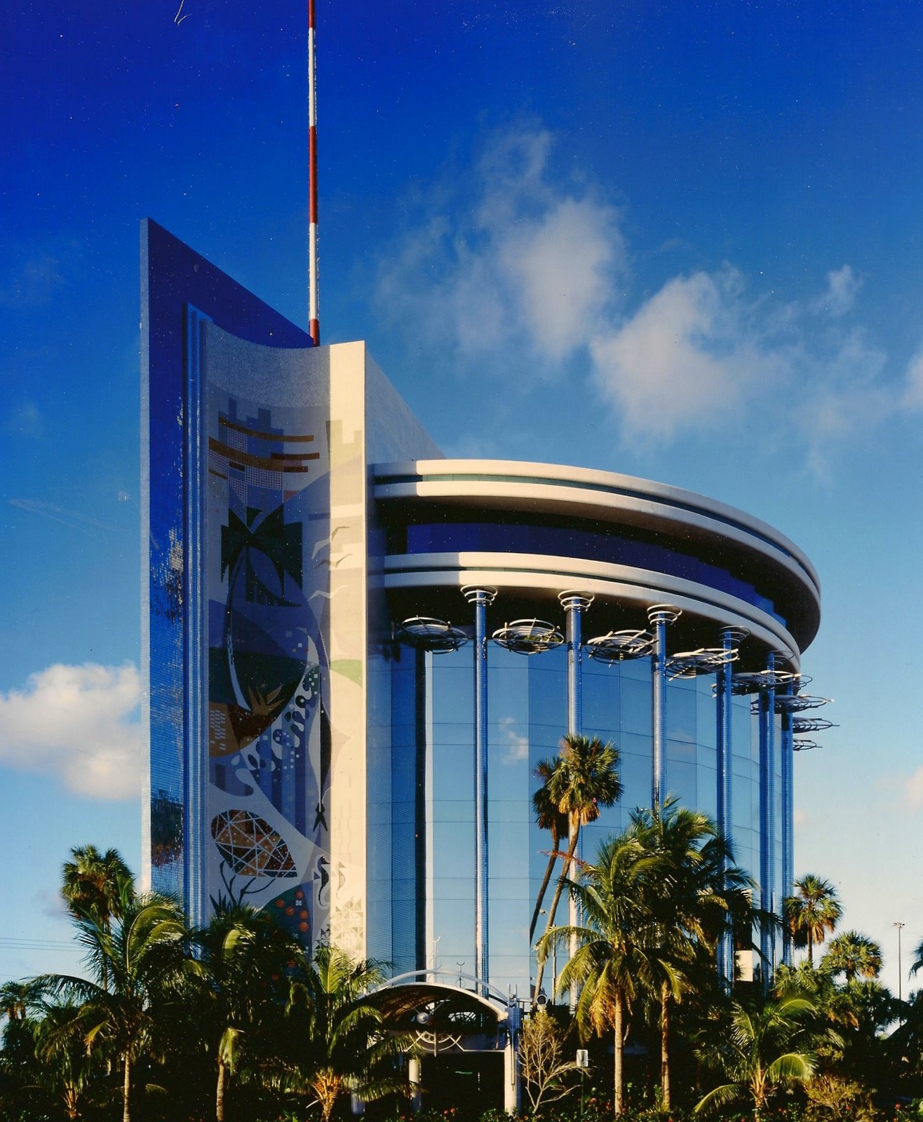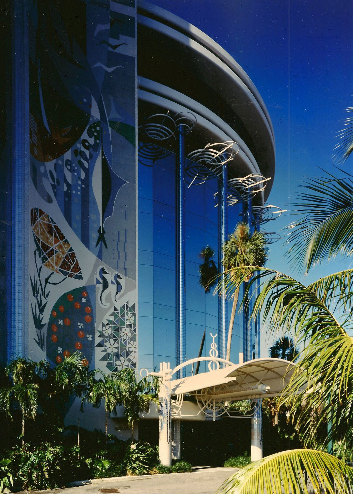 All of the materials and colors were derived from the two mosaic tile murals. A metallic reflective blue tile was chosen for the primary vertical elements and a similar white tile for surfaces adjacent to the murals. Glass on the second through sixth floors is reflective silver, the first and seventh floors are clear, and are set back to compensate for square footage gained by filling in what was an open central core on all floors. The eighth floor is blue. The effect is very sensitive to changing weather and time of day, becoming blue on a bright day, platinum on a grey day and bronze at sunset.
