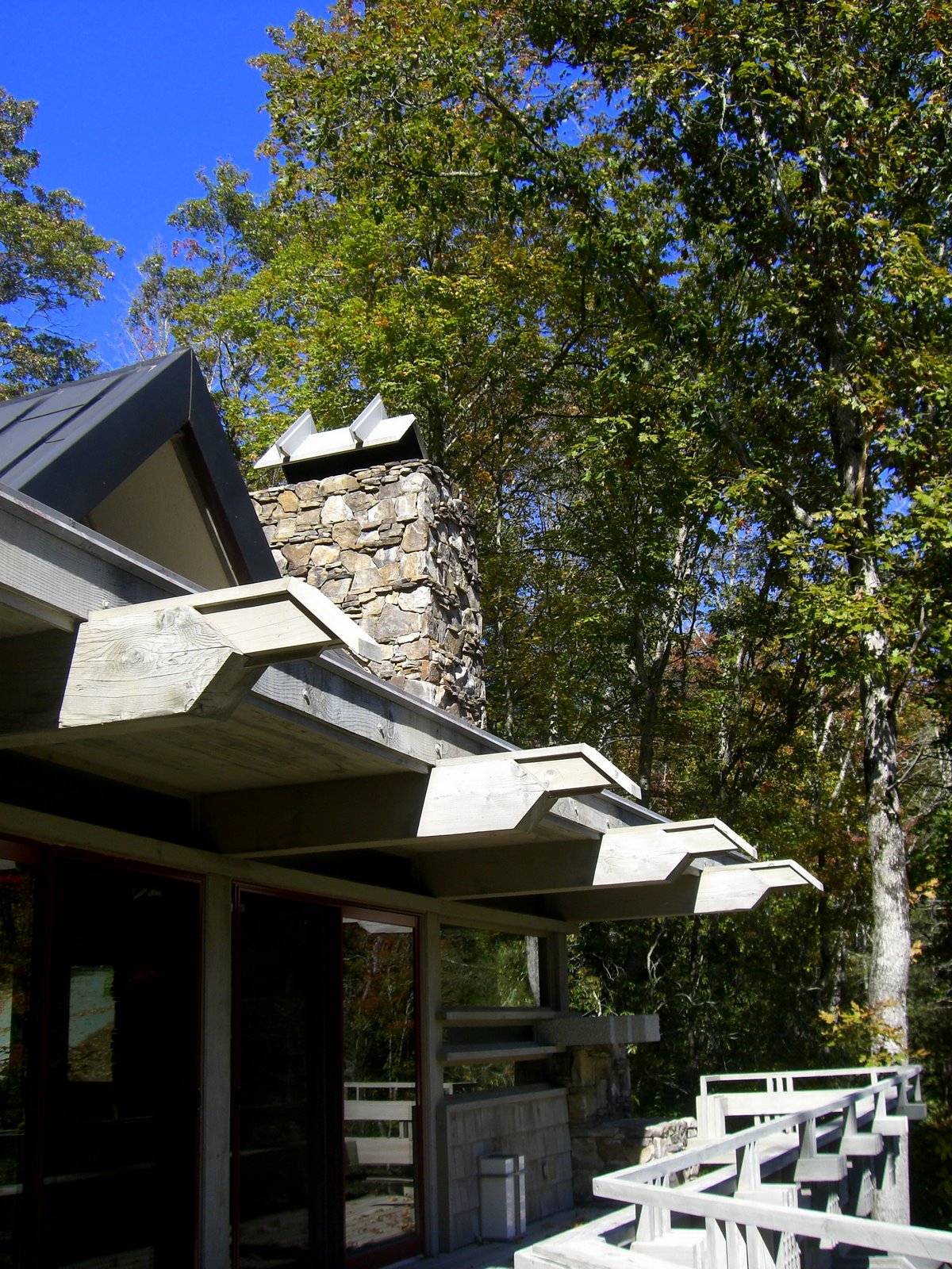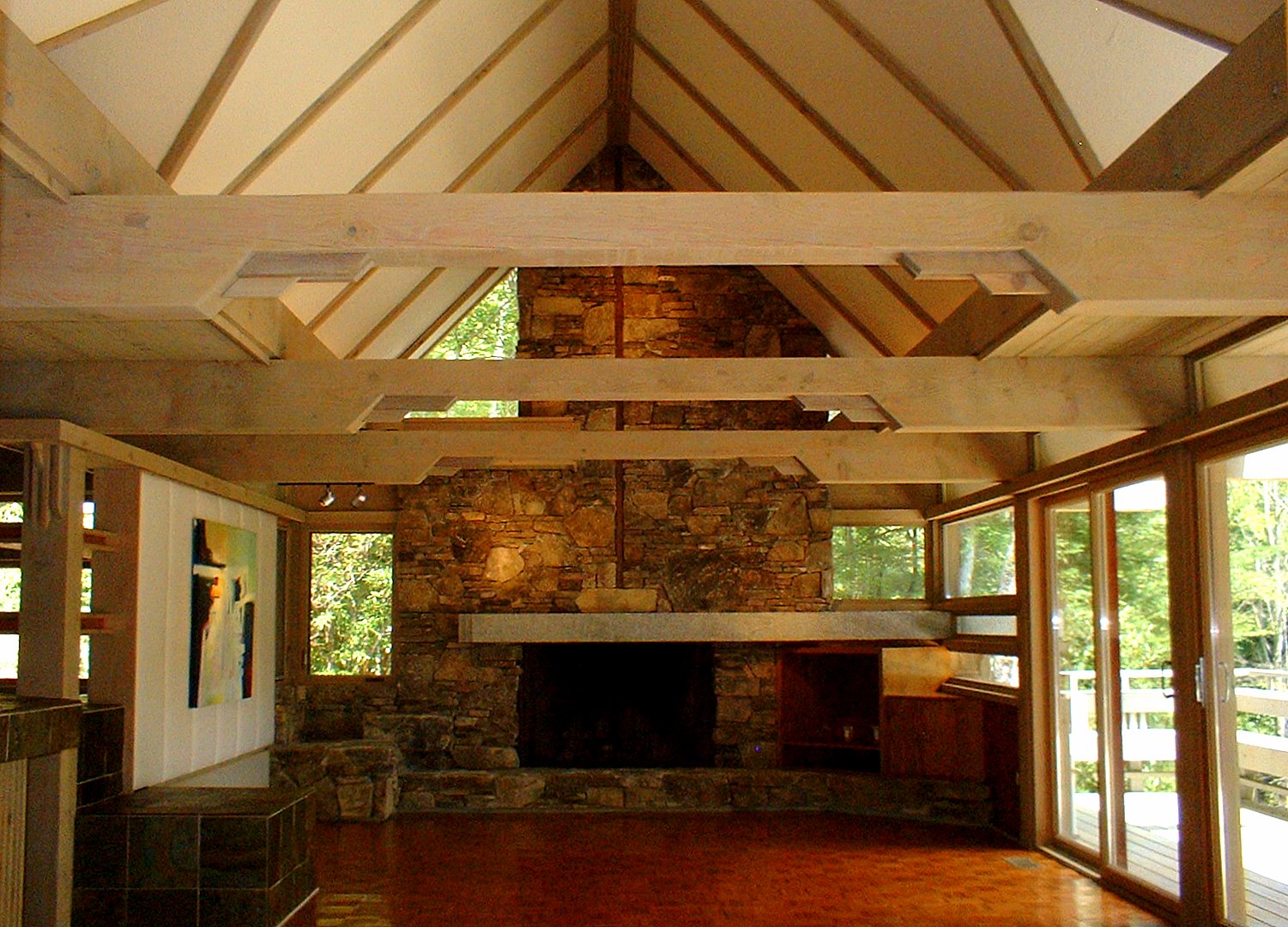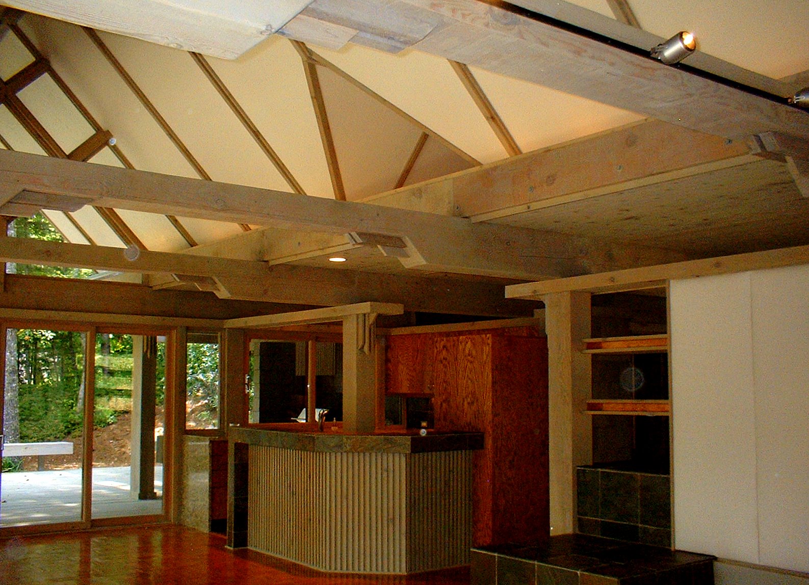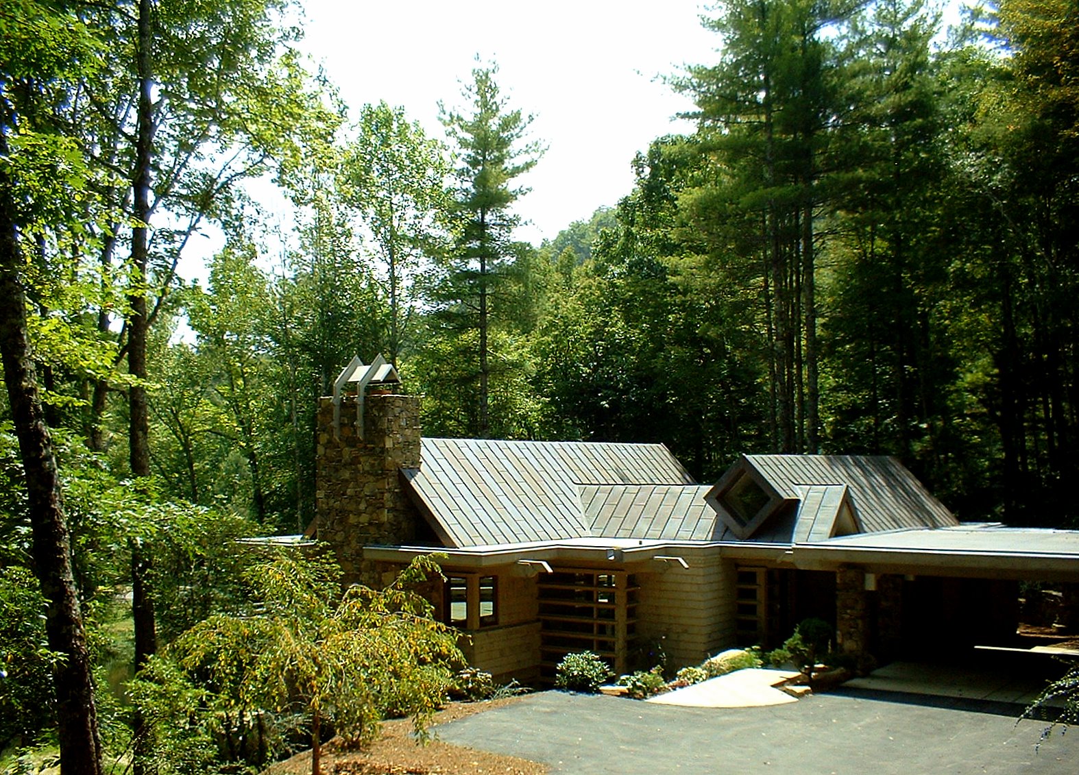 The structural system is basically post and beam heavy timber with SIPPS (structural insulated plywood panels) panels spanning between the beams, and leaning against each other to form three gables of graduating sizes (Living/Dining, Master Bedroom and Entry) A flat roof connected the spaces between. Finish Materials are Cedar shingles, Tennessee Sand Stone and copper roofs.