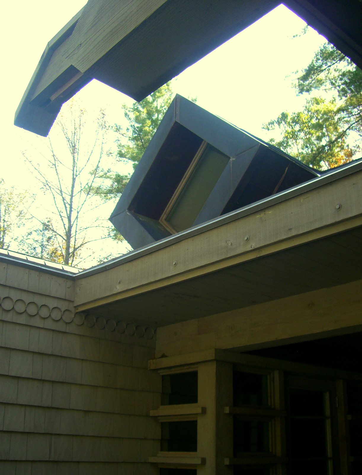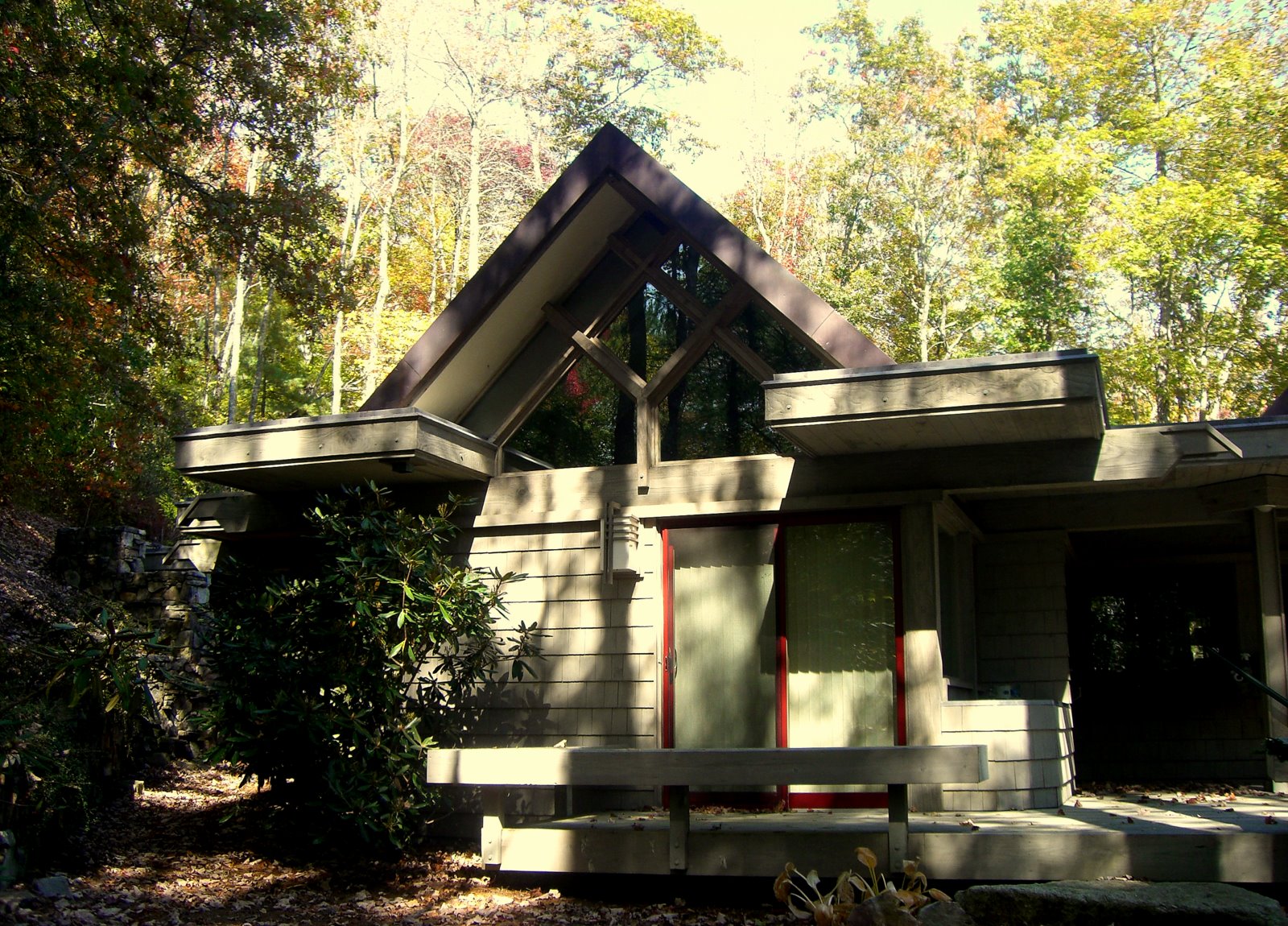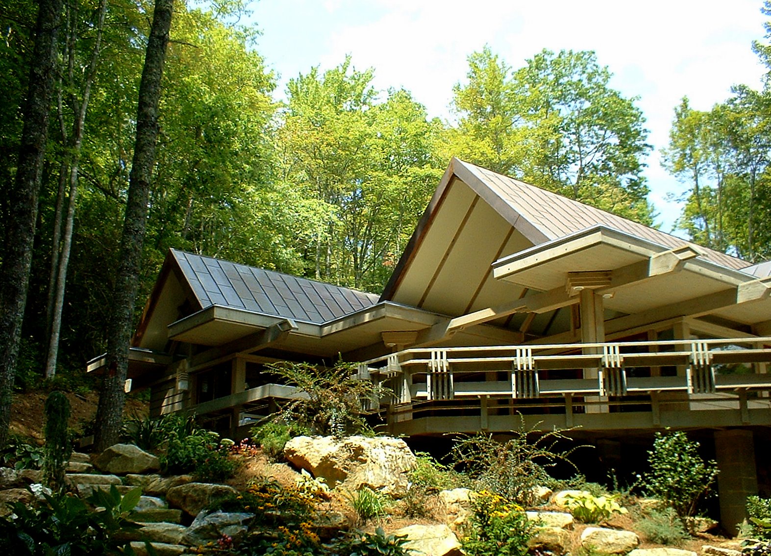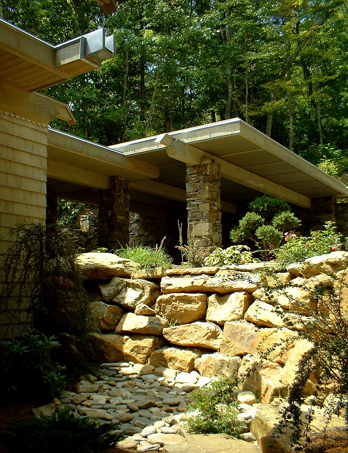 The structural system is basically post and beam heavy timber with SIPPS (structural insulated plywood panels) panels spanning between the beams, and leaning against each other to form three gables of graduating sizes (Living/Dining, Master Bedroom and Entry) A flat roof connected the spaces between. Finish Materials are Cedar shingles, Tennessee Sand Stone and copper roofs.