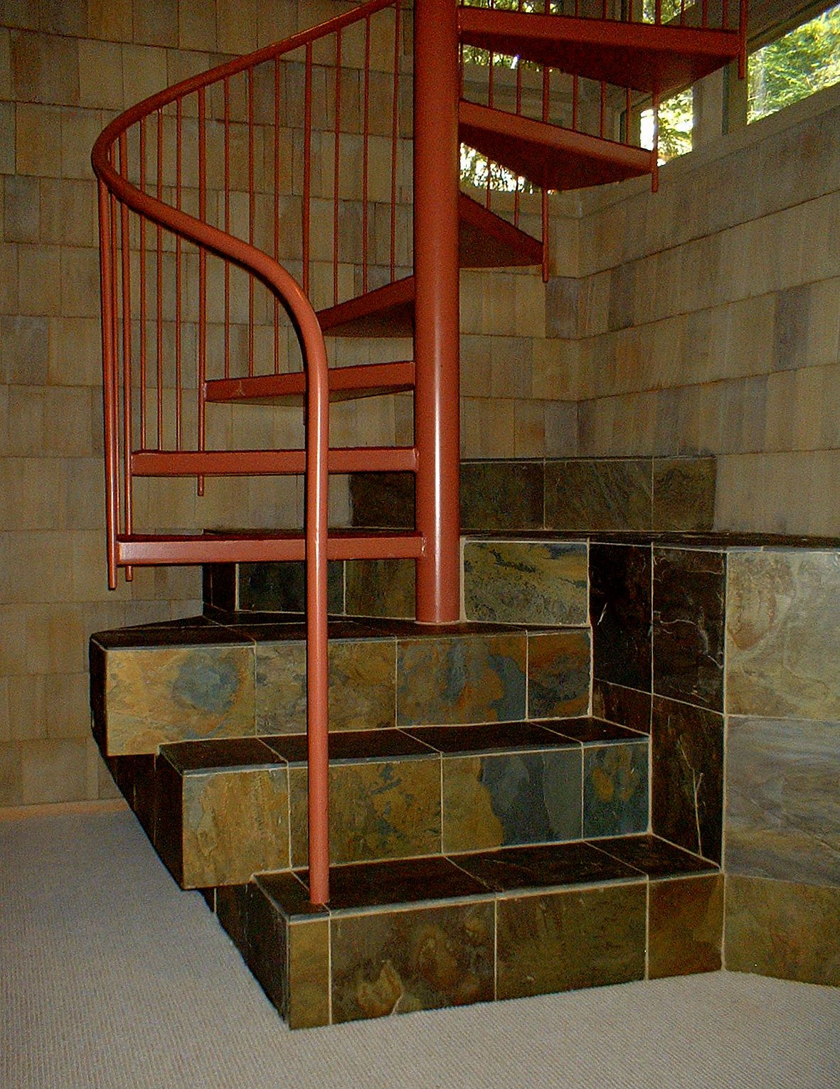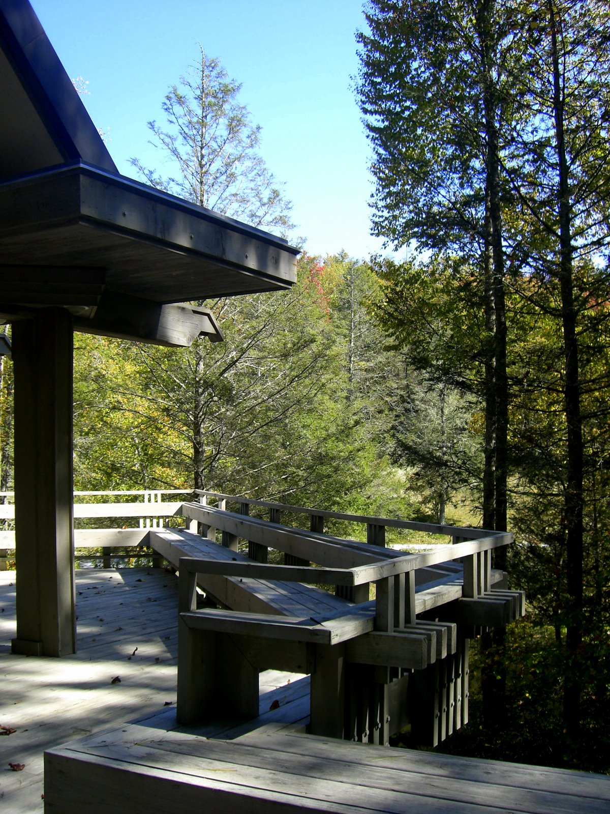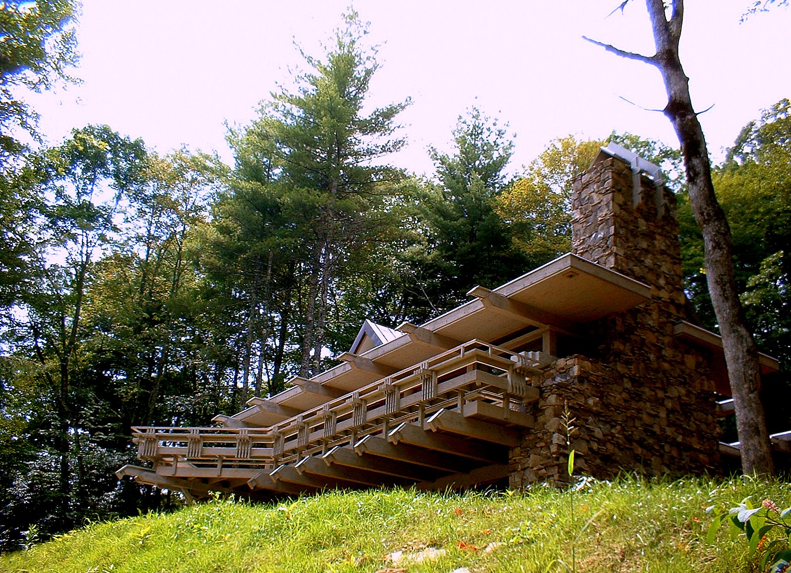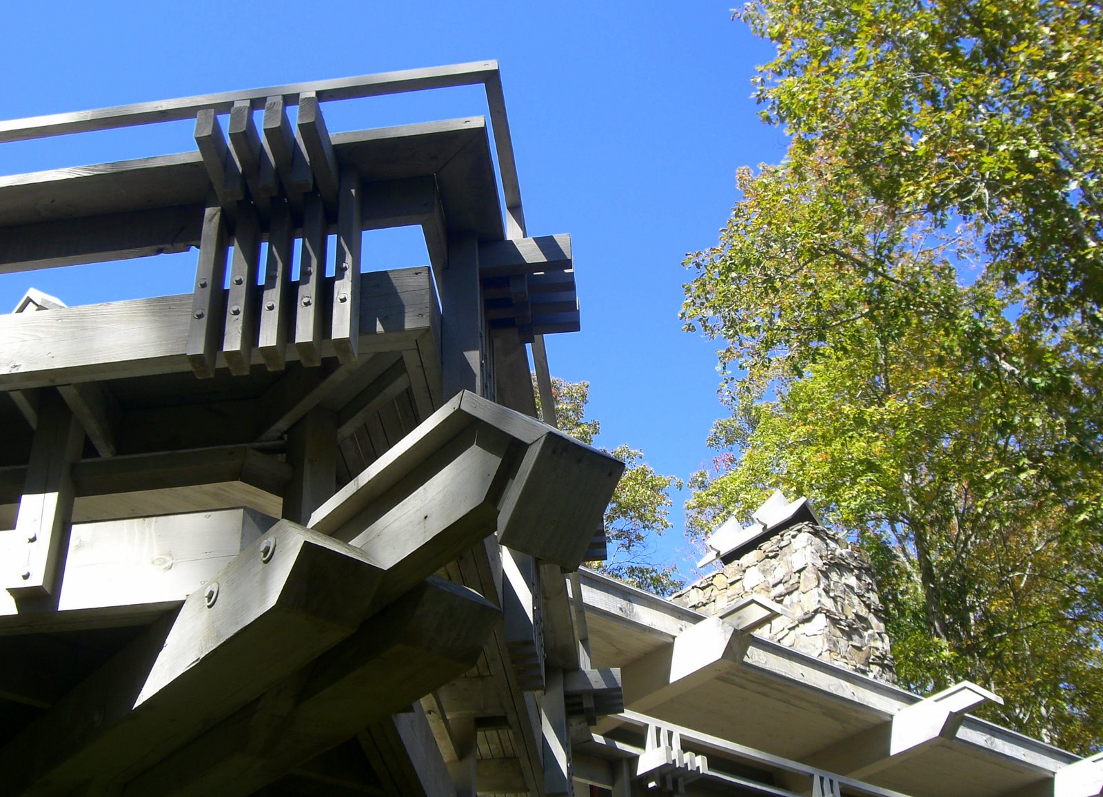 The structural system is basically post and beam heavy timber with SIPPS (structural insulated plywood panels) panels spanning between the beams, and leaning against each other to form three gables of graduating sizes (Living/Dining, Master Bedroom and Entry) A flat roof connected the spaces between. Finish Materials are Cedar shingles, Tennessee Sand Stone and copper roofs.