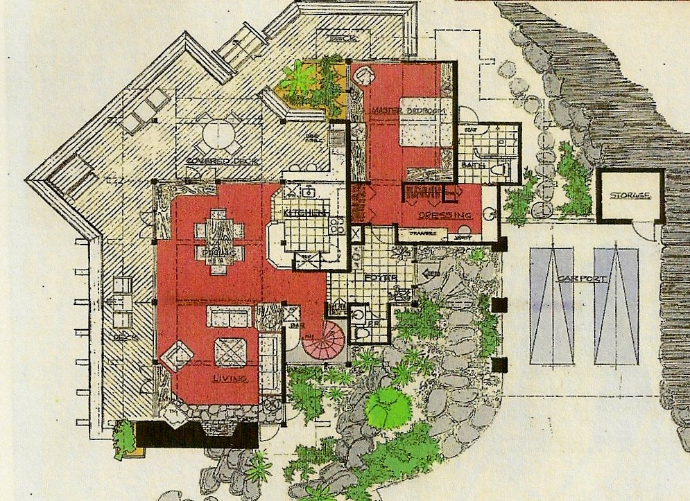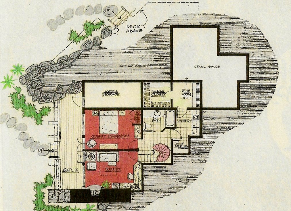 The lower level, two bedrooms and utility areas was built into the sloping site. The main living areas and master bedroom were above, opening to a surrounding deck and overlooking a pond, while the entry and carport were cut into the hill.