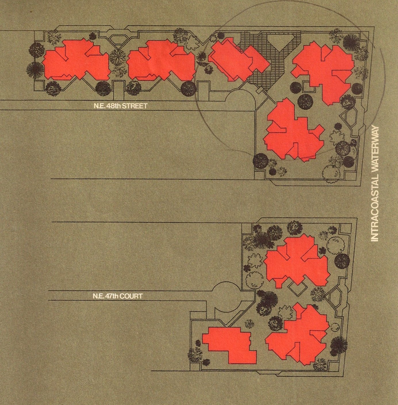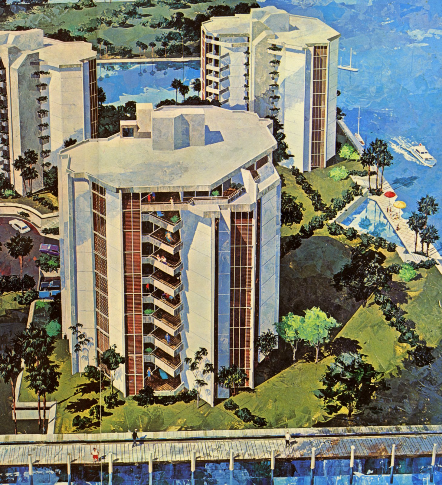 The client was a local developer, a past client for The Pumpkin Shell and Middle River Apartments and the owner of the Kenann Building, which we would radically remodel many years later. We had completed working drawings for the first three towers, of which was to be a total of ten, connected by continuous parking beneath a landscaped base. There were two different floor plans with each unit having a step down living room and a large outside terrace. Three elevators would serve the three units per floor and open directly into each foyer.