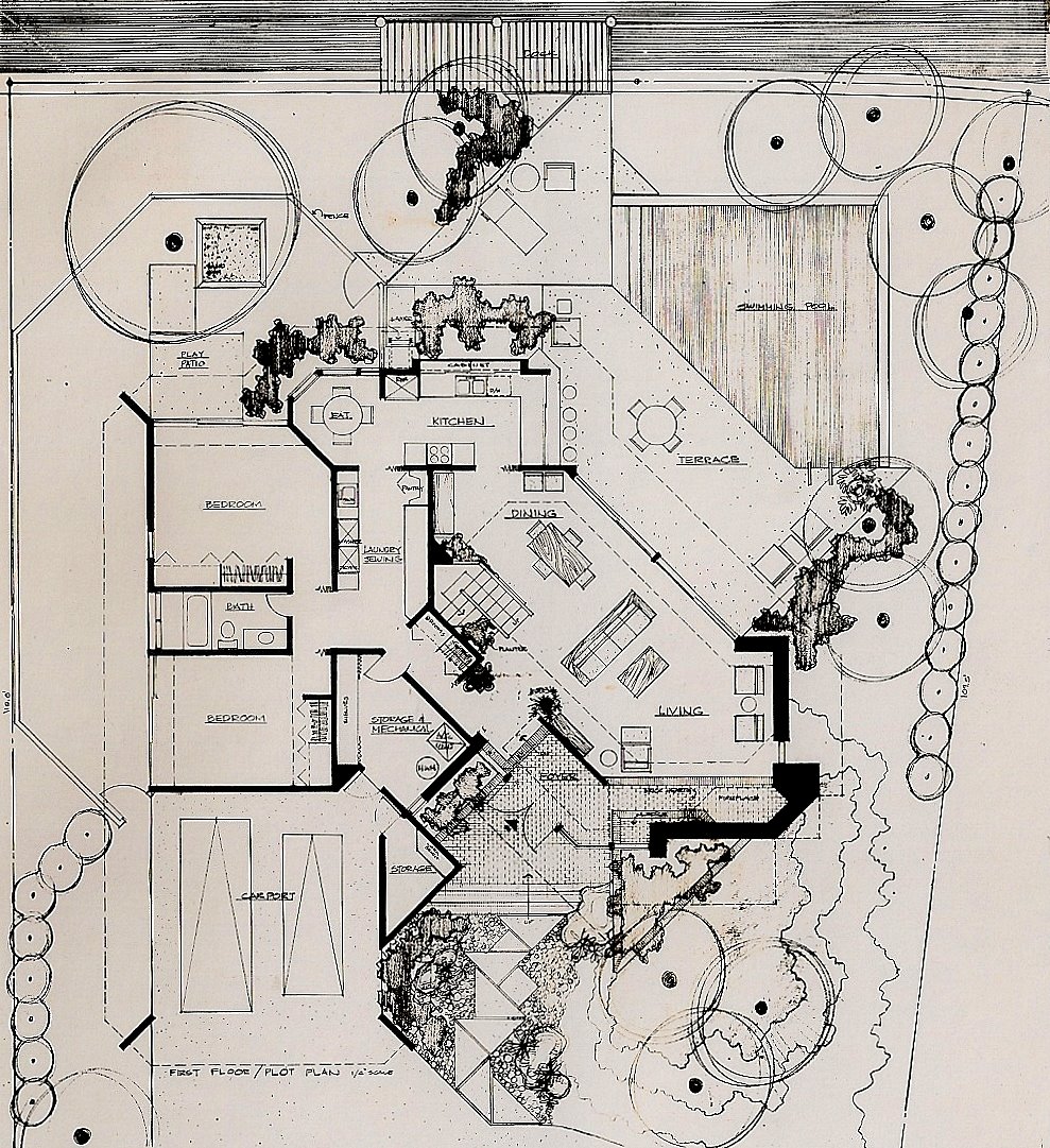 The client was a newly married old friend. The exterior design was an interplay of shingled forms and brick vertical elements…….basically flat roofs with a gable roof over the main living space. The brick floor of the outside entry and foyer carried thru and became the hearth of the massive brick fireplace. The master bedroom was on the second floor, overlooking the living room, and was connected by a bridge to the library, which was an open balcony over the fireplace.