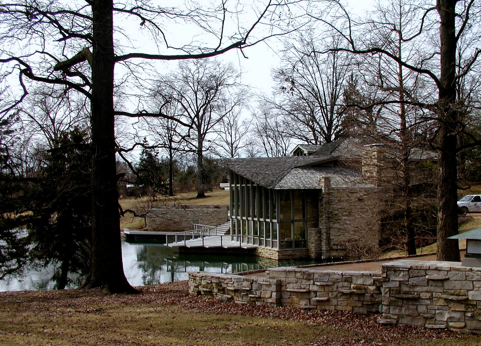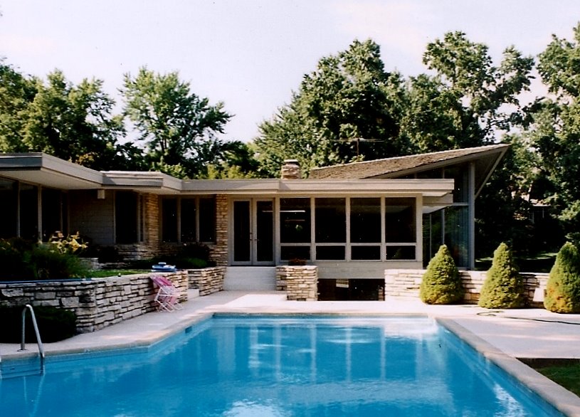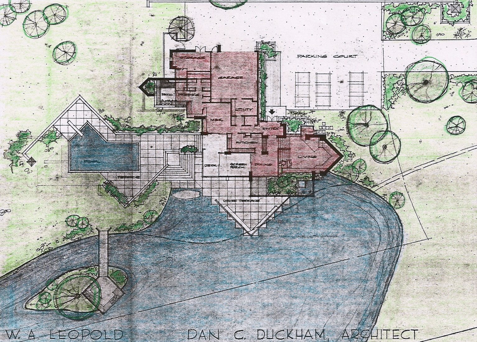 The several roof levels are flat, and a diagonal sloping gable defines the main space. The owner died before the construction was finished and his widow lived there for many years, near her family. Eventually a new owner remodeled including a second floor addition, but the character of the original design remains.