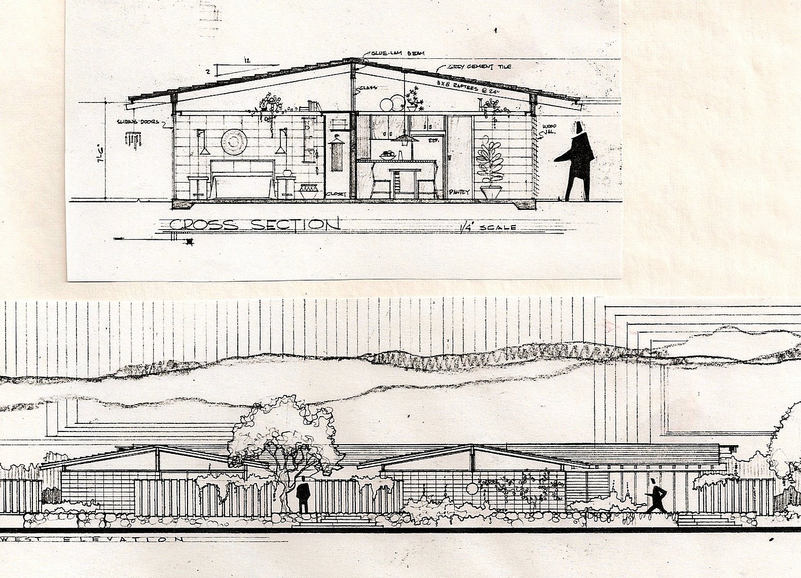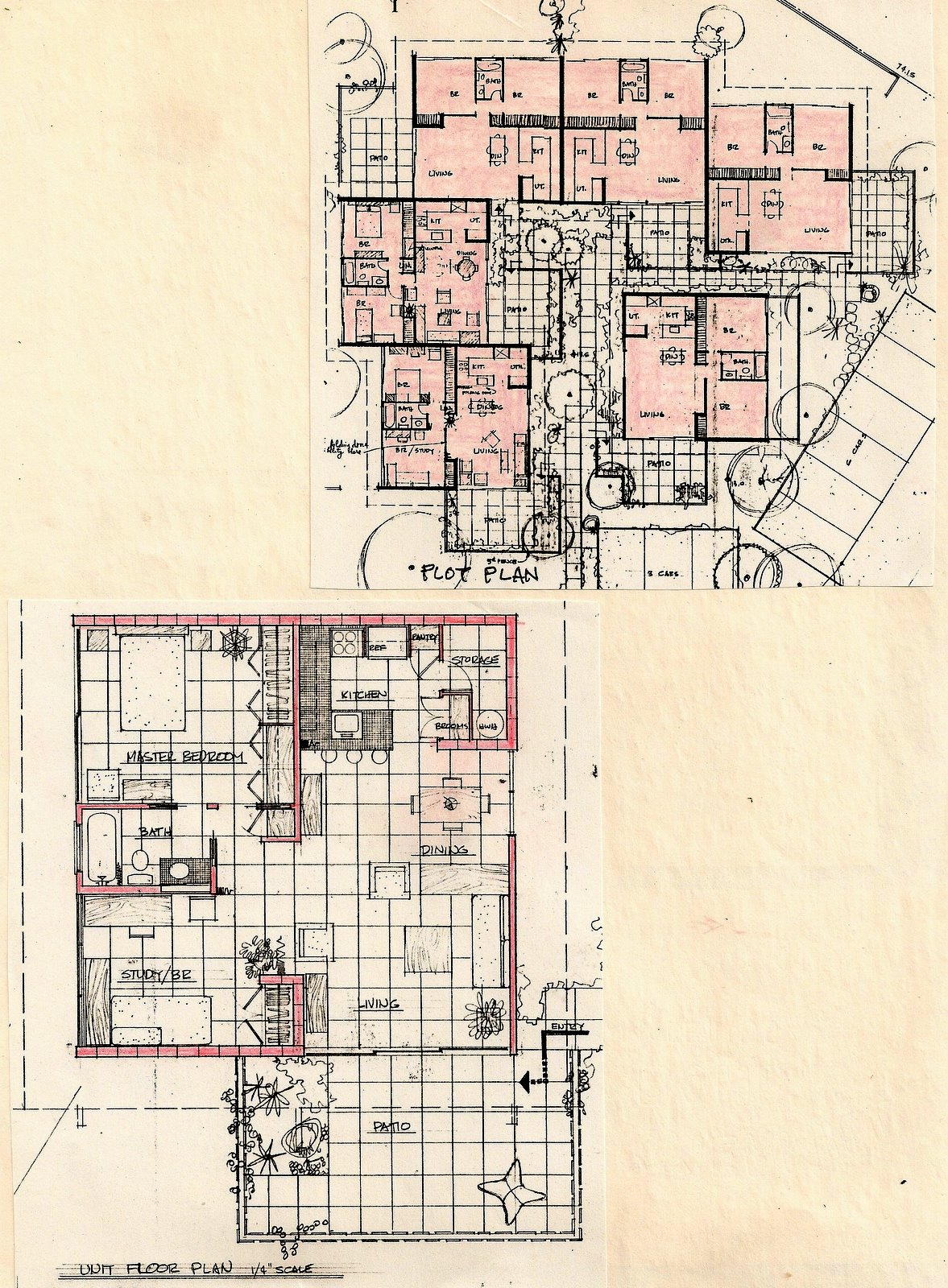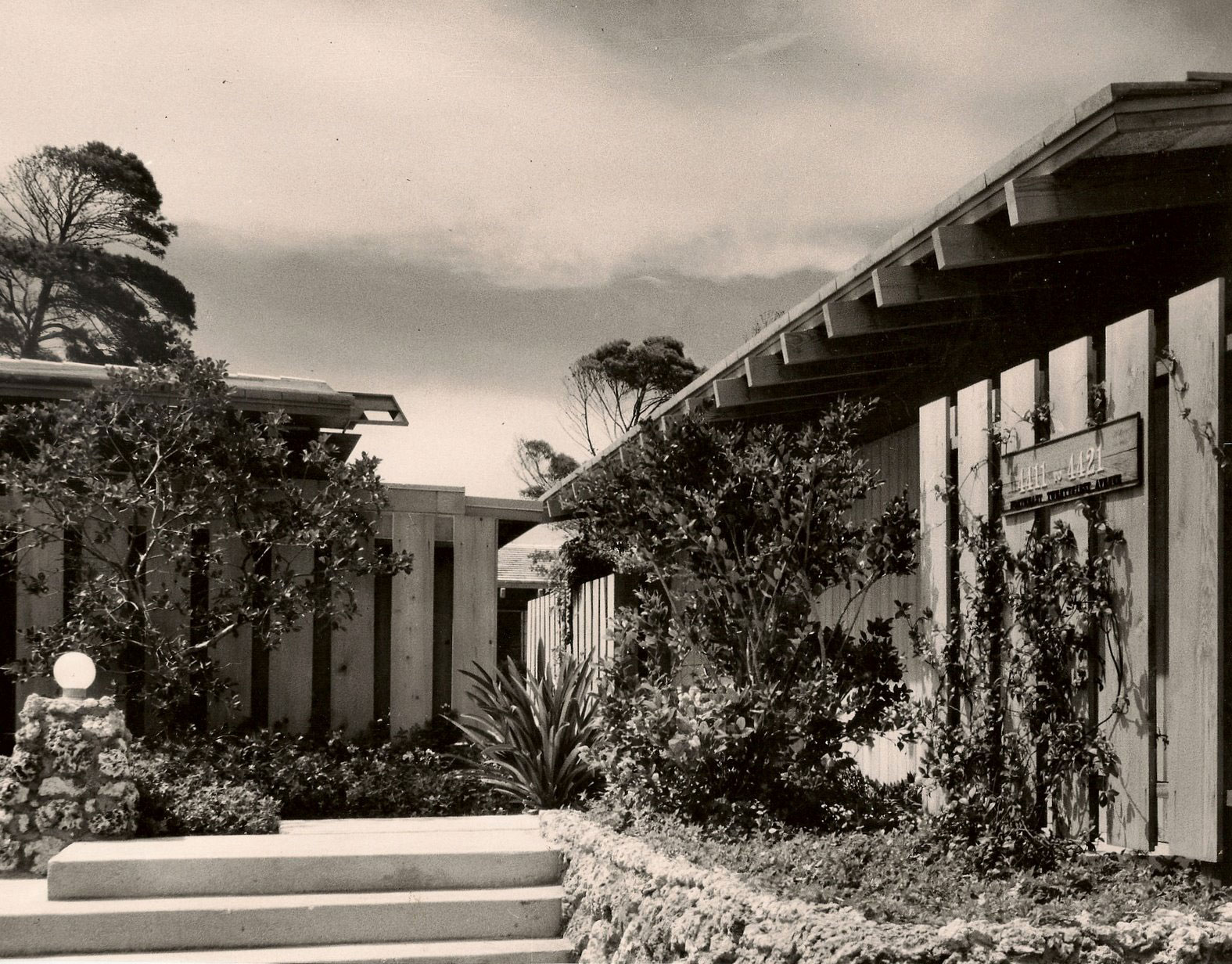 This six unit rental apartment project was sited on a corner lot. It was thought of and designed as a cluster of little attached "houses", accessed from both street fronts by a common garden. Each had a private fenced Patio and a grassed back yard.
