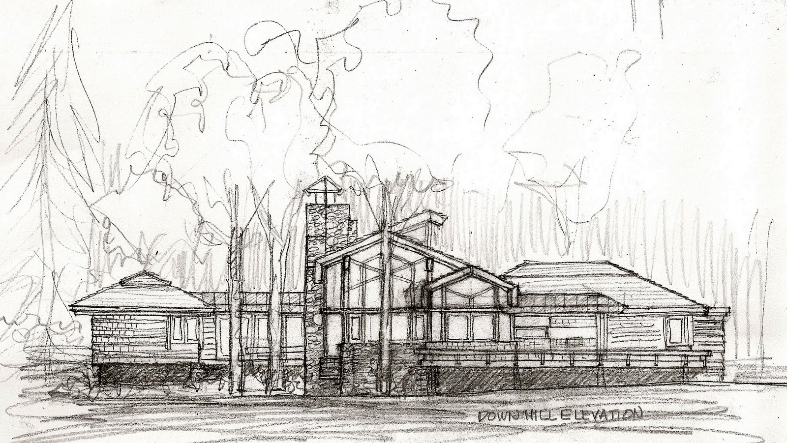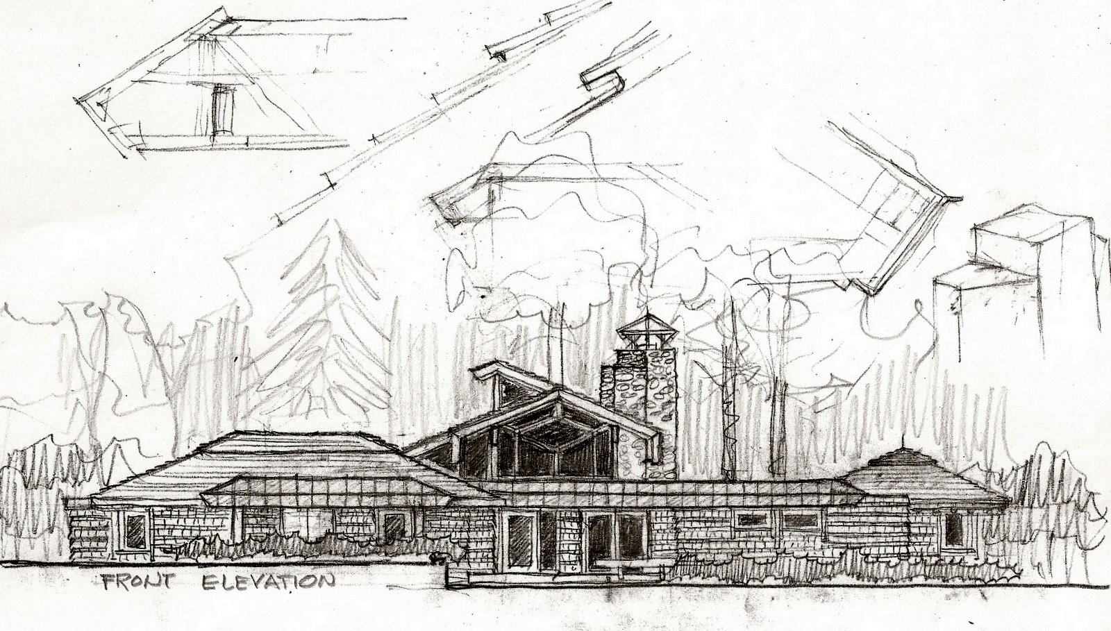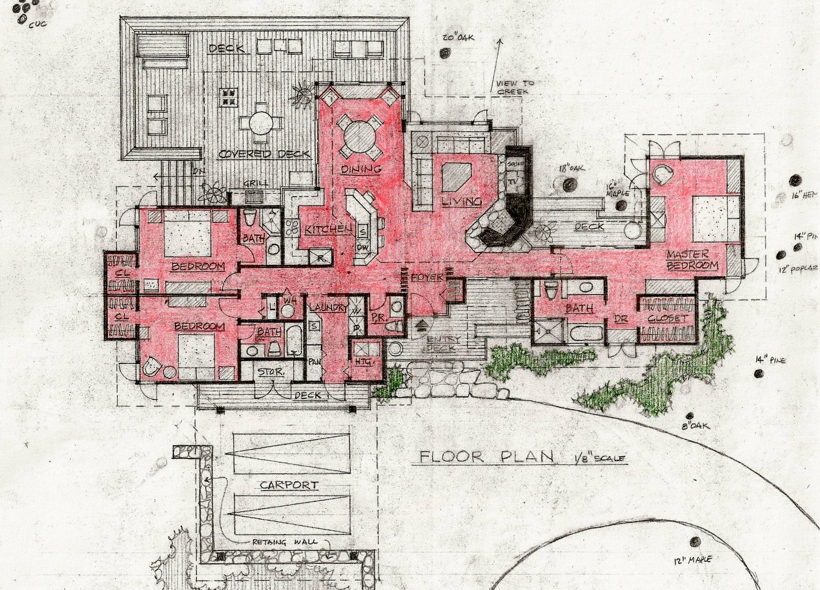 This was to be a second spec house in my development, Laurel Springs…….hip roofs over bedrooms, high gable roof over living/dining/kitchen, stone fireplace, shingled walls and wide copper fascia on flat roofs over carport/master bath/covered deck.