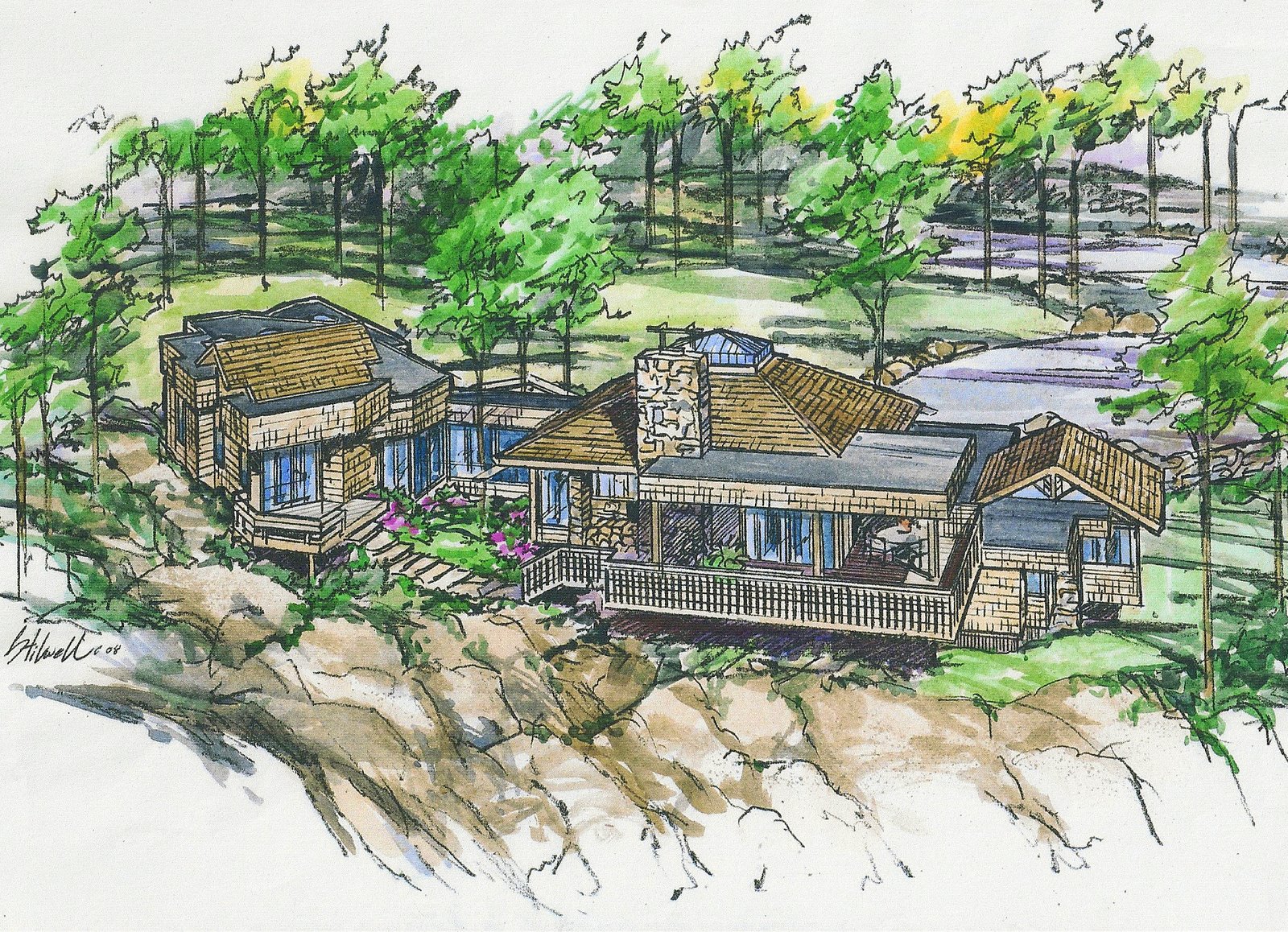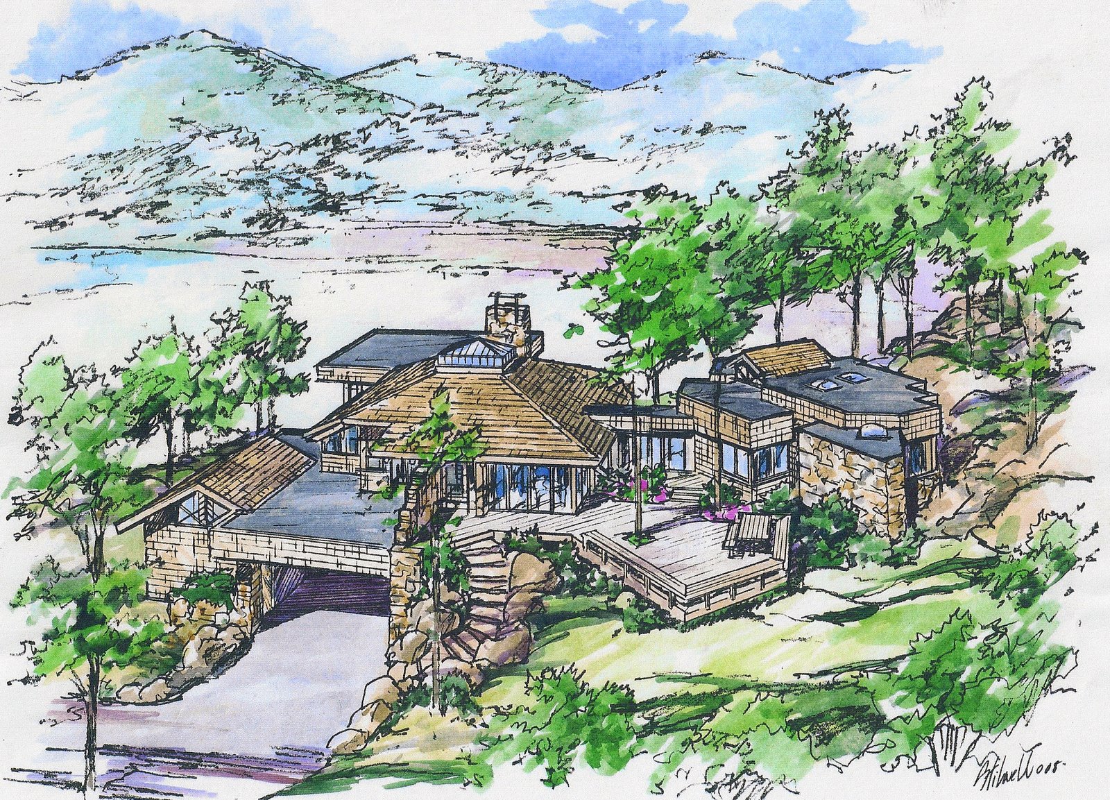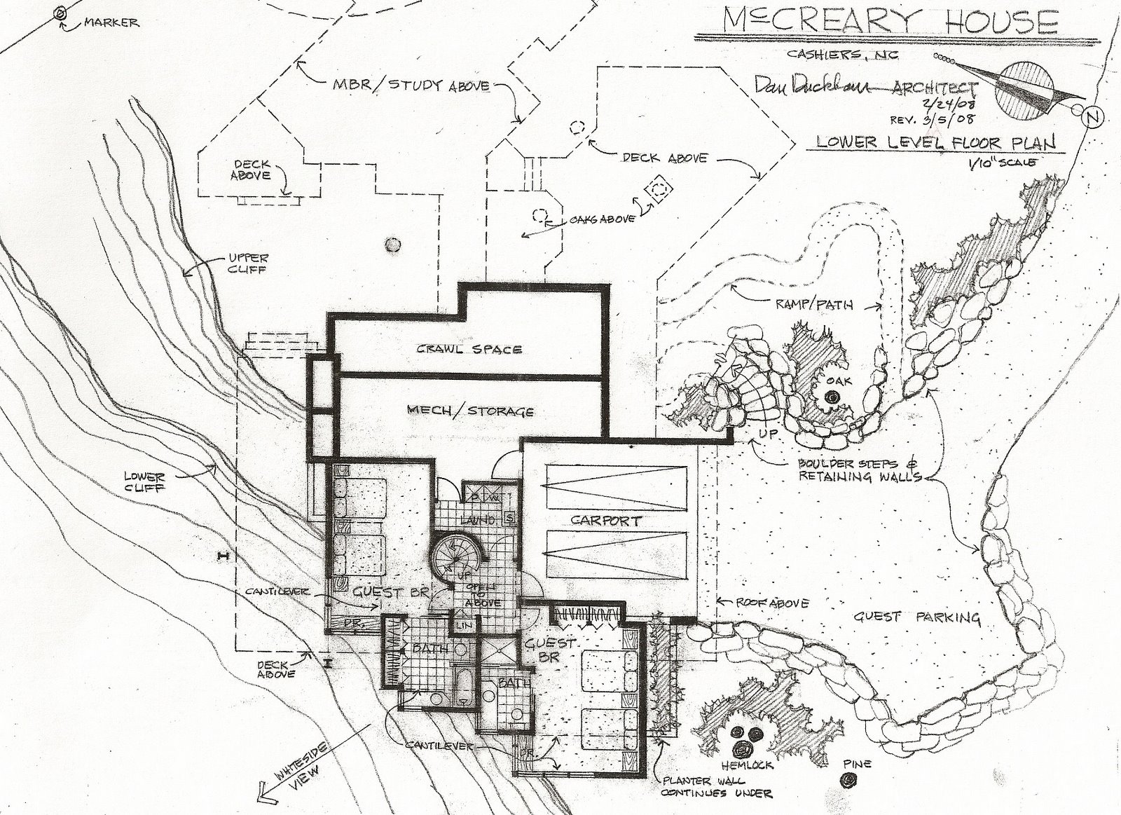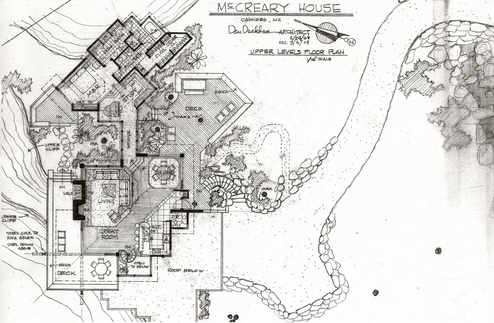 The client owns a 2 ½ acre parcel of land that is severed by a cluster of steep rock cliffs and has a dramatic rocky creek over which the entry driveway passes. The house site is up a hill, on the edge of the cliff, and overlooks a magnificent panoramic view of Whiteside Mountain and the valley below.