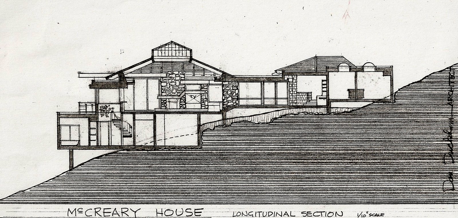 Several windswept Oak trees occupy the site, so the master bedroom suite is separated from the main living area to accommodate the Oaks and is connected by an enclosed bridge. The Great Room is defined by a hip roof with a central skylight structure and two guest bedrooms and a carport are on a level below. Materials are stone and Cedar shingles.