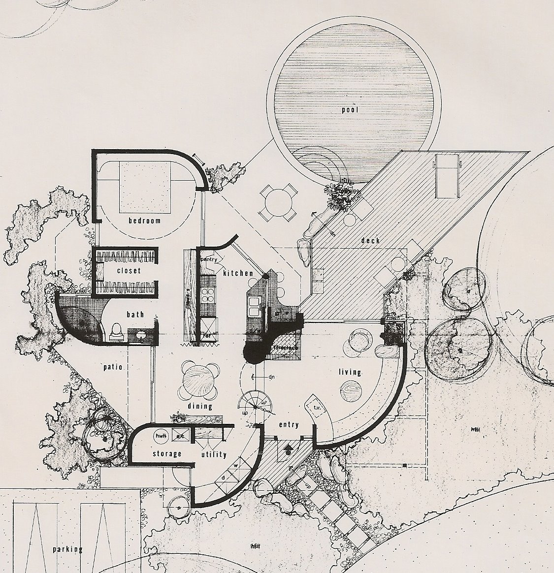 This small bachelor house is a composition of shingled circular enclosing forms, enclosed primarily by a long sloping shingled roof. This roof starts low over the Living Room and slopes up to include a Study over the stepped down Dining Room, accessed by a circular stair.