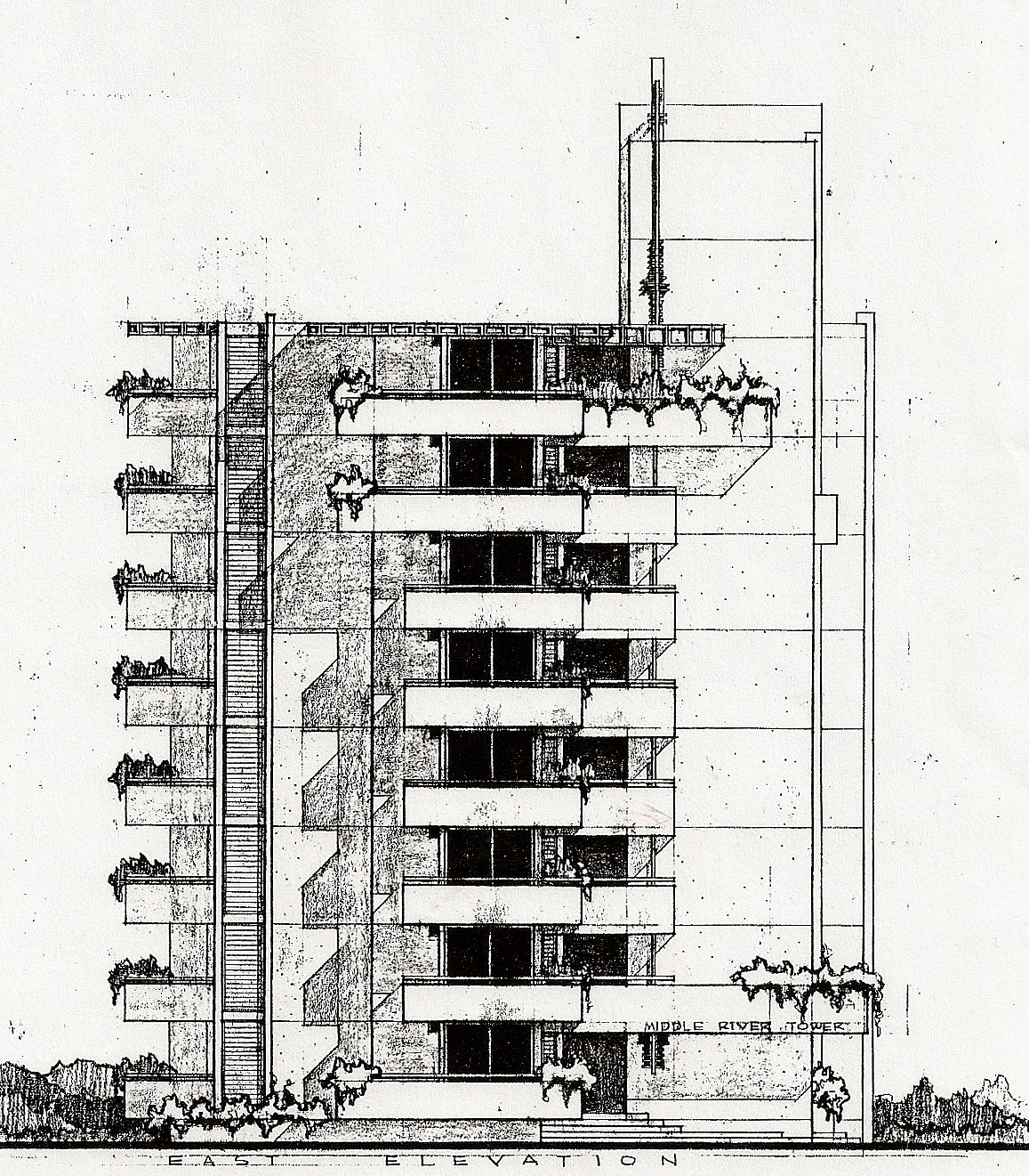 The client was a repeat client from the Pumpkin Shell Apartments (1964). The project was a 30 unit rental apartment, and 10 stories high. It was located on a wide section of Middle River and all of the surrounding buildings were low. It would have been very attractive to the rental market.