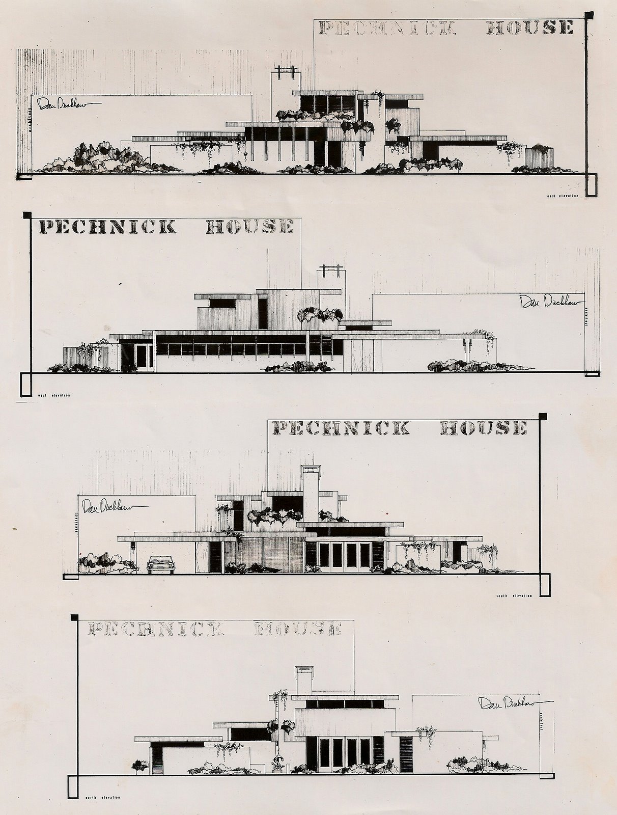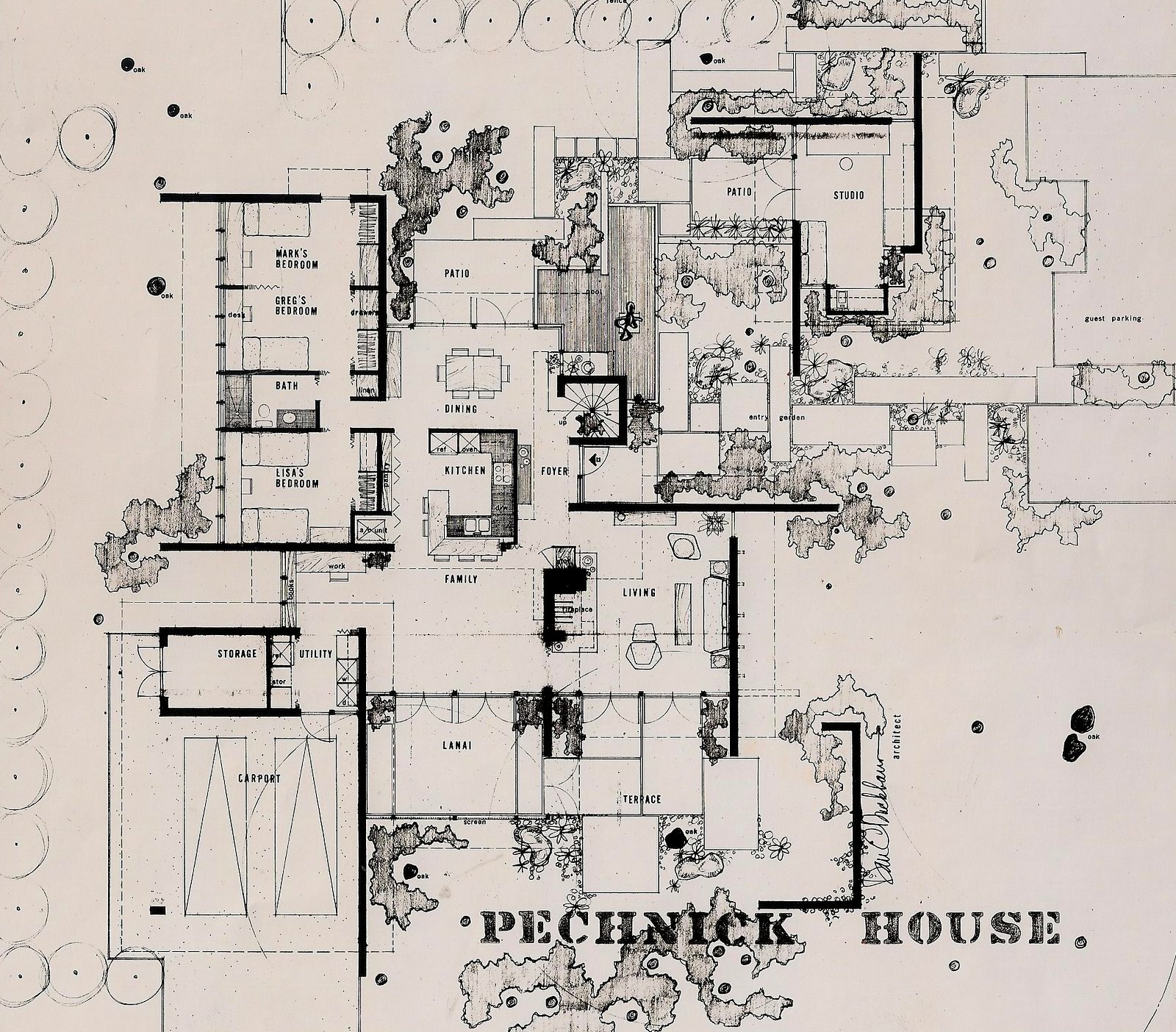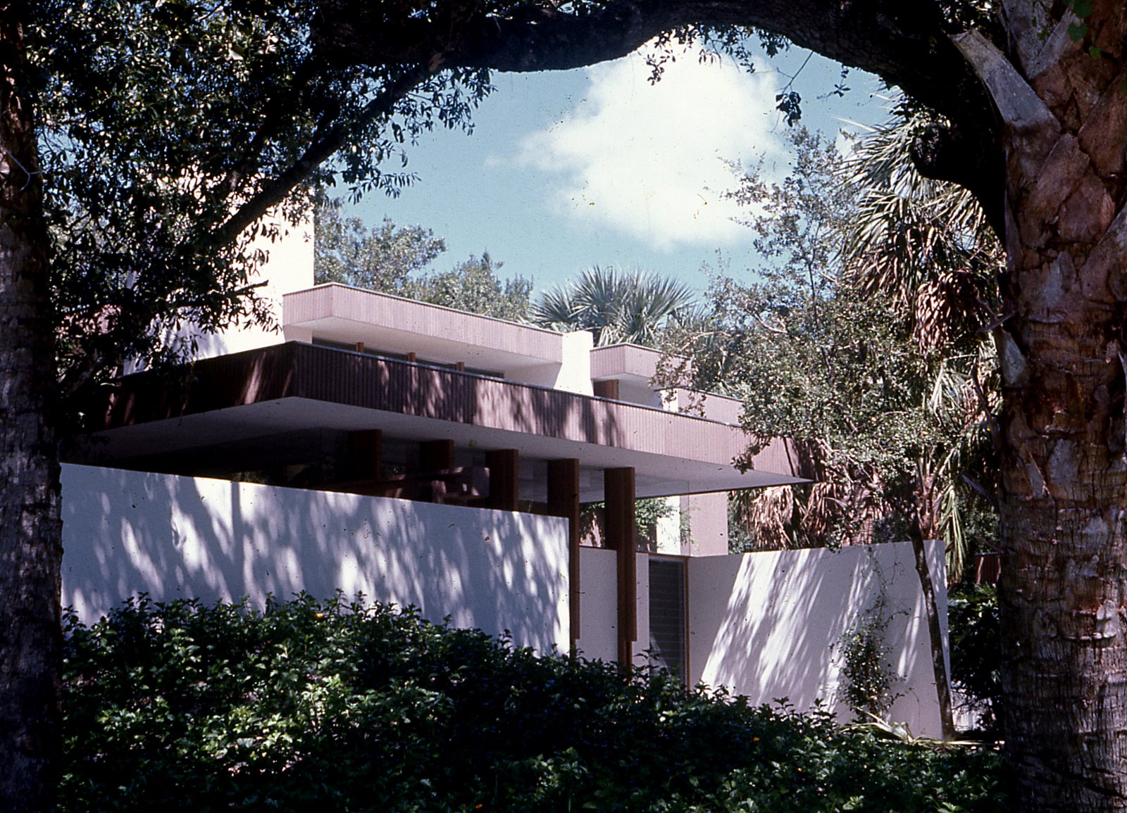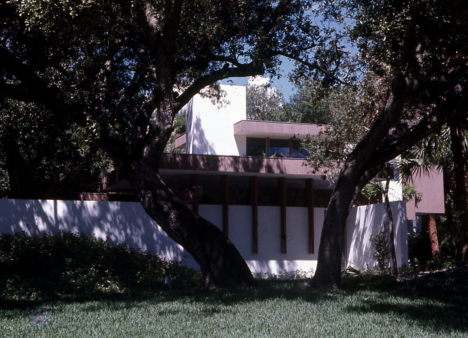 The site was a wooded corner lot with numerous mature Oak trees and Sable palms. The plan managed to save almost all the trees. Vertical planes were the key elements in defining space, along with multiple horizontal roof planes. The fireplace and stairs were the main vertical forms around which to compose the horizontal planes. The house had a fire many years later and was subsequently demolished.