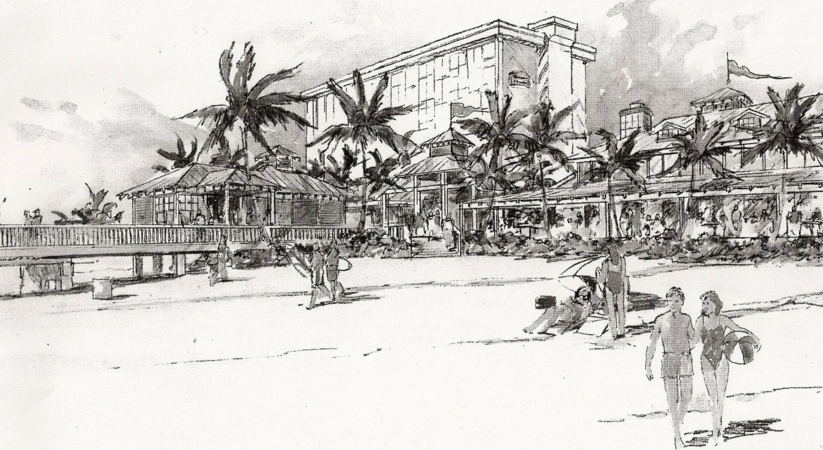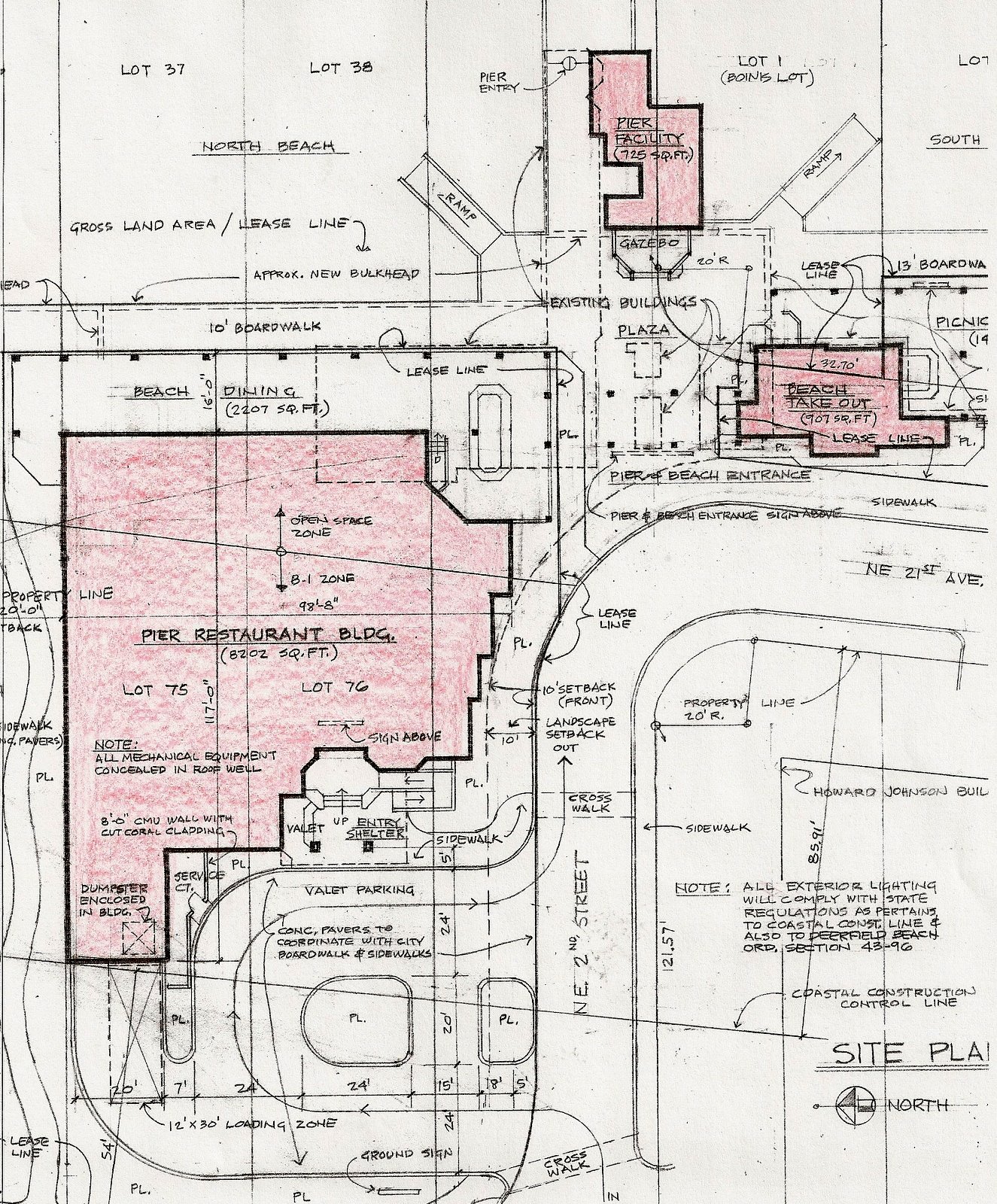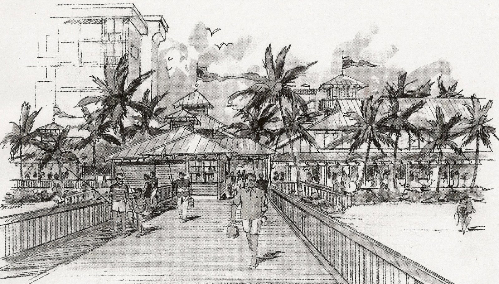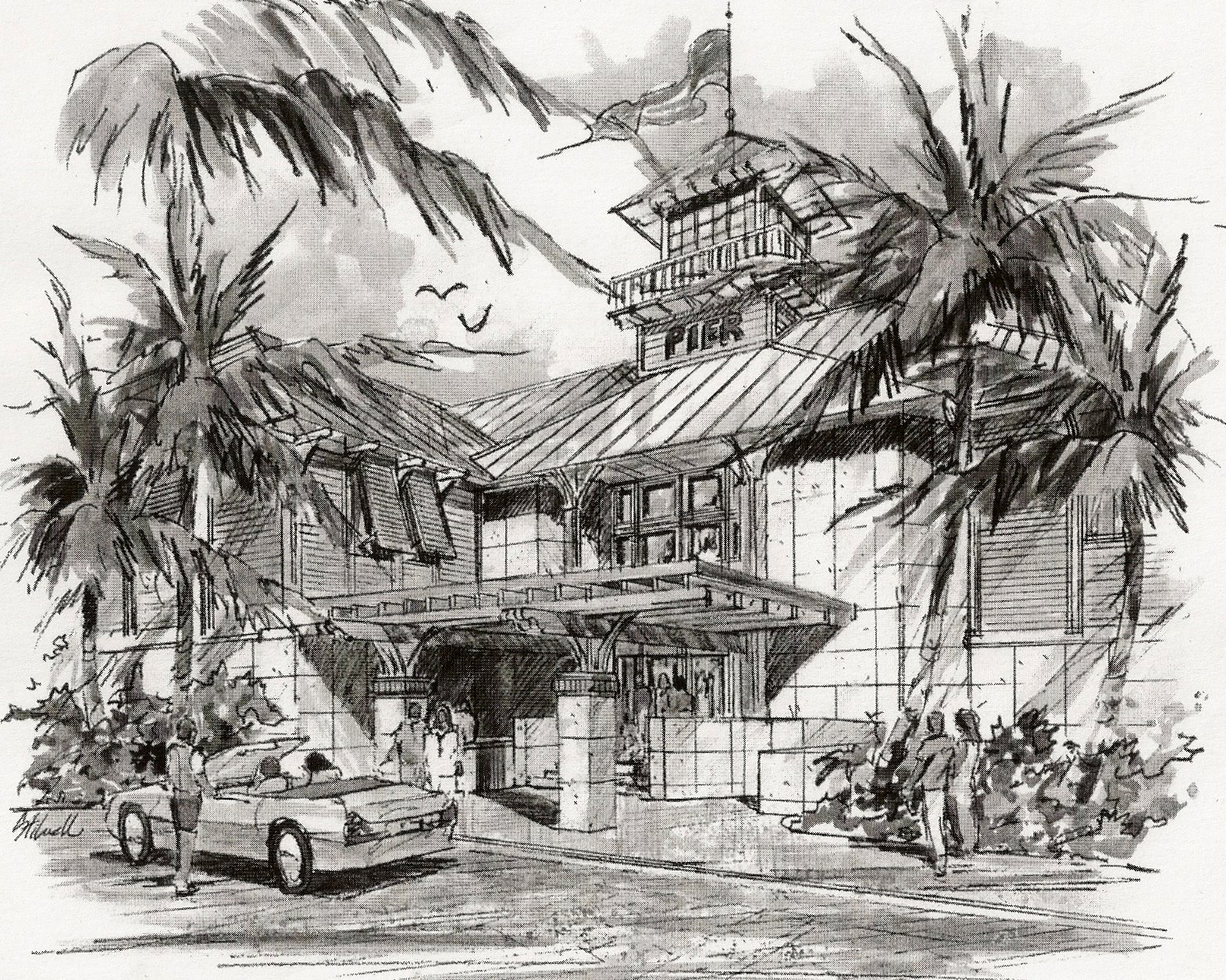 This project was to be a large two story restaurant/bar to be located on a parcel of land that was occupied by a parking area and a small restaurant which was attached to the fishing pier entrance structure. It would also have included an all new and improved pier entrance, and beach take-out/covered picnic structure……a very generous offer and a big win for Pete.