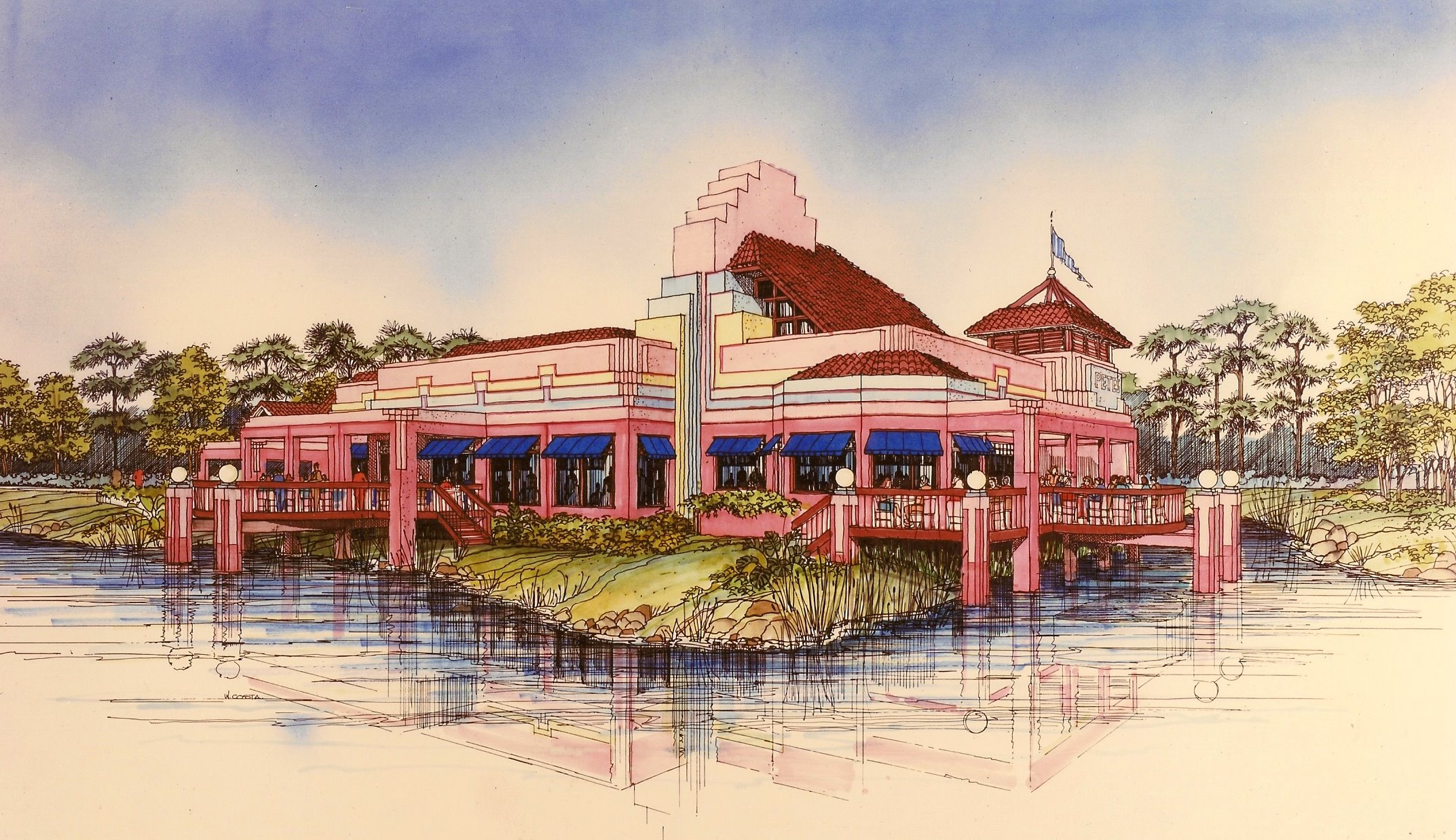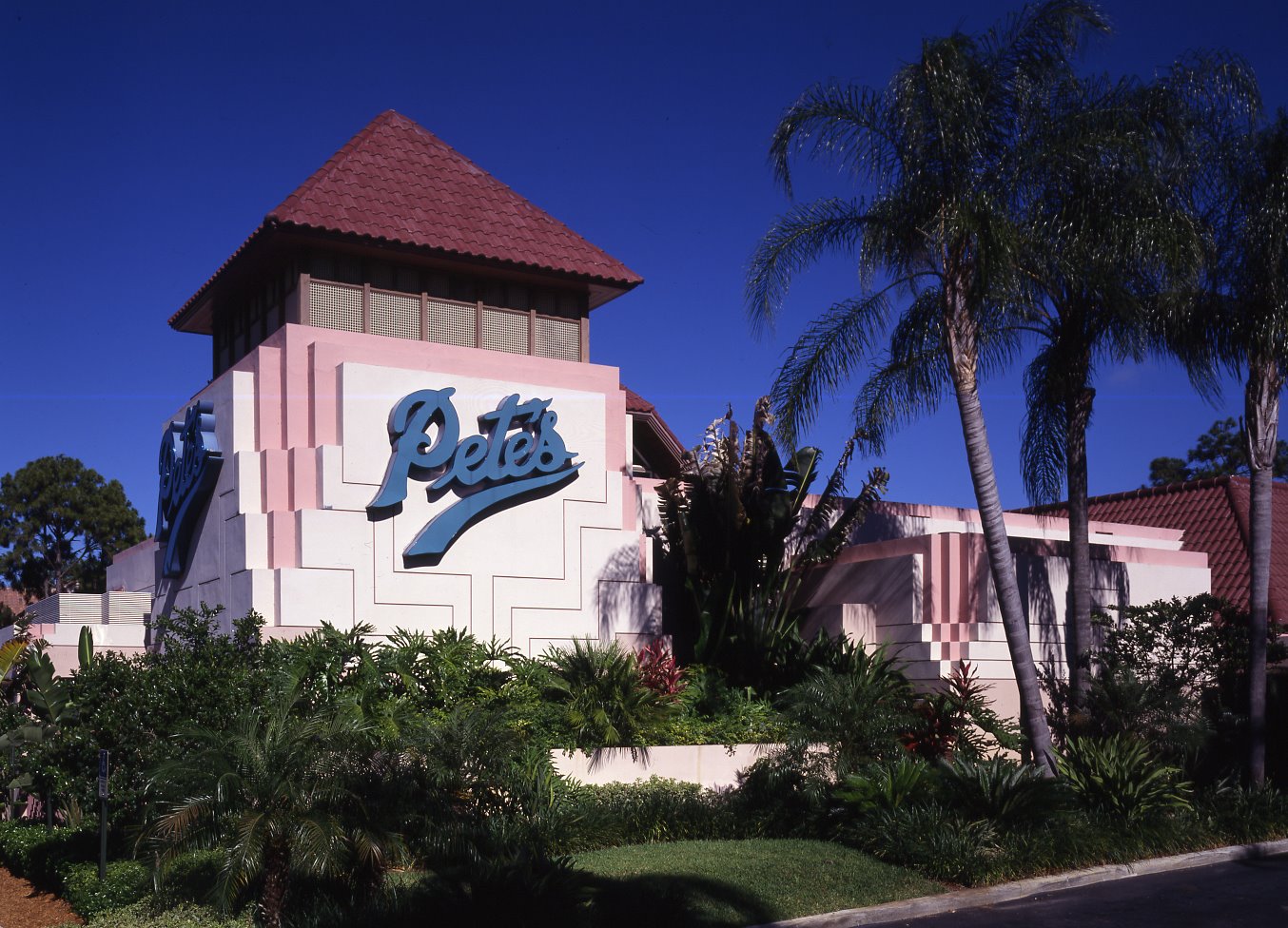 Pete's was originally the signature restaurant anchor in a mixed use center that included a major hotel, an office building, partly occupied by the center's developer, Arvida Realty, and a retail center that included several smaller restaurants. All were configured around a lake. In this kind of development there are no individual lot lines or setbacks so we were able to build right in the water. Construction was concurrent with the lake and the other buildings.