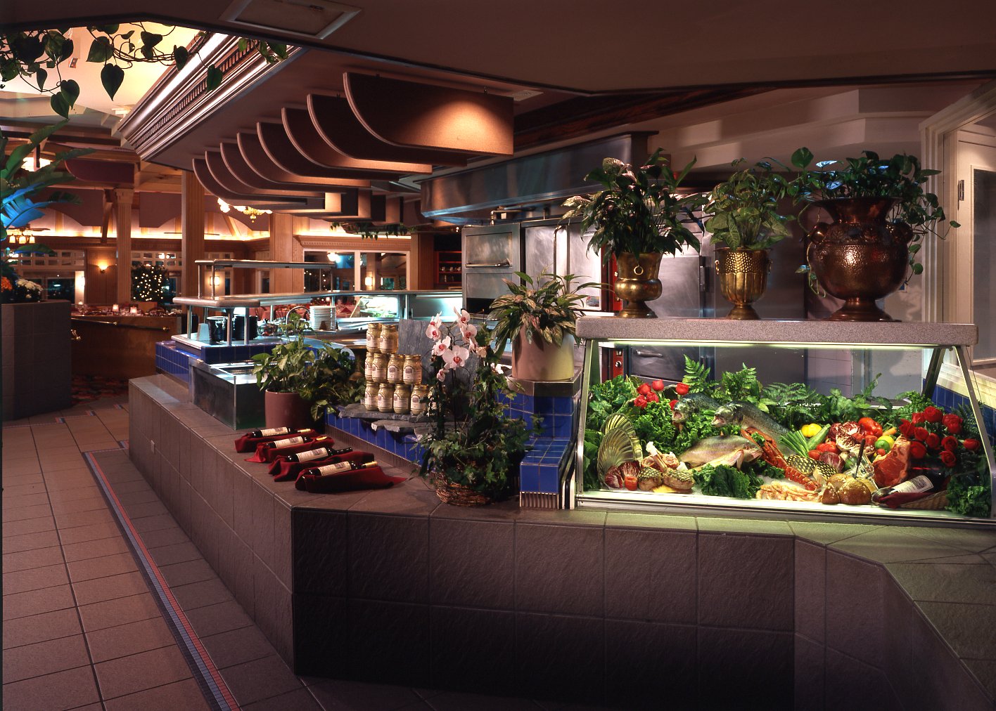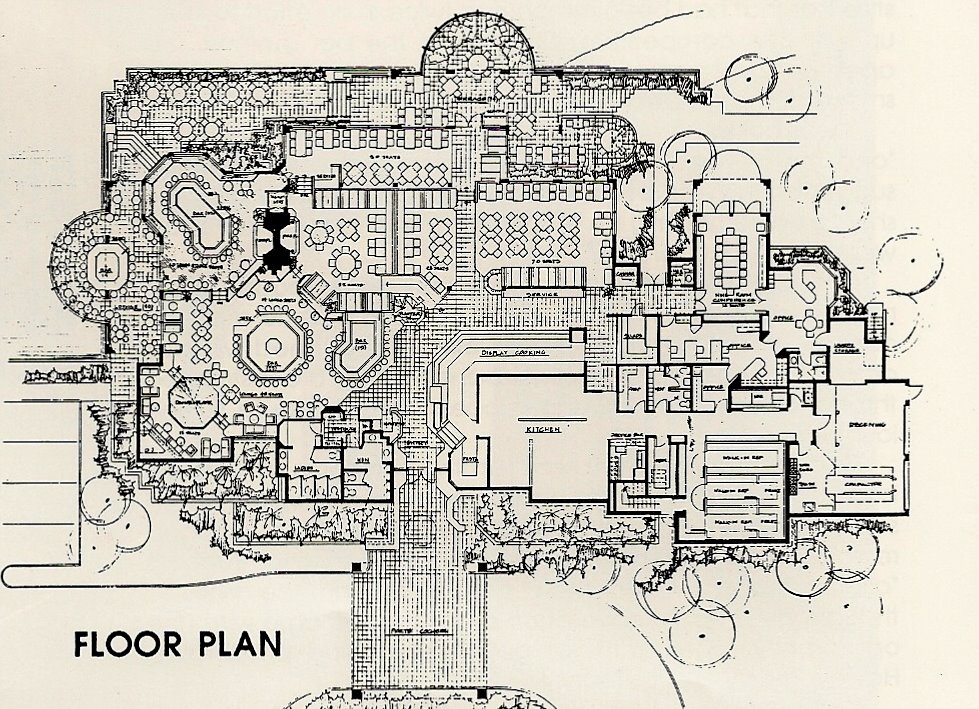 The floor plan shown here represents the original design and does not reveal ten years of additions and constant changes and improvements, especially in the area of banquets. The last one was a complete interior/exterior change of colors, bleached oak changed to Mahogany color, floor coverings and chairs/barstools were updated, etc. etc.