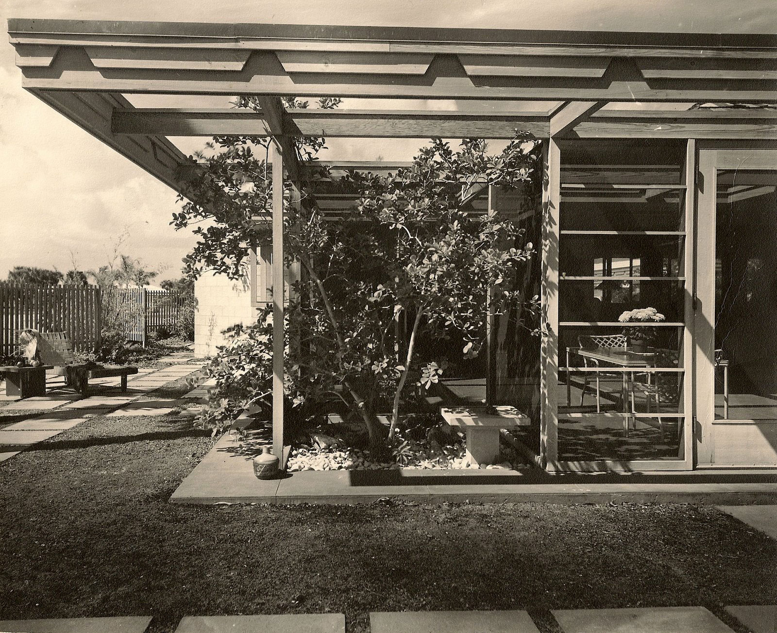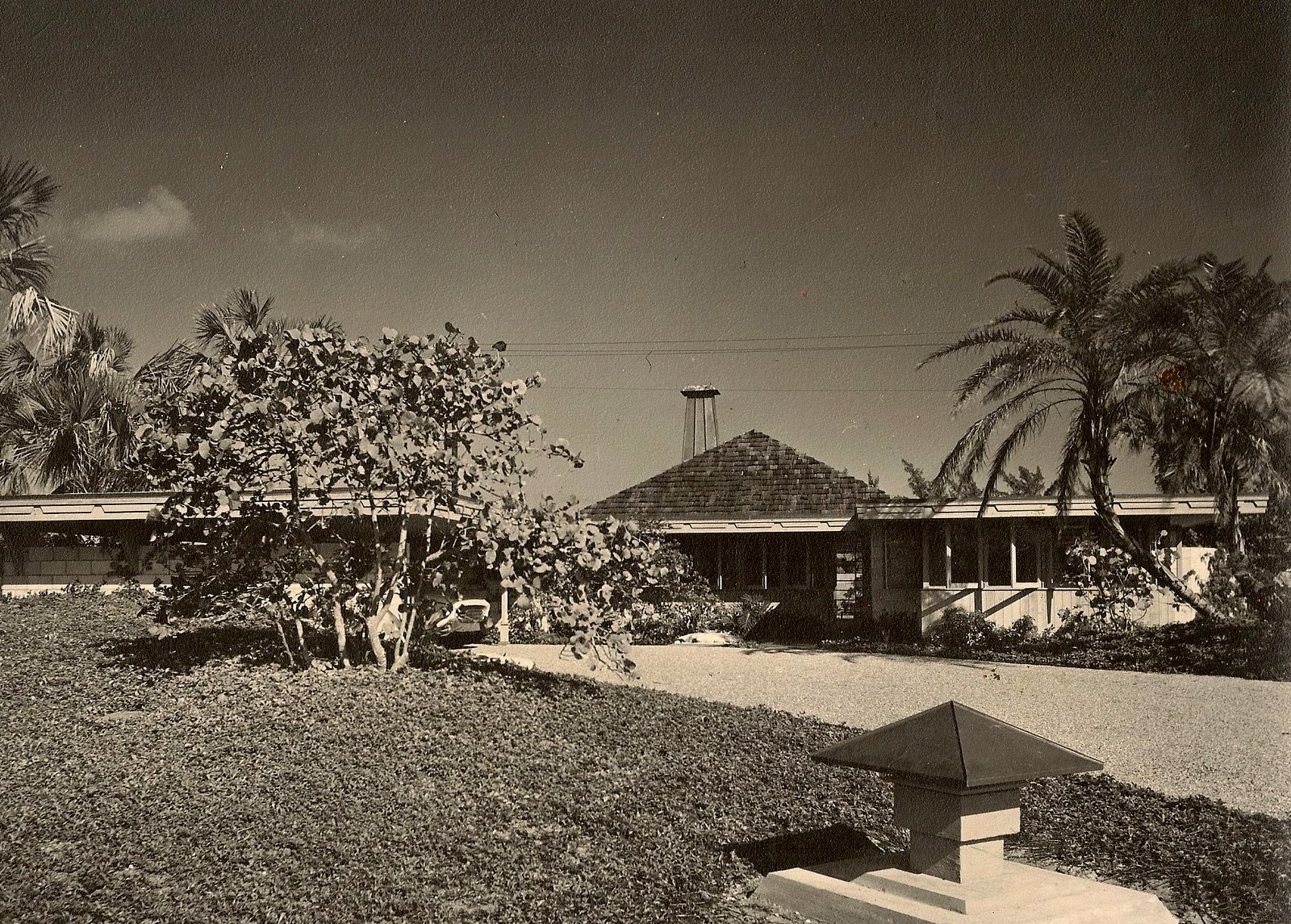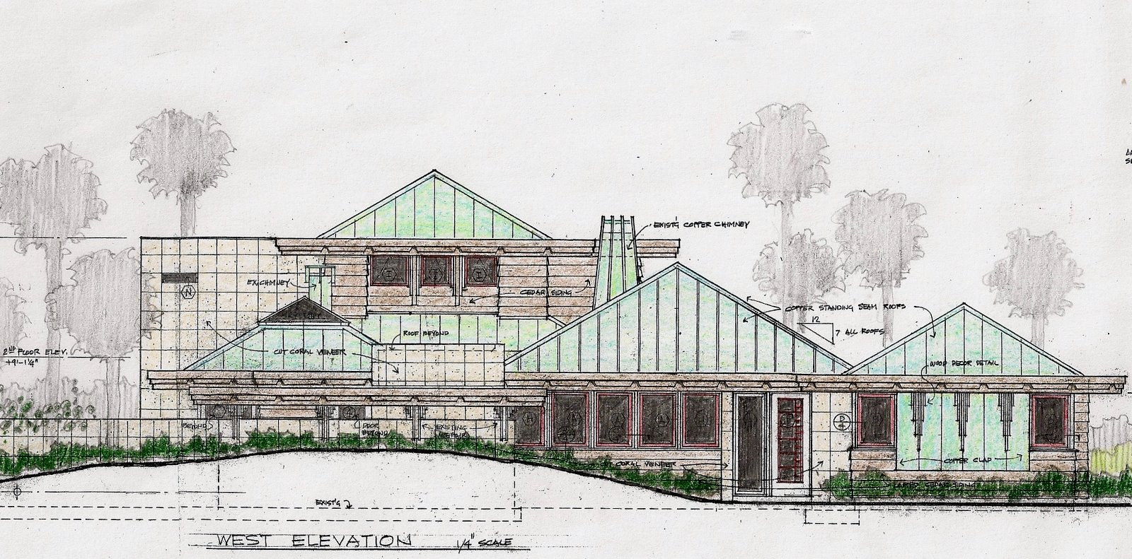 In 1999 additions and alterations were designed for a subsequent owner which significantly increased the size and character of the "cottage". A second floor master bedroom suite was added, multiple copper clad pyramid roofs defined individual spaces and block walls were clad in cut coral stone. Unfortunately the project was abandoned.