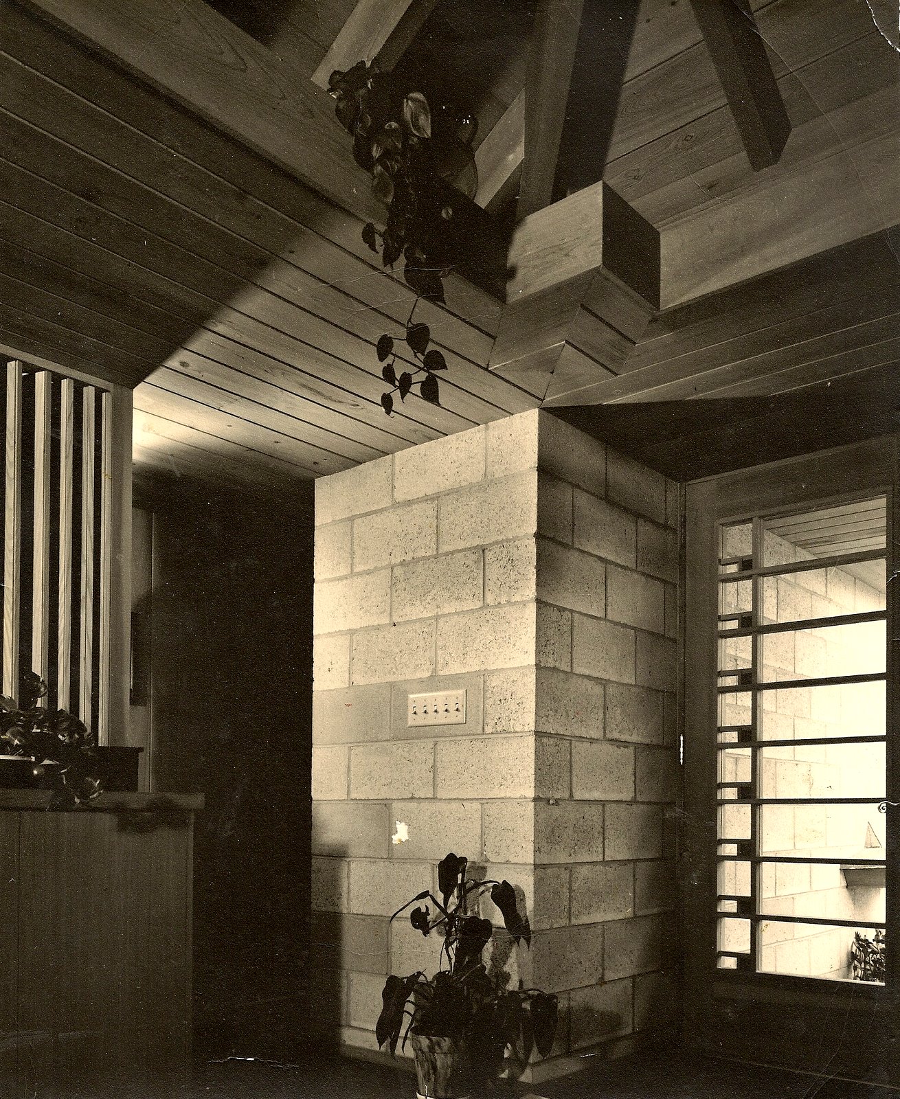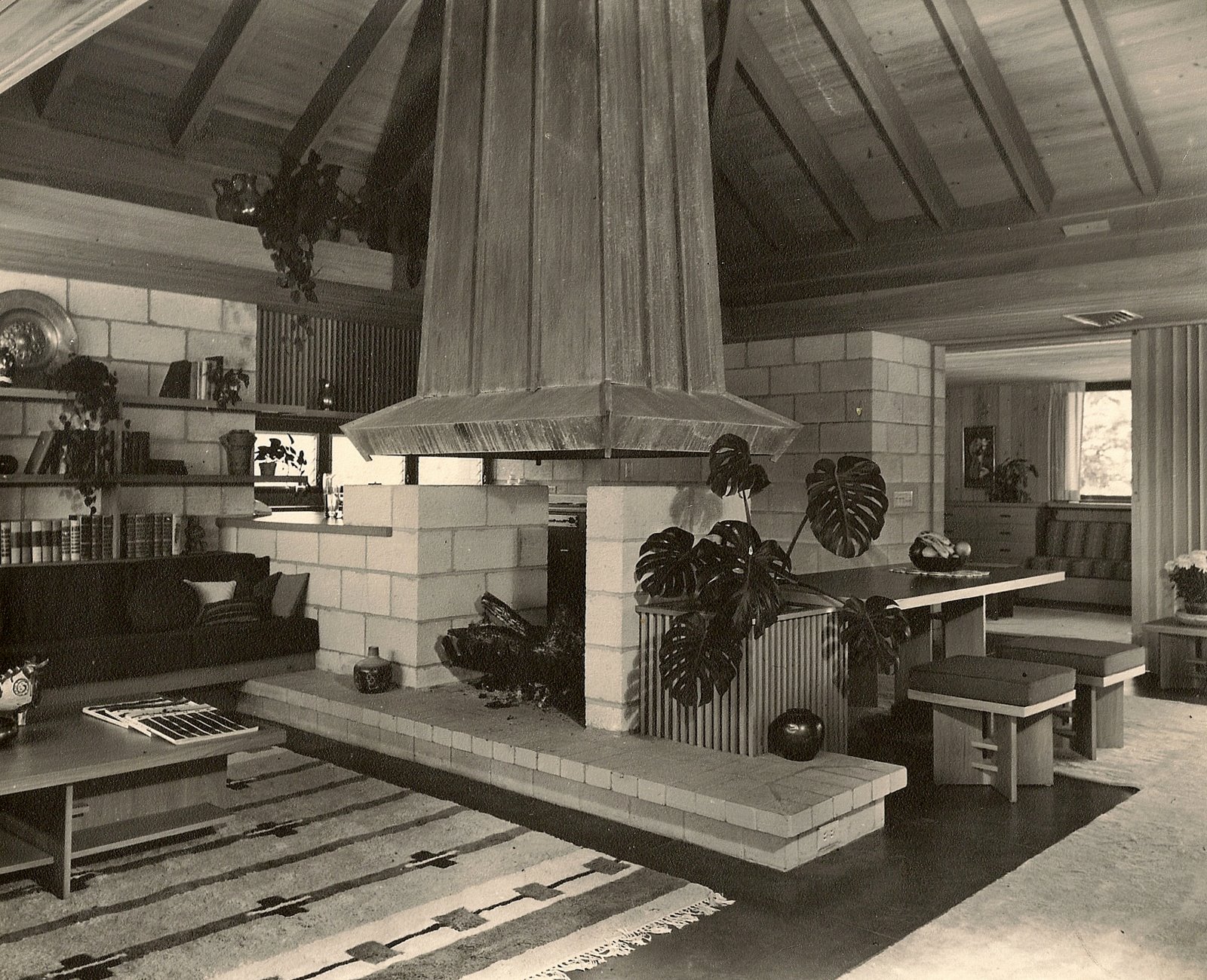 Materials were simple and natural: exposed concrete block, Fir beams, Cypress paneling, cabinets and built-ins, stained concrete floor and patina copper fireplace hood and chimney. Wood casement windows were made by the carpenters on the job.