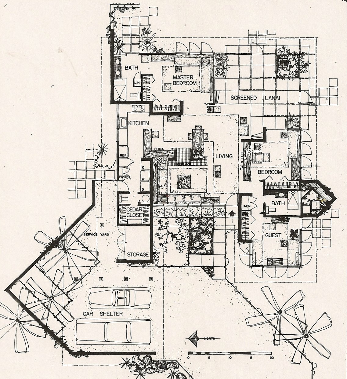 This small house was almost completely open to the outside with windows and doors. It is close to the ocean and the clients loved the idea of living with ocean breezes. It is best described in feeling and scale as a cottage and has elements of quaintness as requested by the clients. It was my second house.