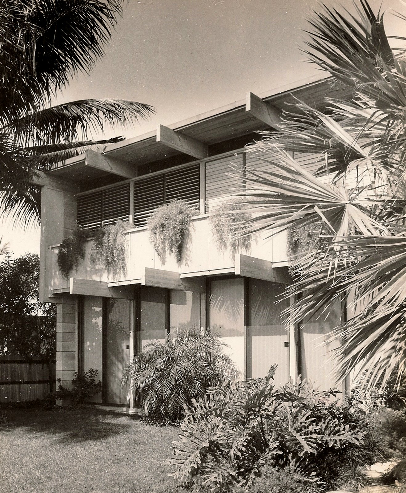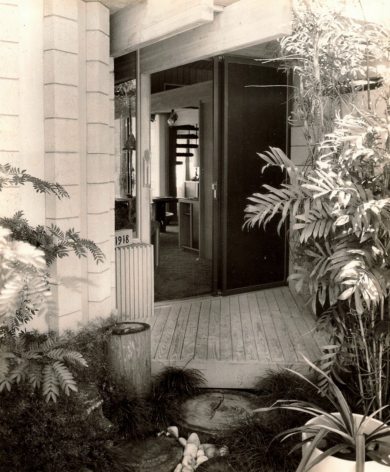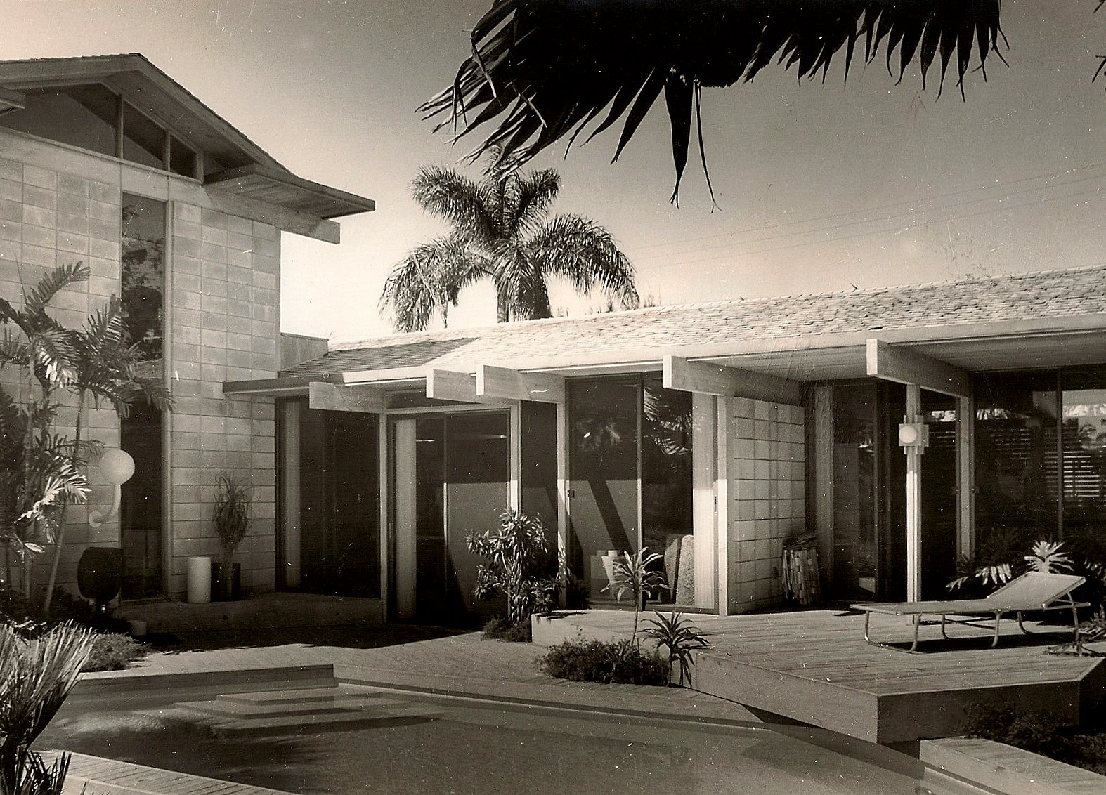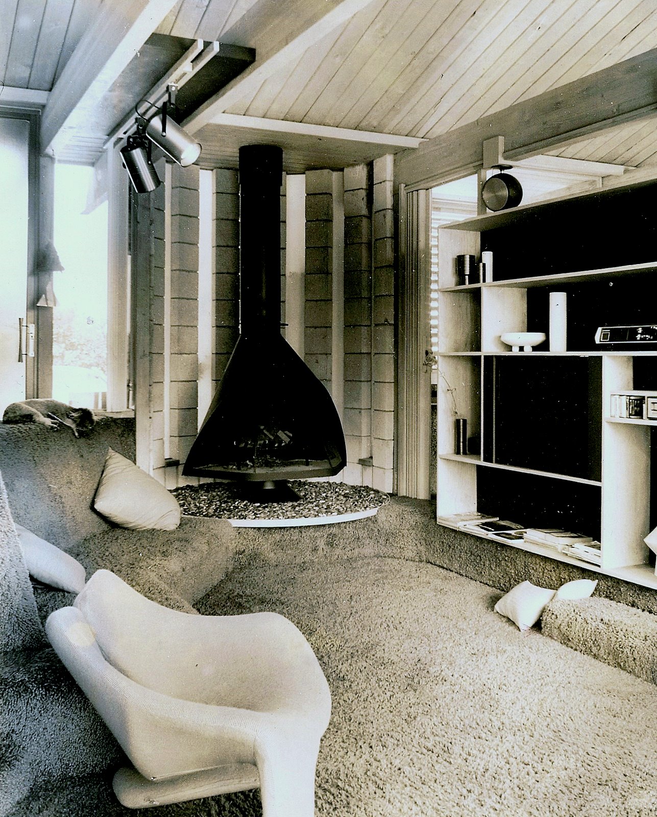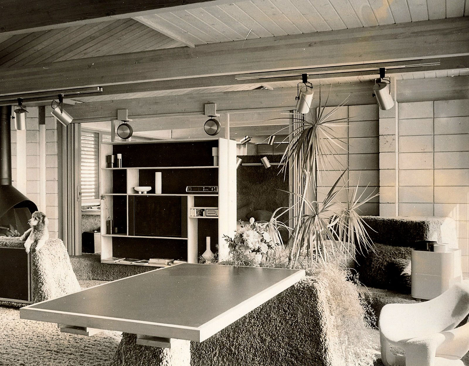 The color scheme was, in addition to grey cement block and bleached wood, black Formica accents and purple carpeting. The two story section was added during construction and had two bedrooms over a play room/gym.