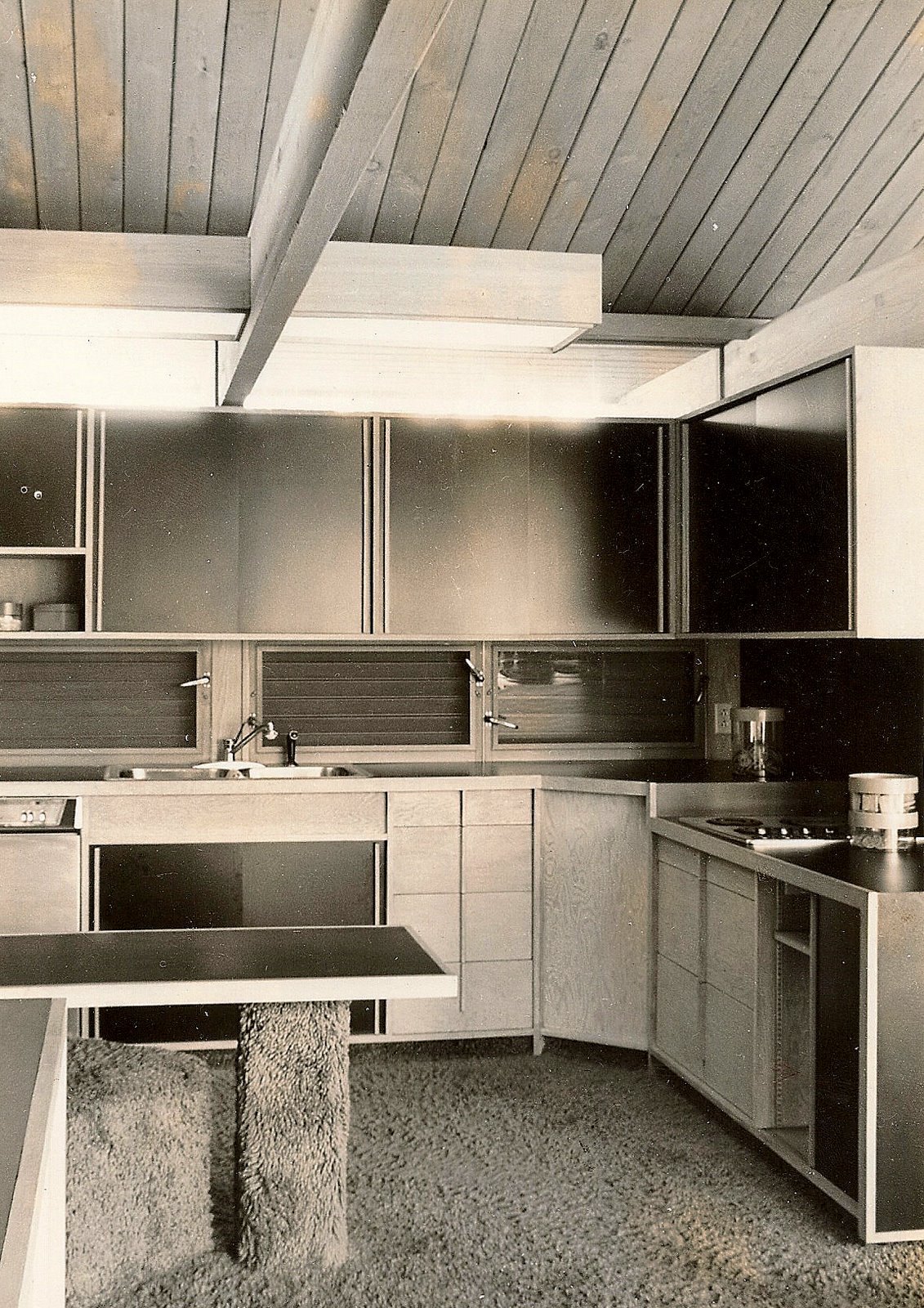 A small house on a very tight budget……Some of the cost cutting can be seen in the carpeted furniture and ¼" Masonite sliding doors in the cabinets, as well as the compact spaces.