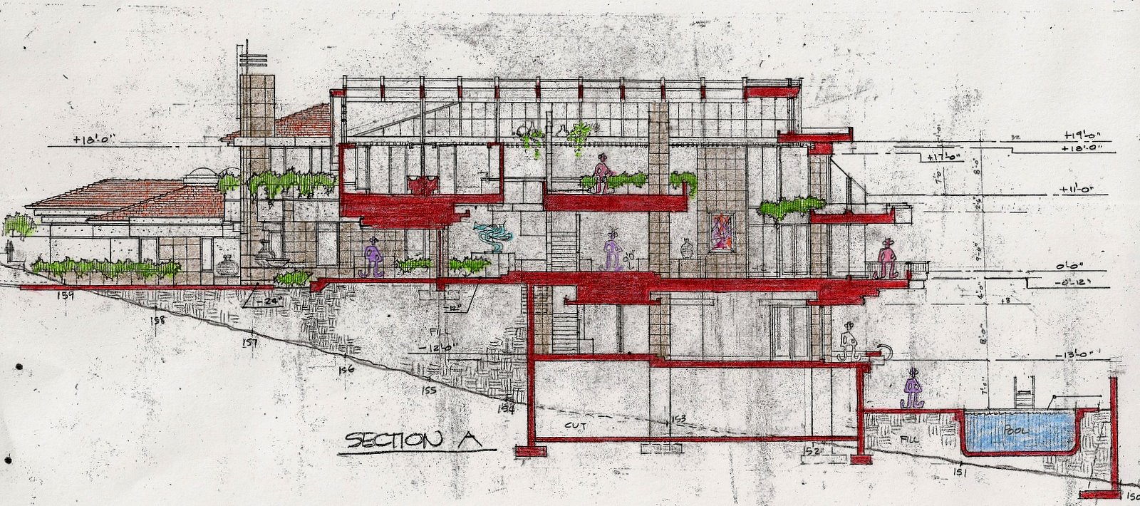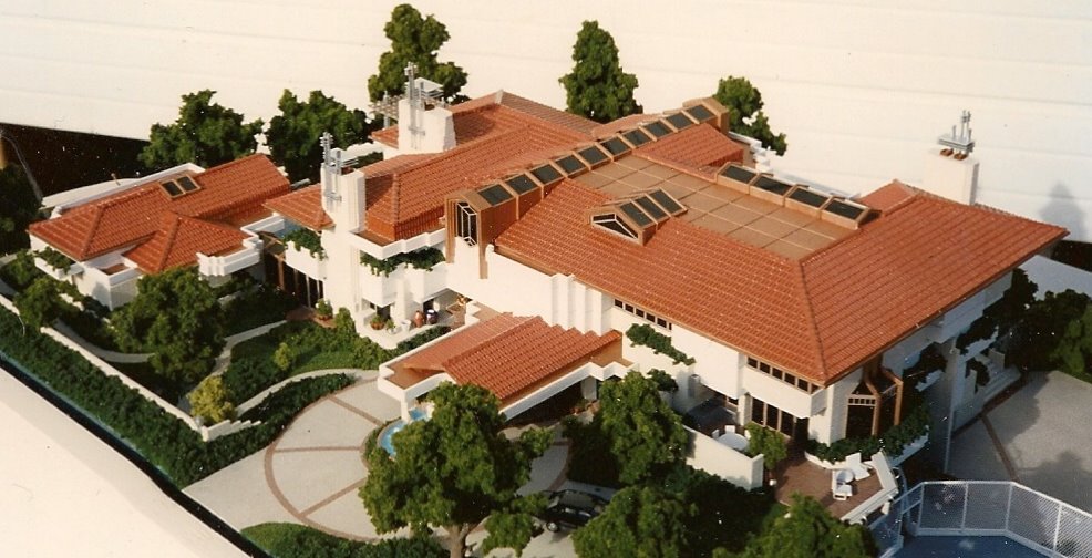 Materials were as follows…… crosscut Travertine on floors and vertical surfaces that originated in the ground…… white stucco on all horizontal surfaces…… red/brown glazed tile sloping roofs…… windows and doors, Mahogany outside/Cherry inside…… copper flat roofs and skylight framing.