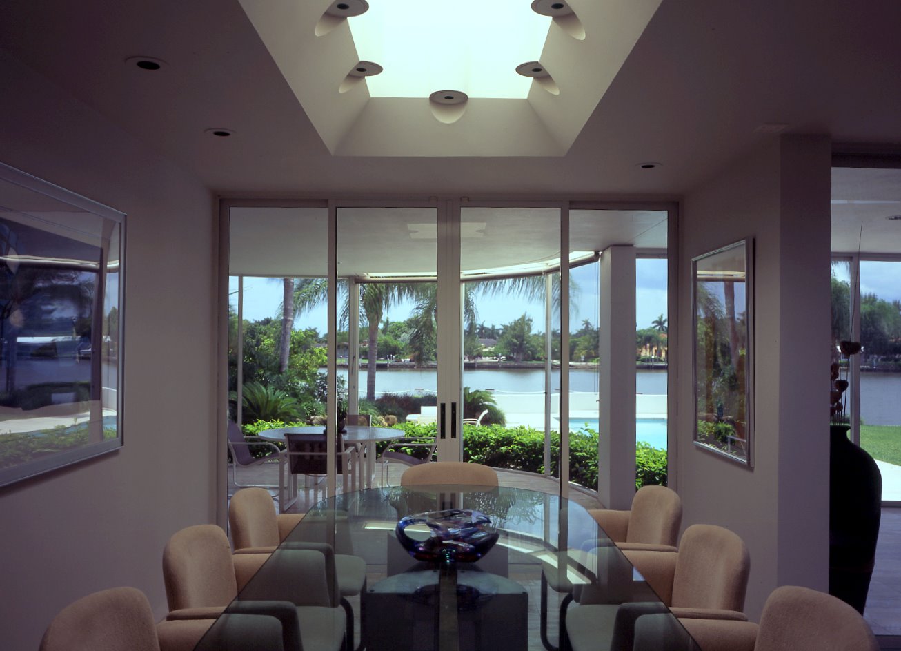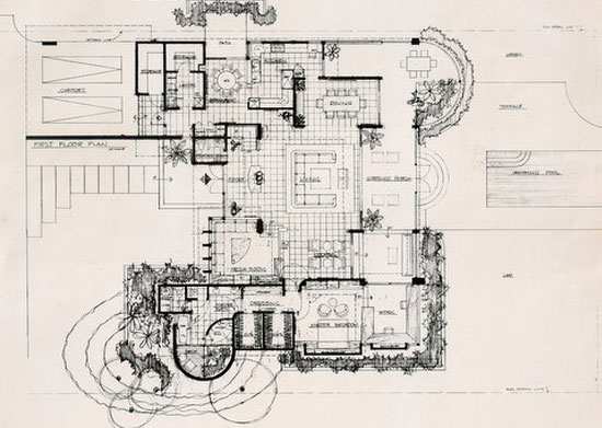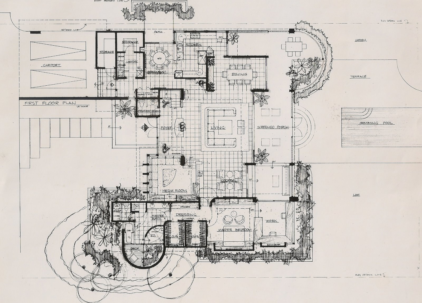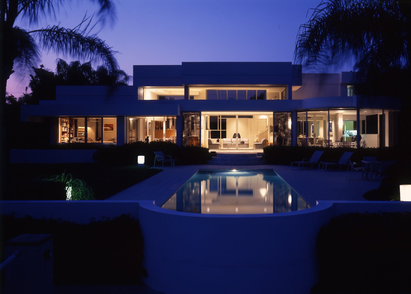 two story light filled space, flanked on one side by the master bedroom suite and on the other by the dining room, kitchen and service areas. A media room is tucked into one corner of the living room, up four steps and under a lower ceiling, creating an intimate area for TV, reading and listening to music. A long covered screened terrace orients all spaces to the swimming pool and to the lake view beyond. Two guest bedrooms are hidden on the second floor.